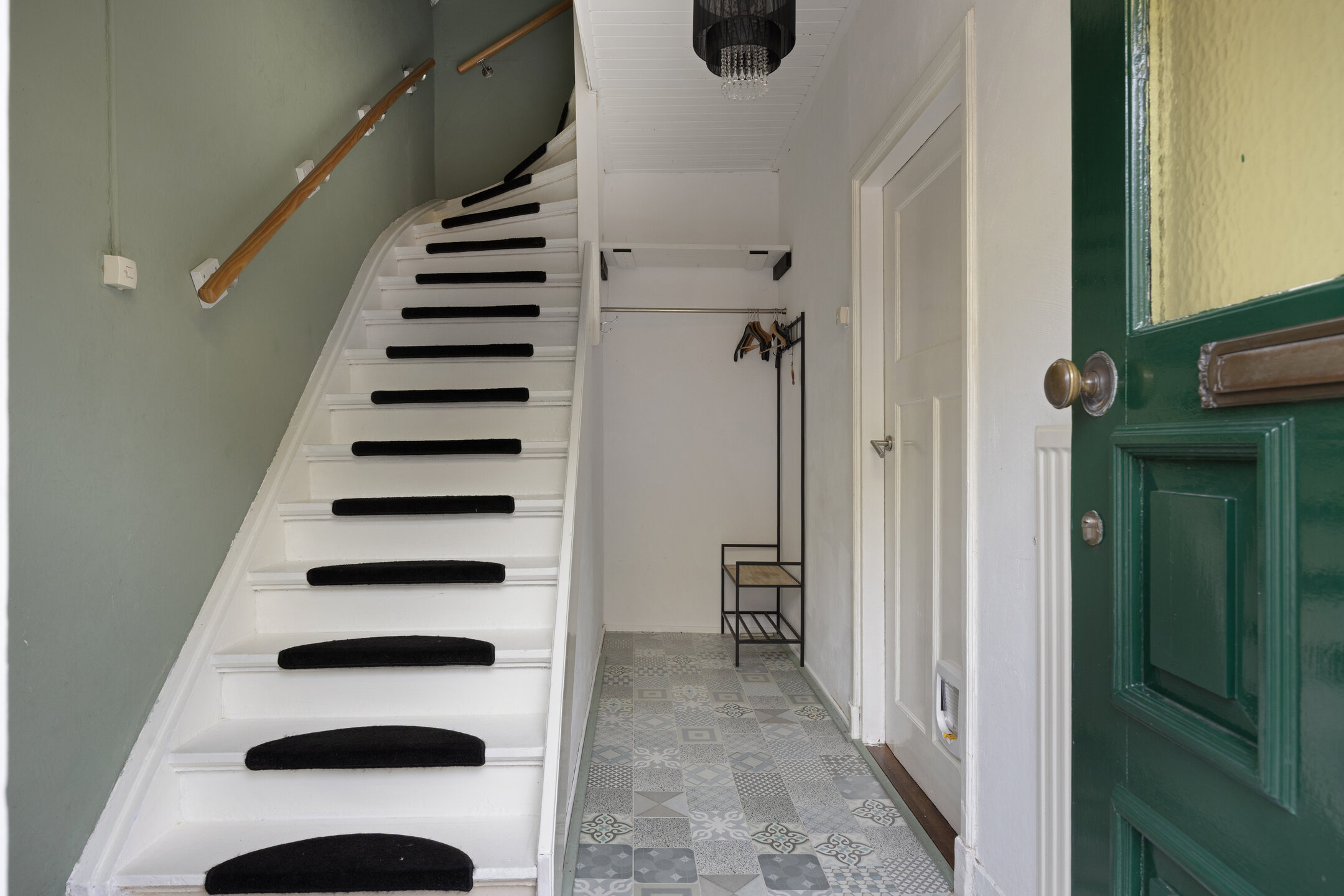 U komt binnen in de hal. De hal met de trapopgang naar de verdieping is afgewerkt met een laminaatvloer, stucwerk wanden en houten schroten plafond. Vanuit de hal is de woonkamer bereikbaar.