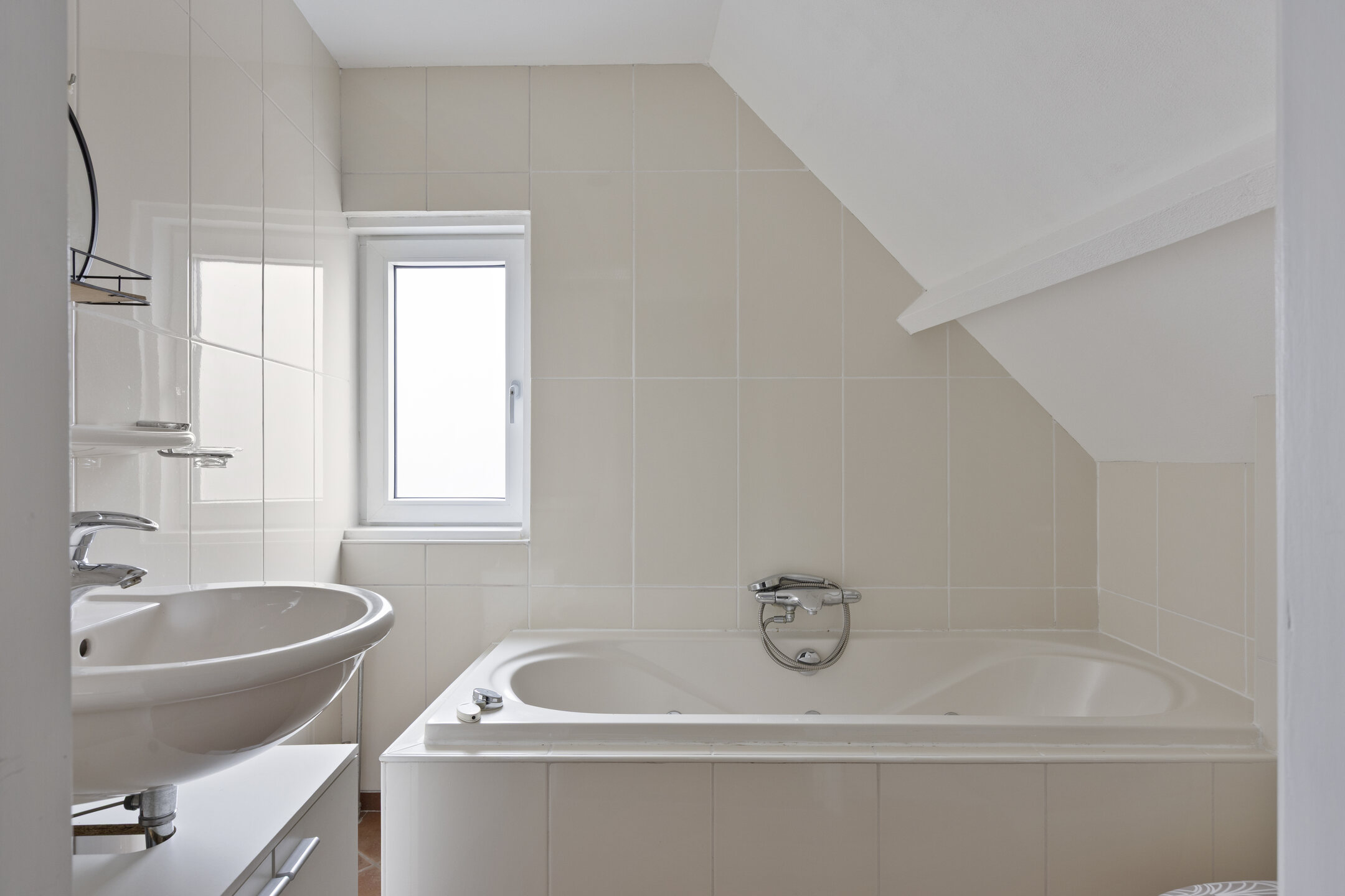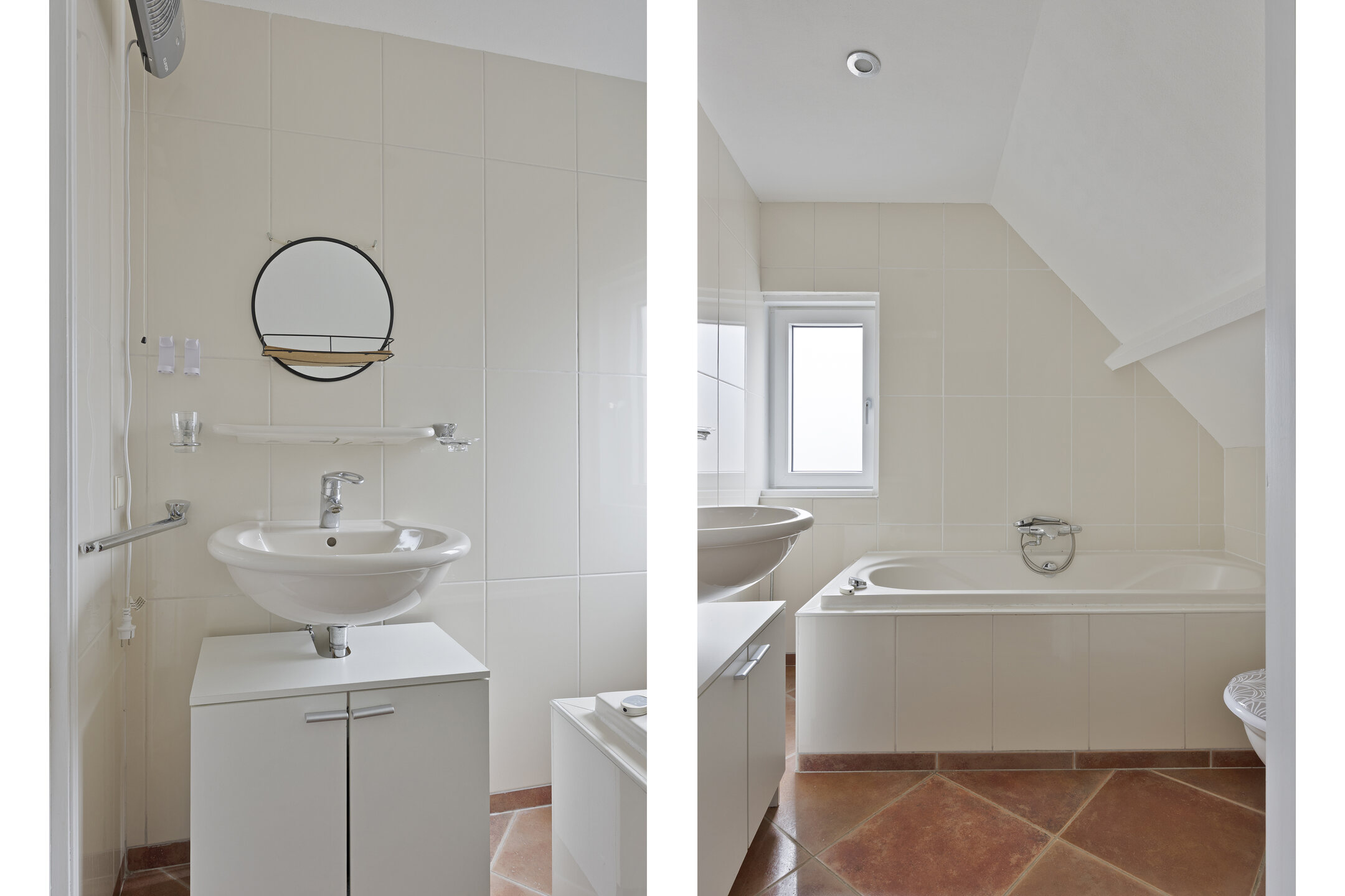 De badkamer is volledig betegeld en uitgerust met een ligbad met thermostaatkraan, wastafel, wandcloset en elektrische heater.