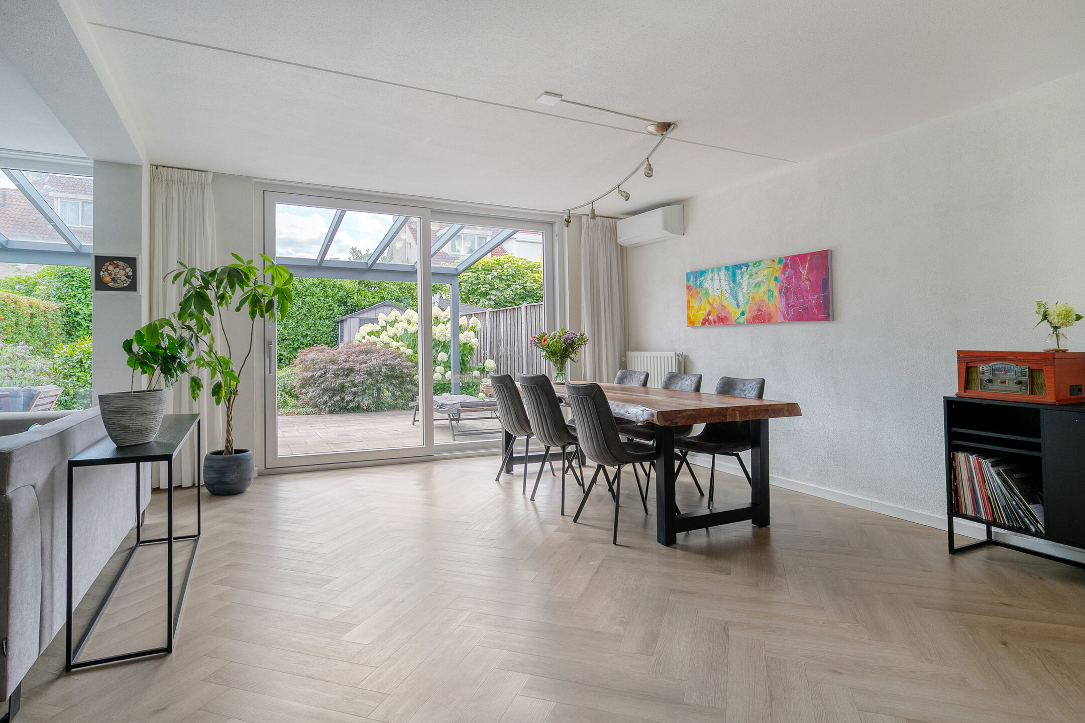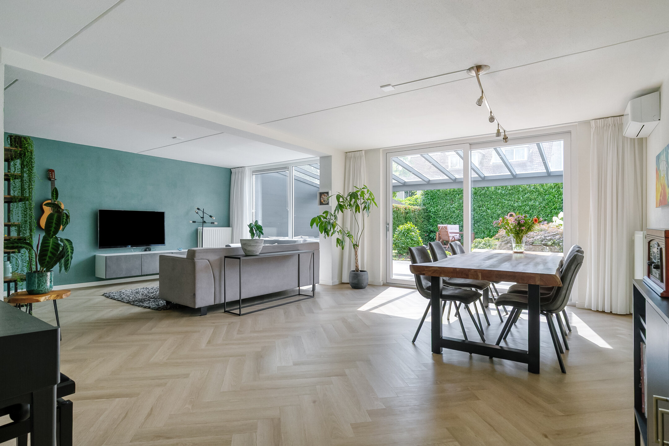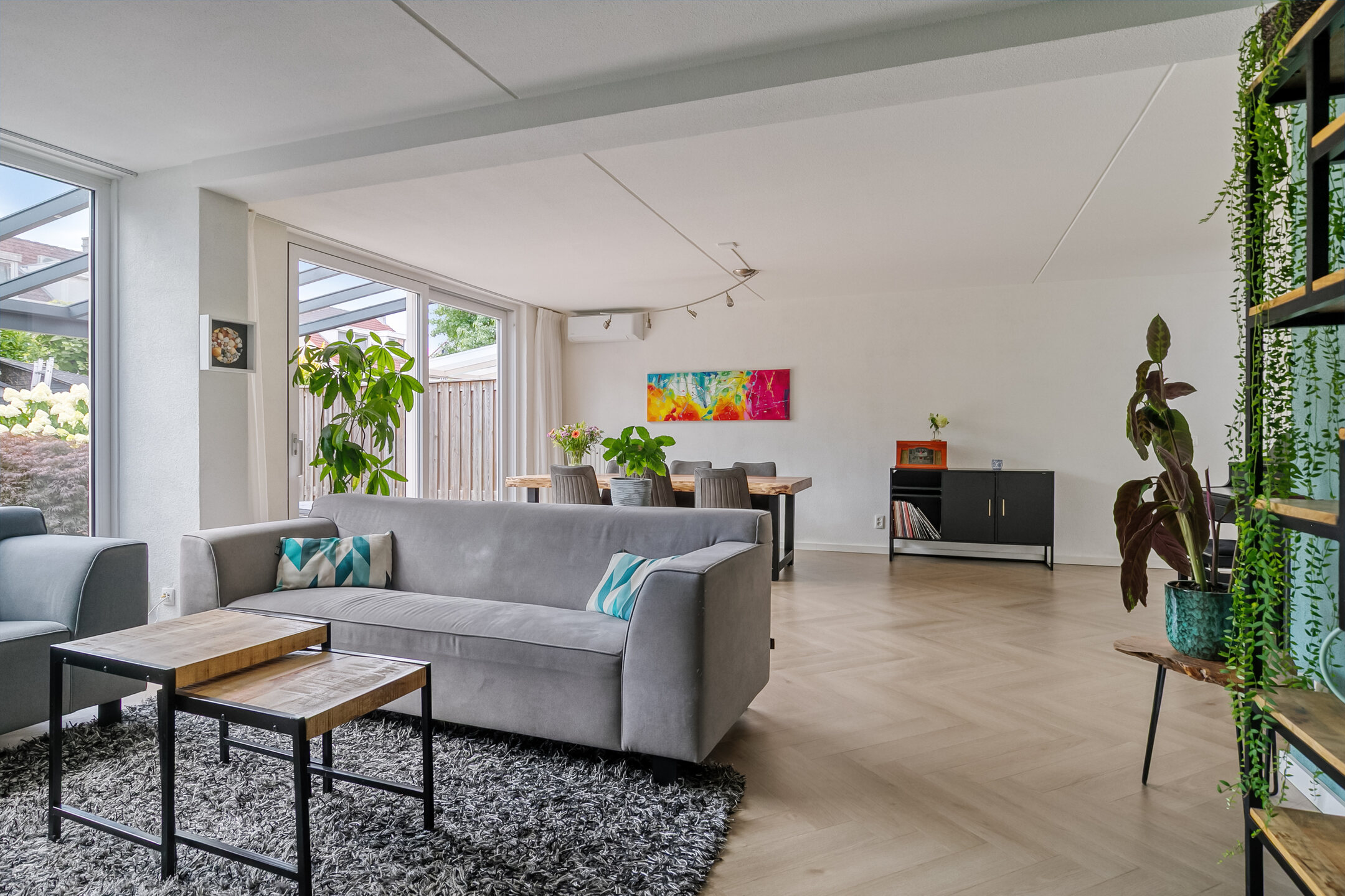 De woonkamer is gelegen aan de achterzijde over de volle breedte van de woning en is voorzien van airconditioning (2022), heeft veel lichtinval door de grote raampartijen en schuifpui aan de achterzijde en is afgewerkt met spachelputz wanden en spuitwerk plafond.