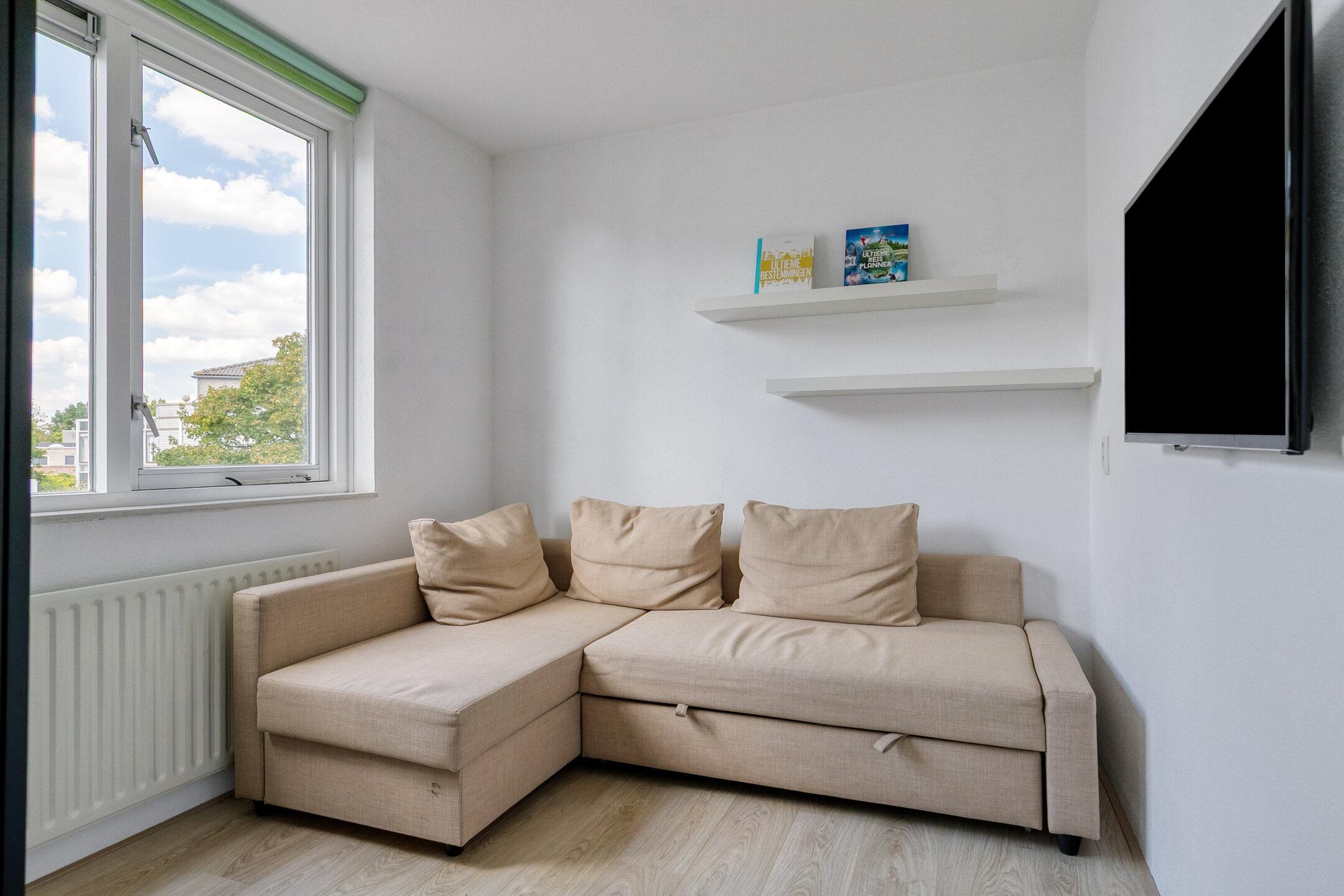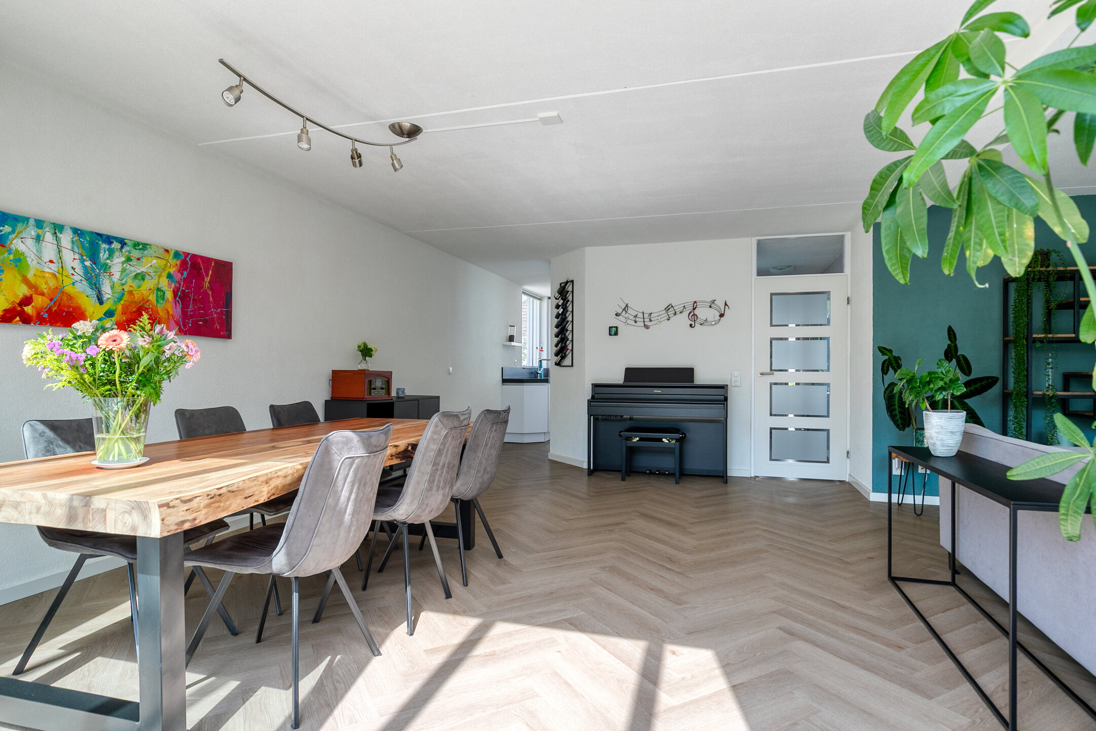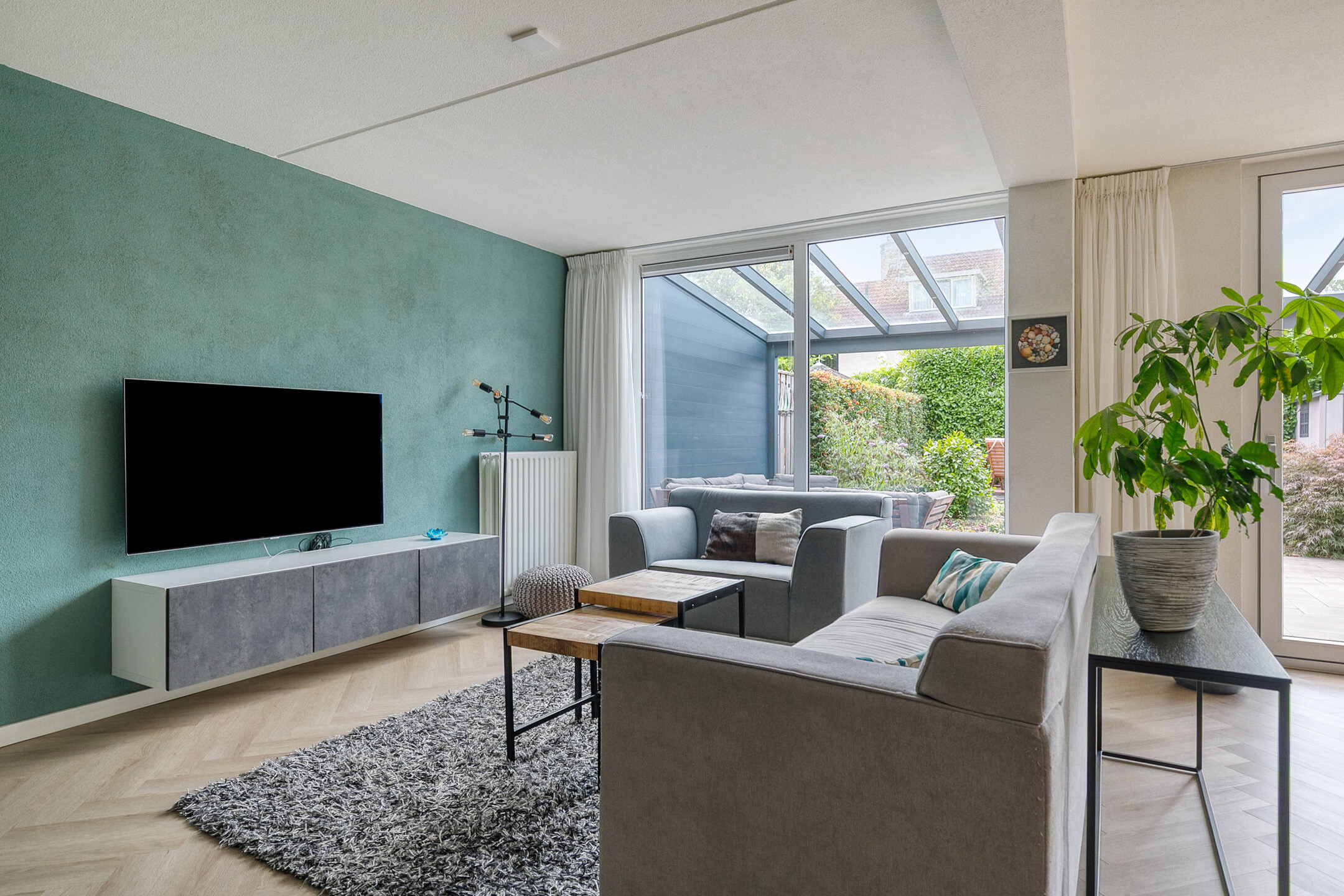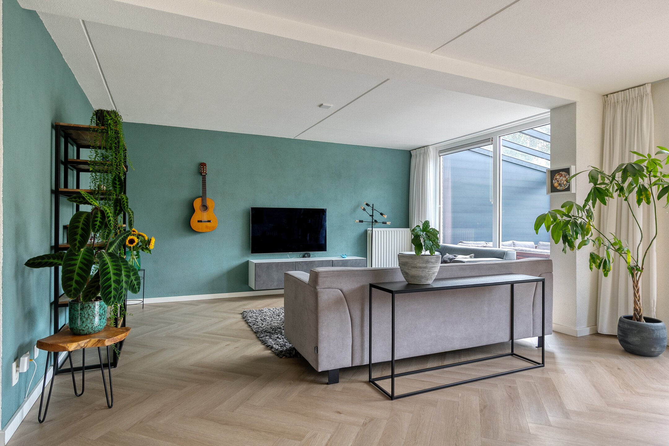 De woonkamer is gelegen aan de achterzijde over de volle breedte van de woning en is voorzien van airconditioning (2022), heeft veel lichtinval door de grote raampartijen en schuifpui aan de achterzijde en is afgewerkt met spachelputz wanden en spuitwerk plafond.