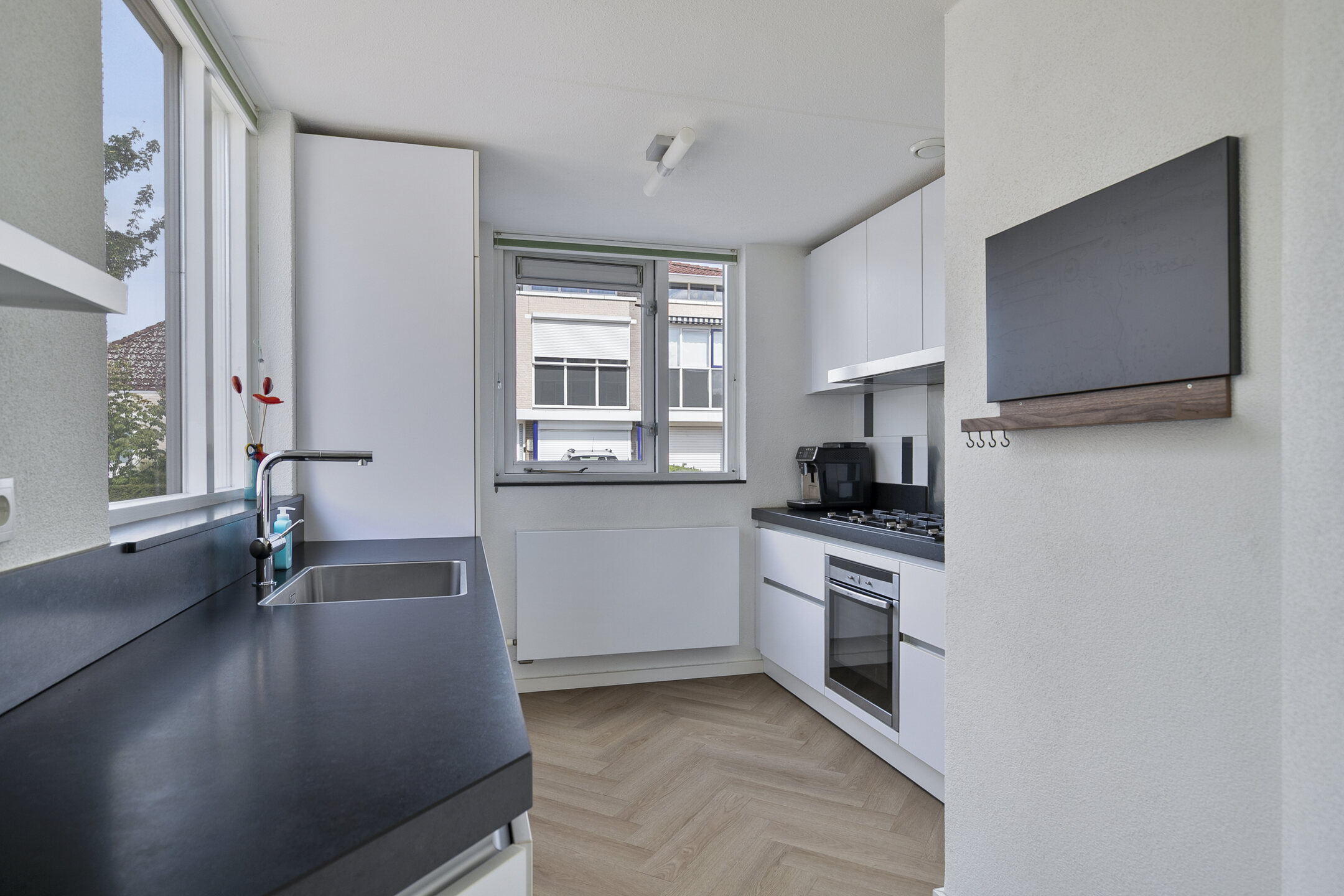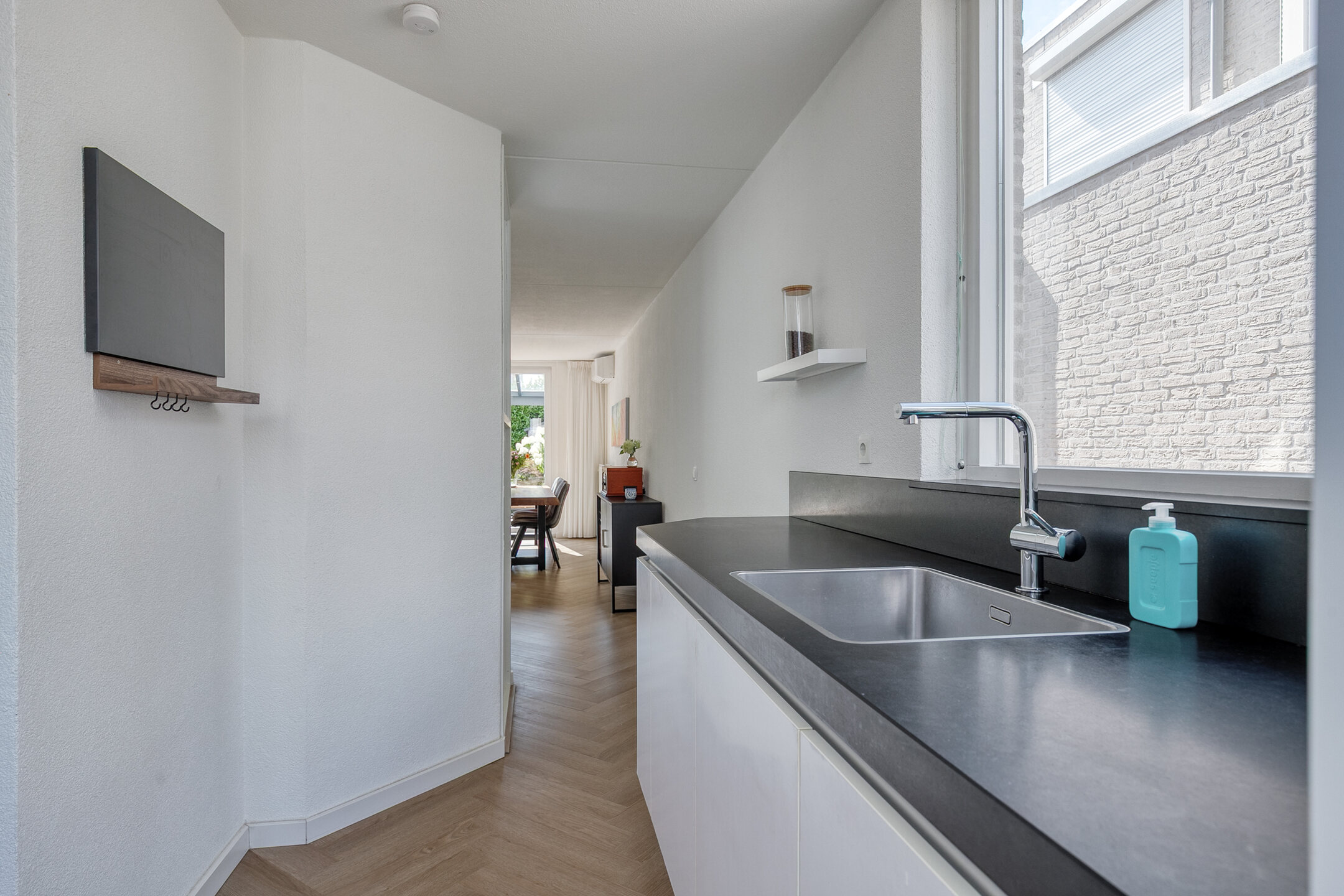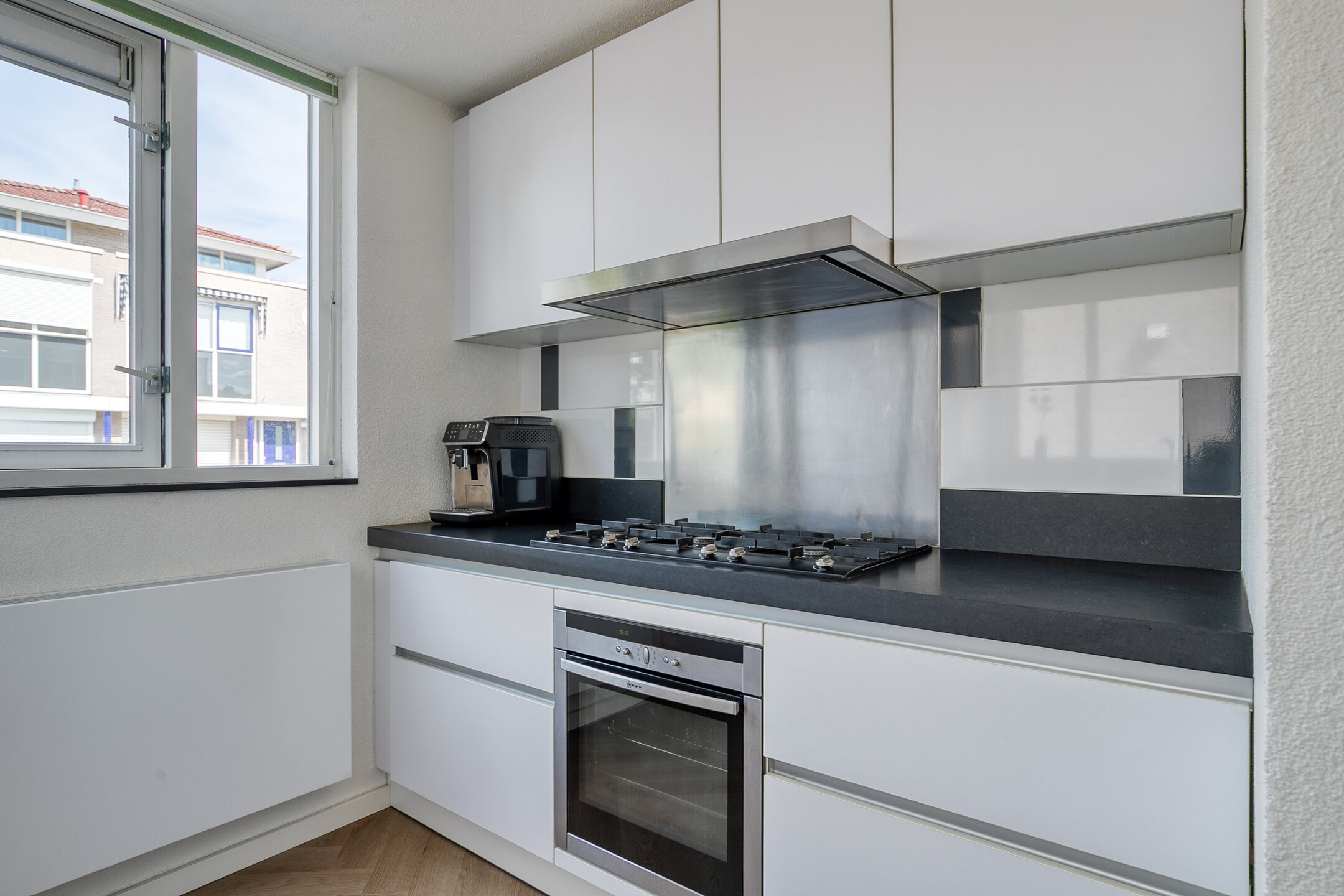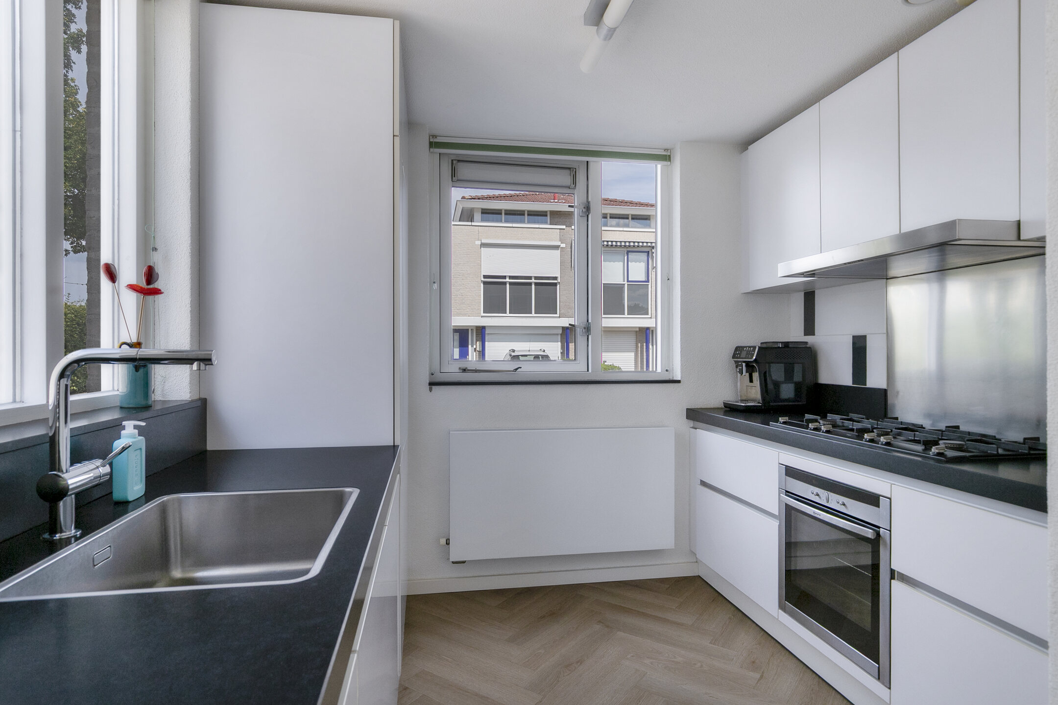 Het meubel is geplaatst in een dubbele wandopstelling met onder- en bovenkasten en voorzien van een composiet werkblad met spoelbak. De keuken is uitgerust met de volgende inbouwapparatuur: gaskookplaat, afzuigkap, koelkast, diepvries, vaatwasser en oven. In de keuken bevindt zich tevens nog een praktische trapkast.