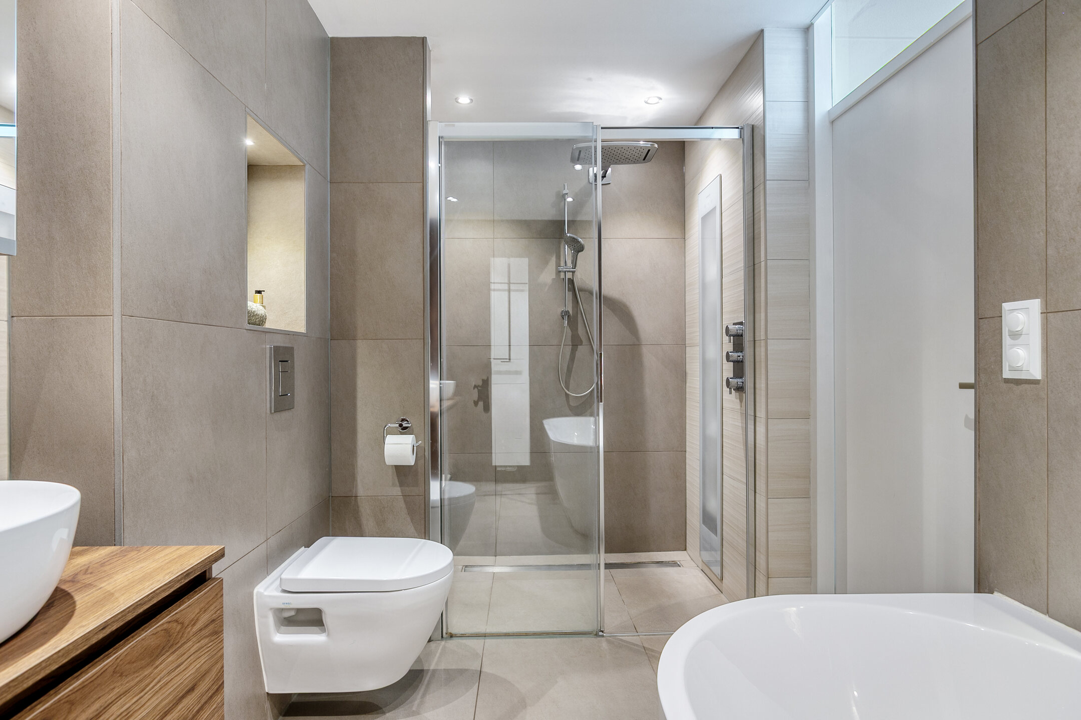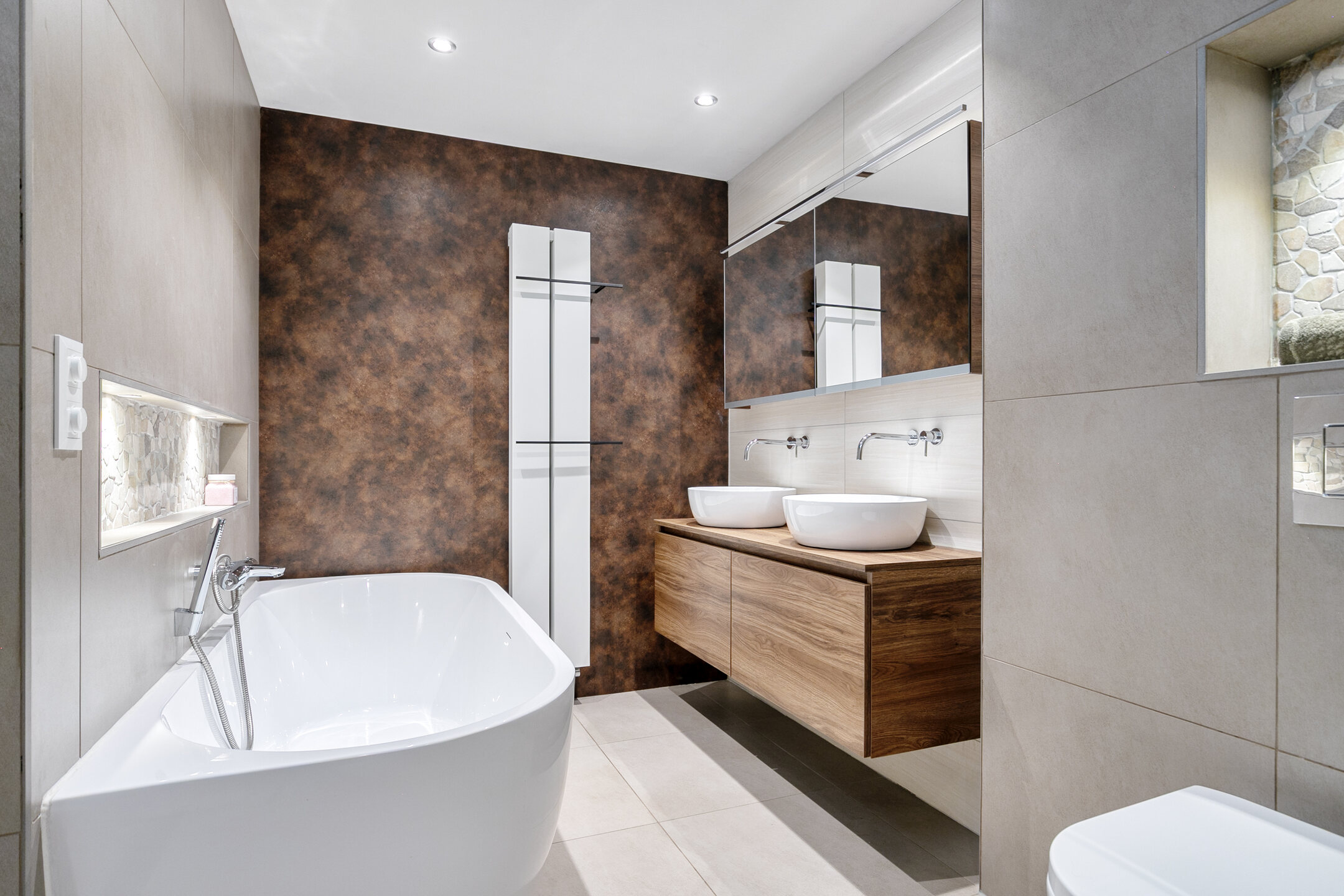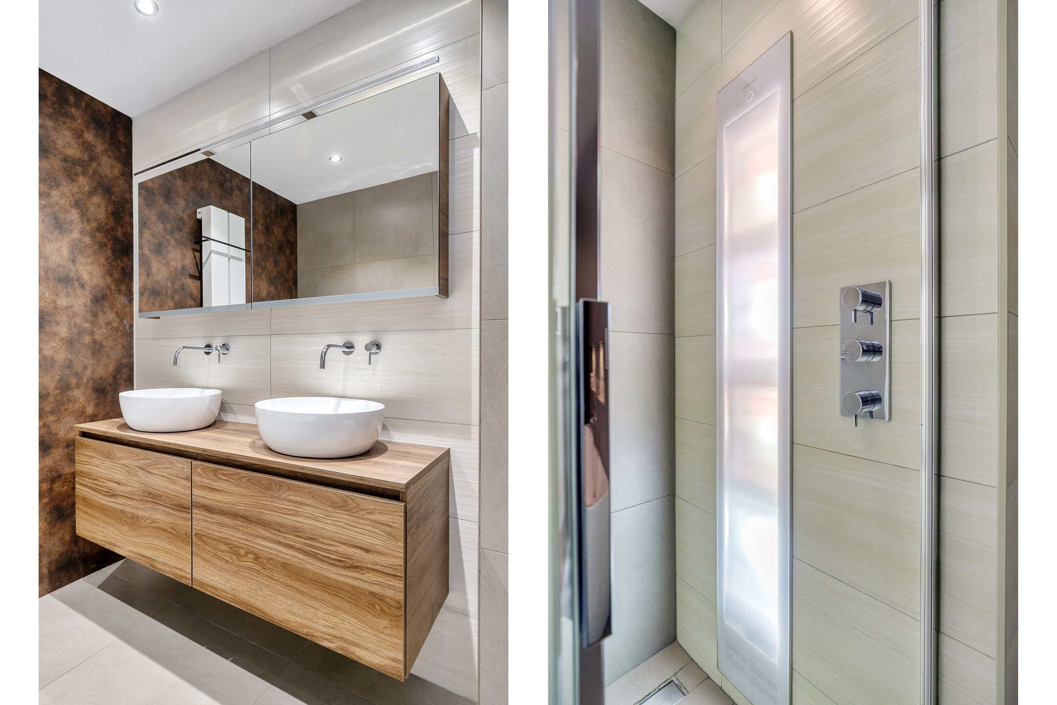 De badkamer is volledig betegeld en uitgerust met een ligbad met thermostaatkraan, inloopdouche met rainshower, sunshower en thermostaatkraan, dubbele wastafel in meubel, wandcloset en design radiator.