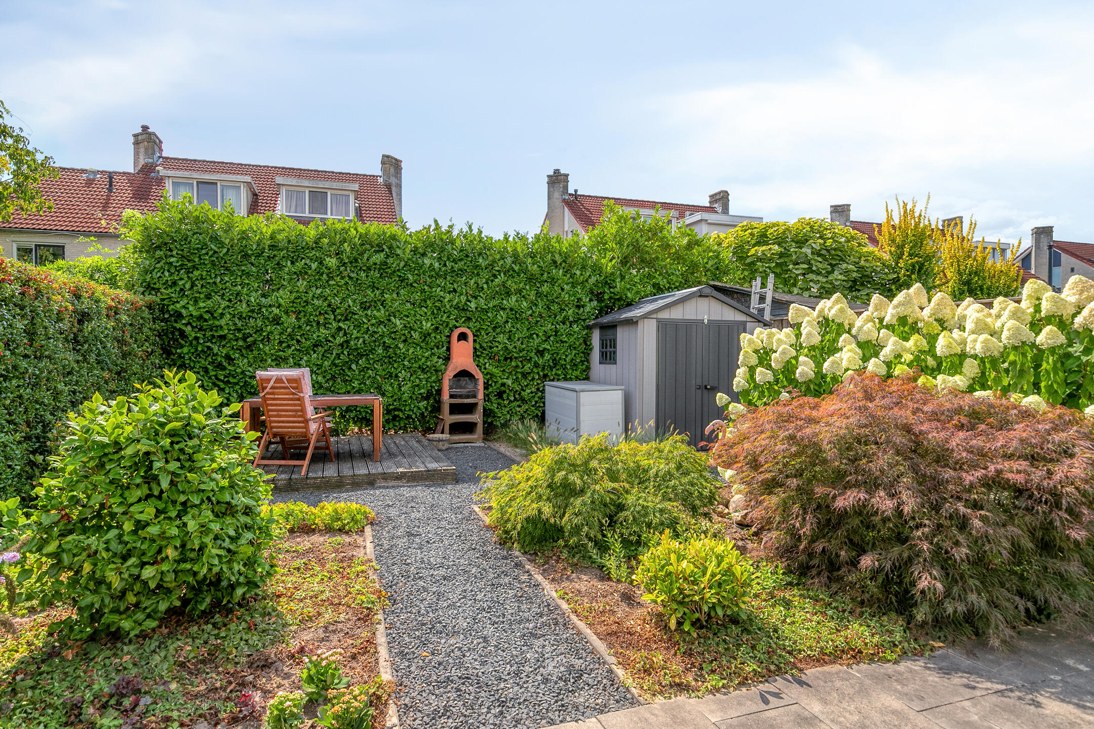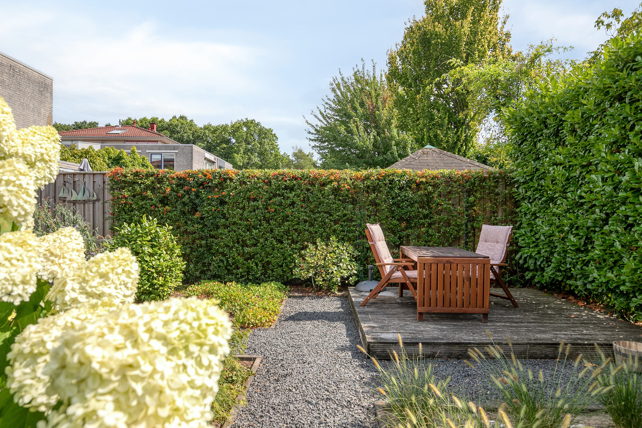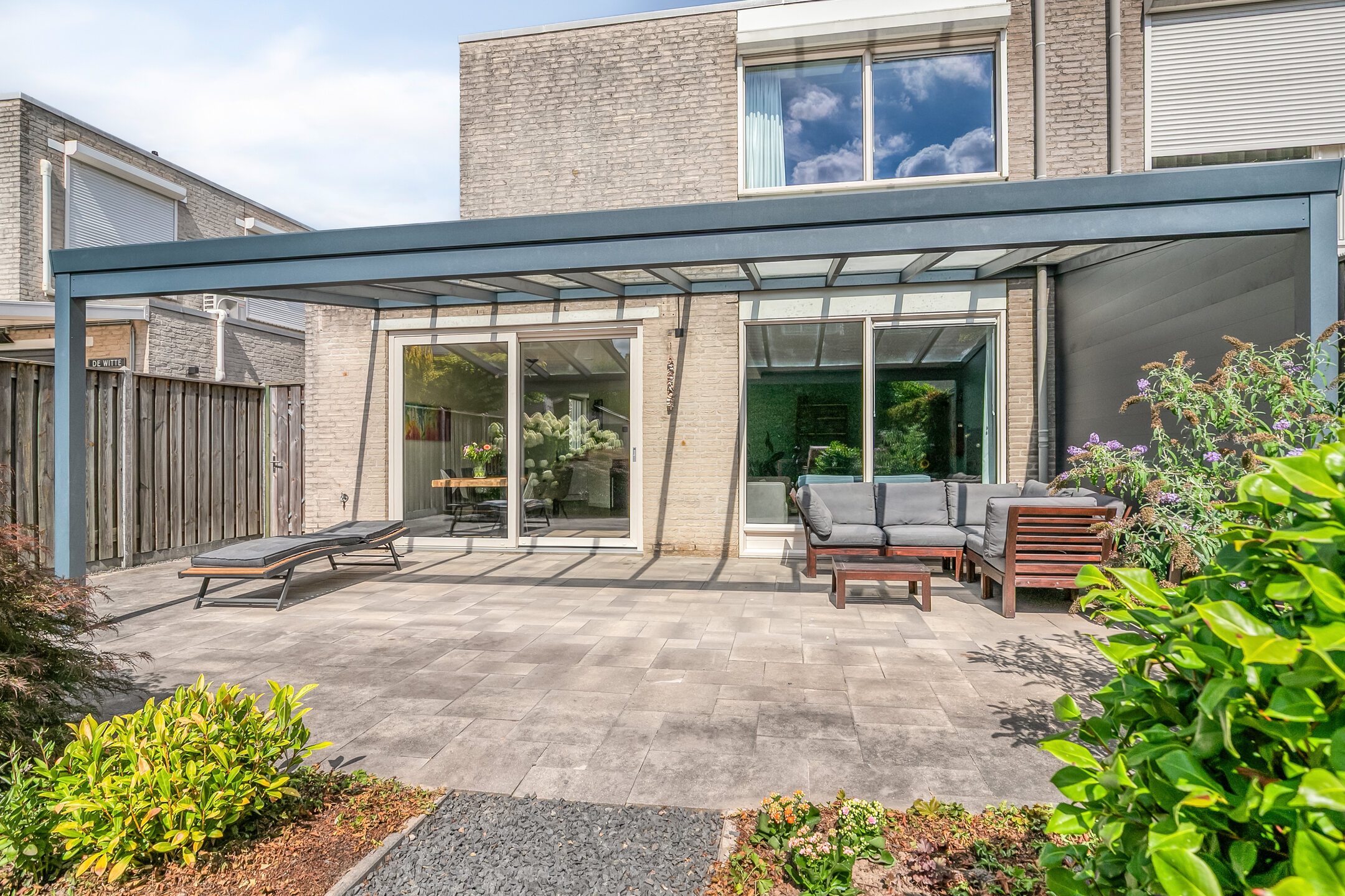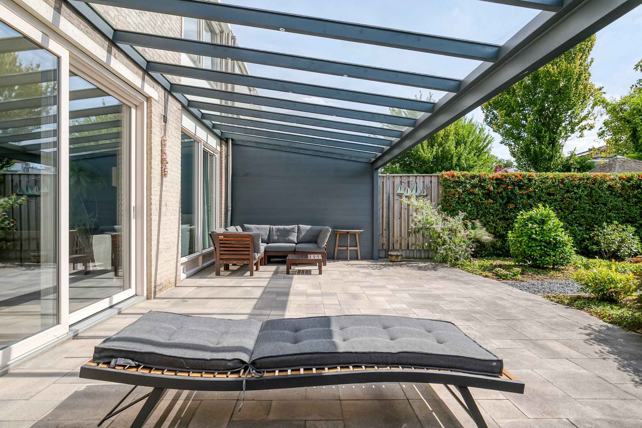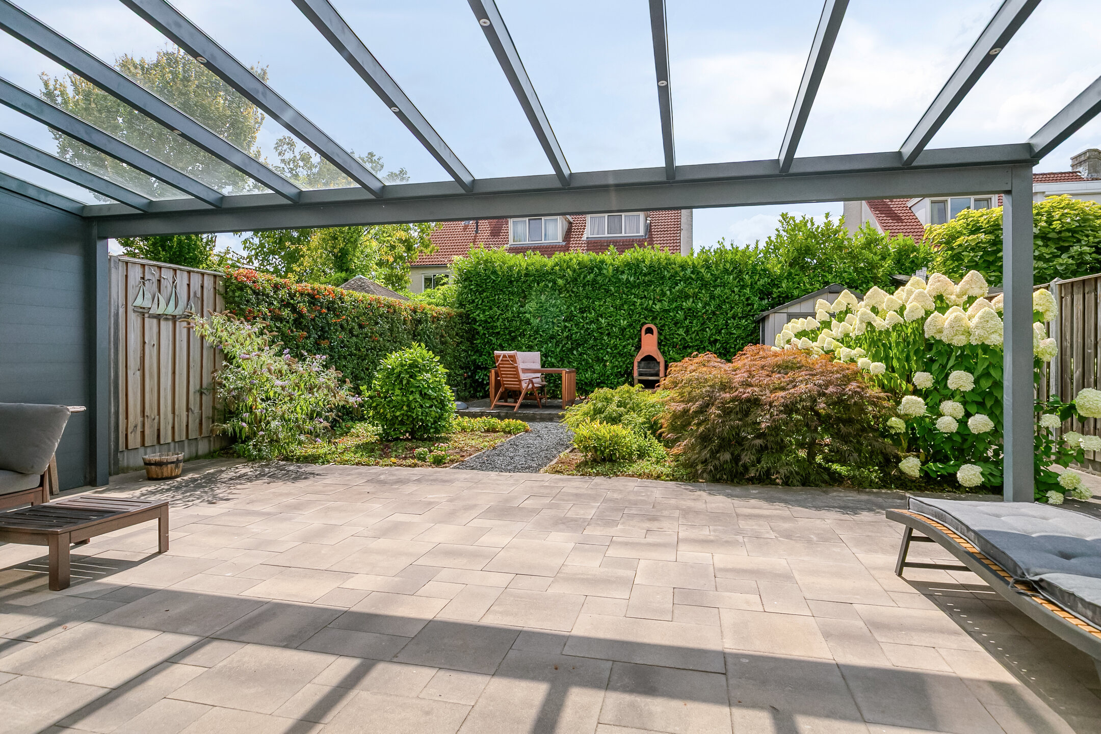 De verzorgde achtertuin, gelegen op het zuidwesten is voorzien van bestrating, beplanting, tuinhuis en aluminium overkapping met inbouw spots (2021).