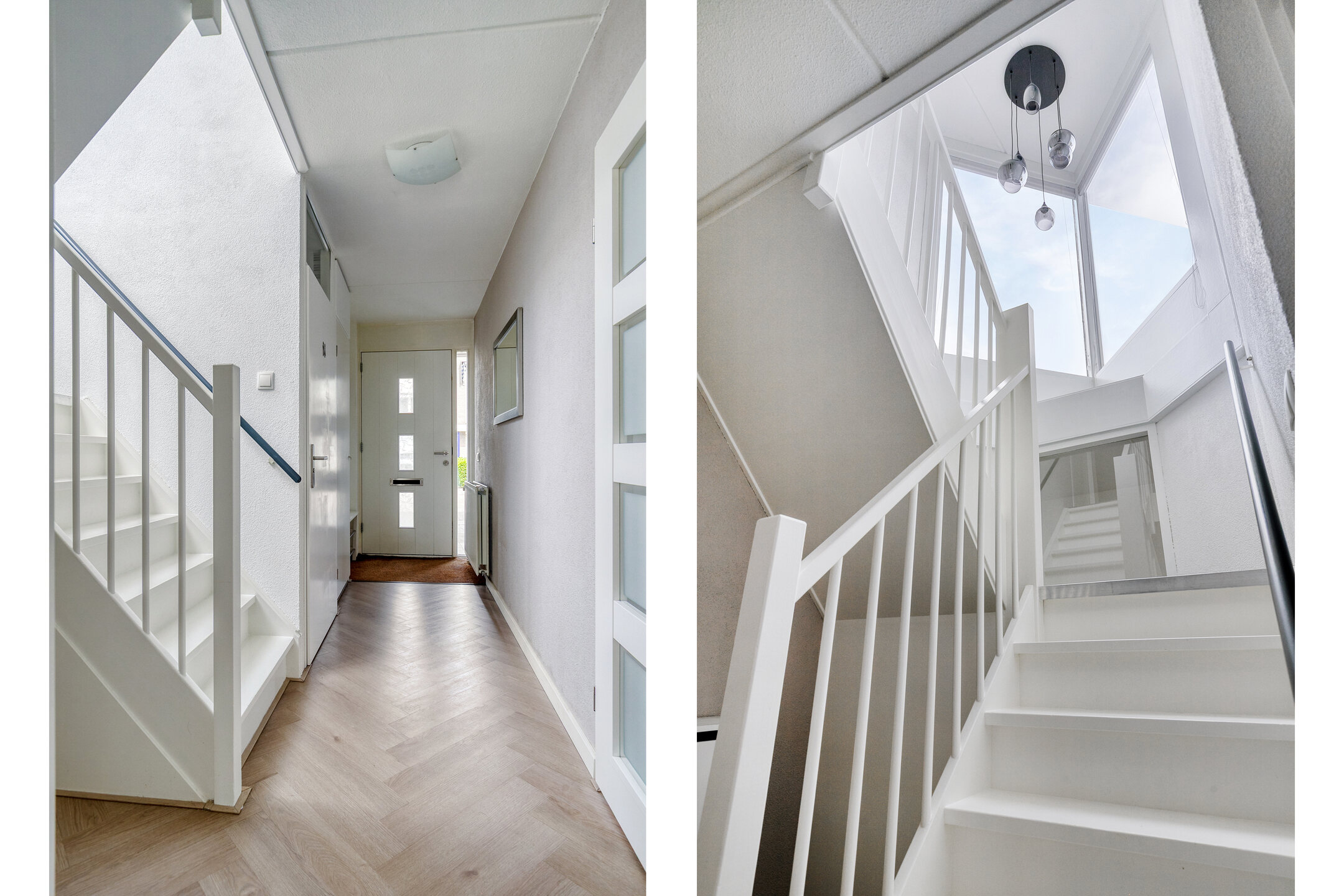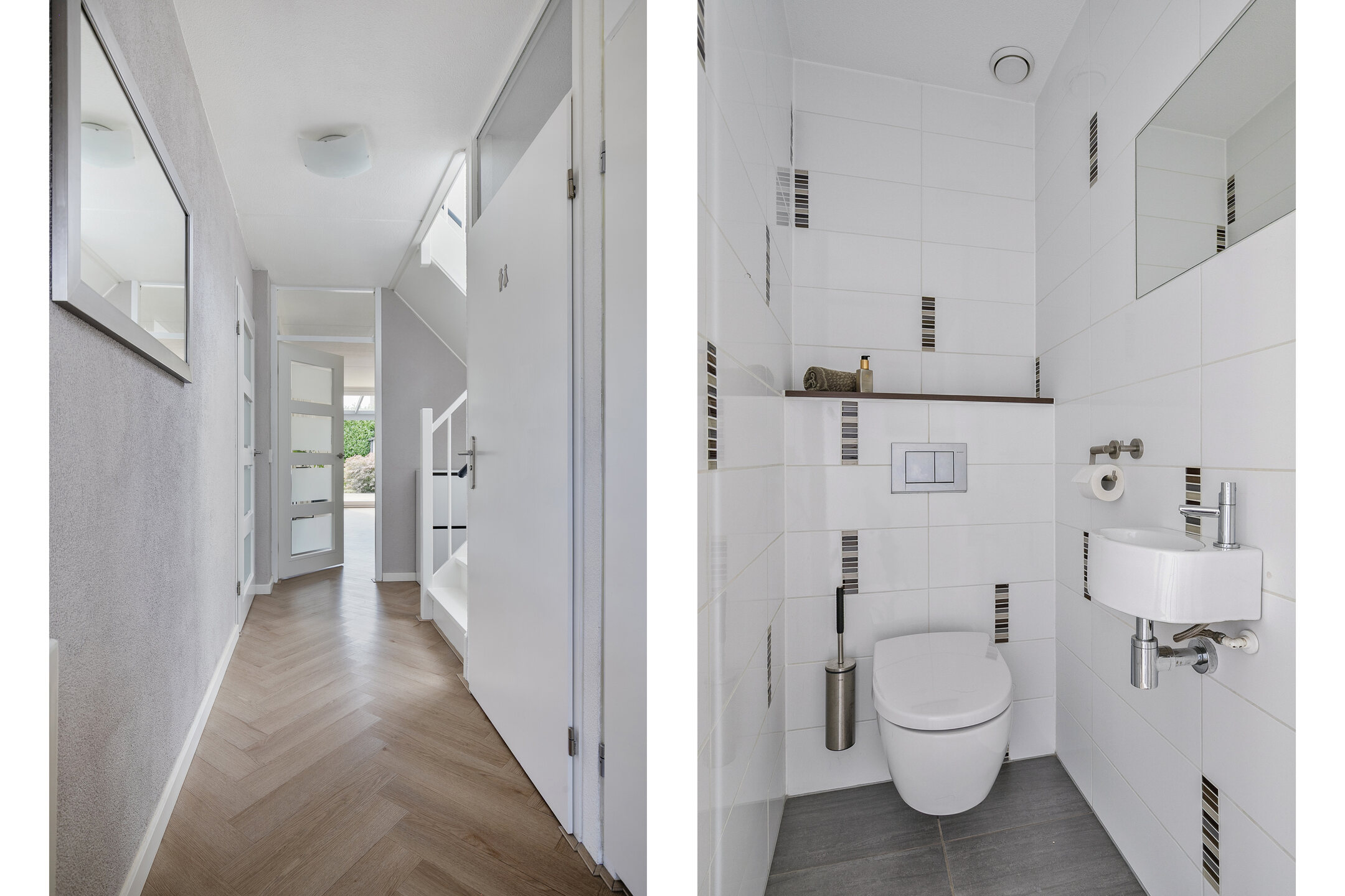 U komt binnen in de hal welke is voorzien van een visgraat pvc vloer en doorloopt over de gehele begane grond (m.u.v. het toilet). In de hal bevindt zich de meterkast (7 groepen met 2 aardlekschakelaars en 1x 2-fasen groep), het toilet en de trapopgang naar de verdieping. Vanuit de hal zijn de hobbykamer en woonkamer bereikbaar.