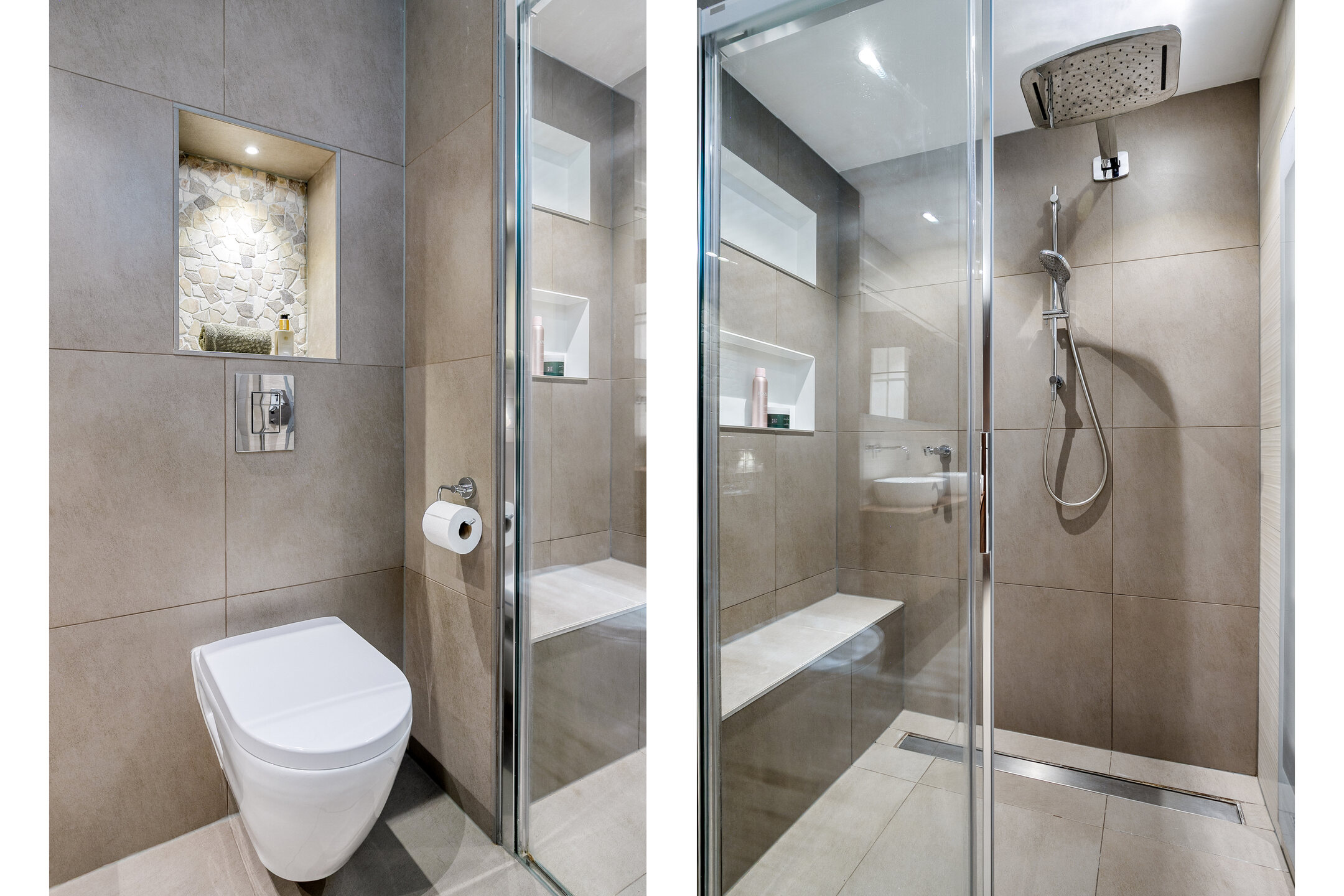 Het toilet is volledig betegeld en voorzien van een wandcloset en fonteintje.