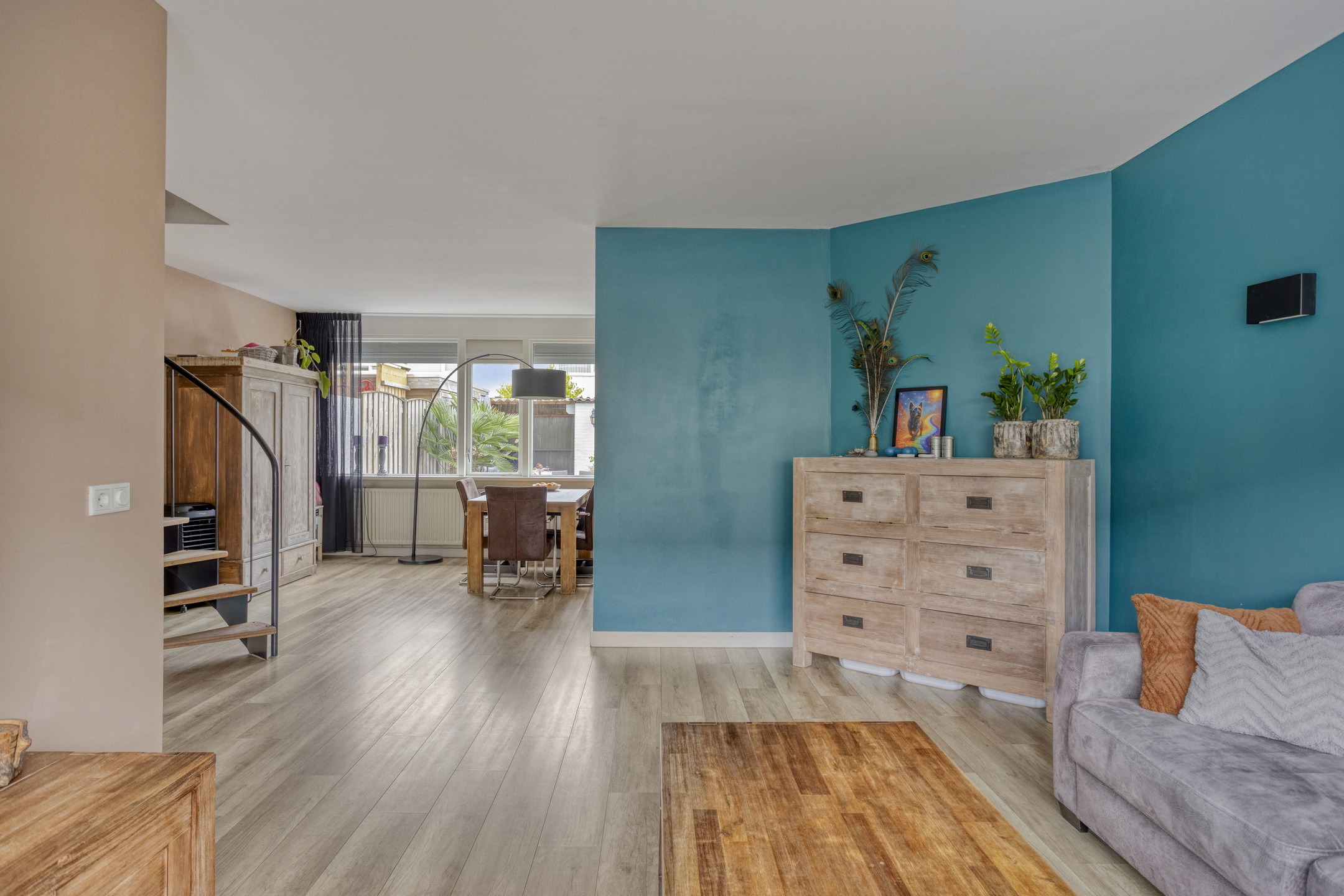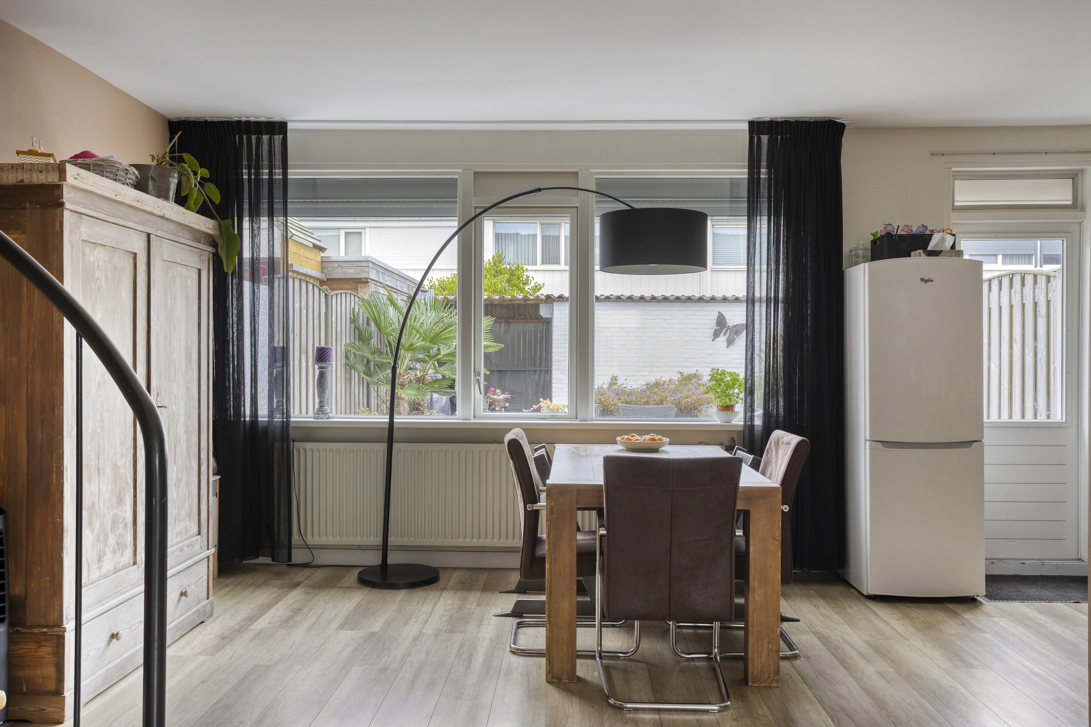 De Z-vormige woonkamer is opgedeeld in het zitgedeelte aan de voorzijde en het eetgedeelte aan de achterzijde. Het eetgedeelte staat in open verbinding met de keuken. De kamer geniet veel lichtinval door de grote raampartijen aan de voor- en achterzijde en is afgewerkt met stucwerk wanden en plafond.