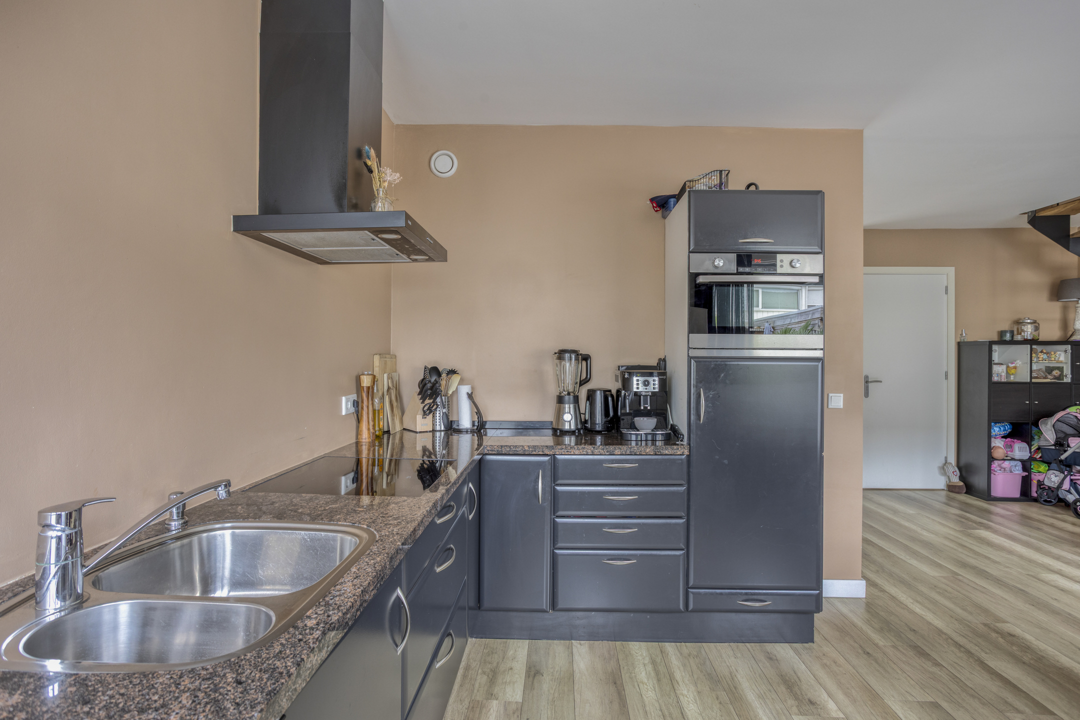 Het MDF meubel is geplaatst in een hoekopstelling en voorzien van een granieten werkblad met spoelbak. De keuken is uitgerust met de volgende inbouwapparatuur: inductiekookplaat (2020), recirculatiekap met koolstoffilter (2020), koelkast (2020), vaatwasser en combi-oven.