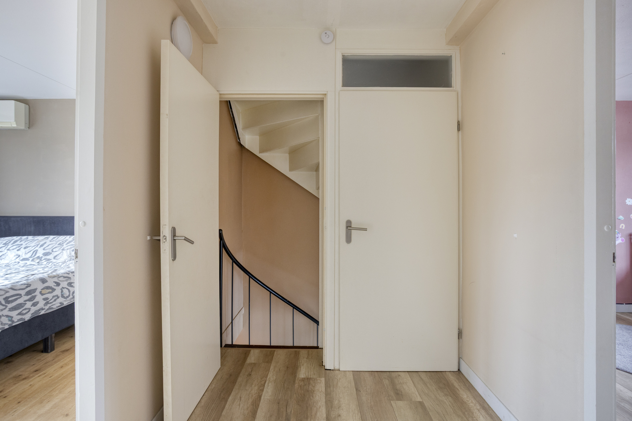 De overloop is afgewerkt met een laminaatvloer en biedt toegang tot 3 slaapkamers en de badkamer.