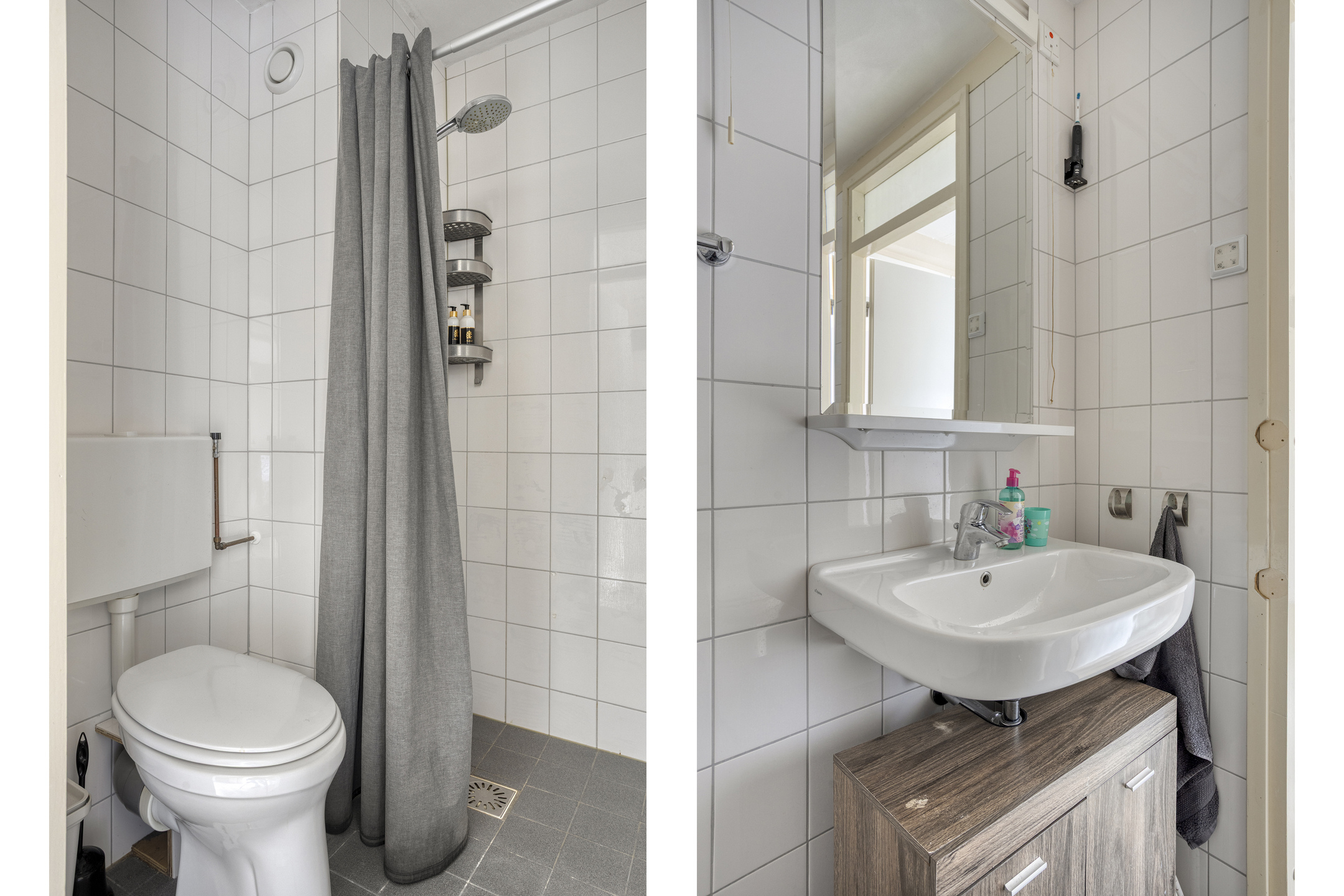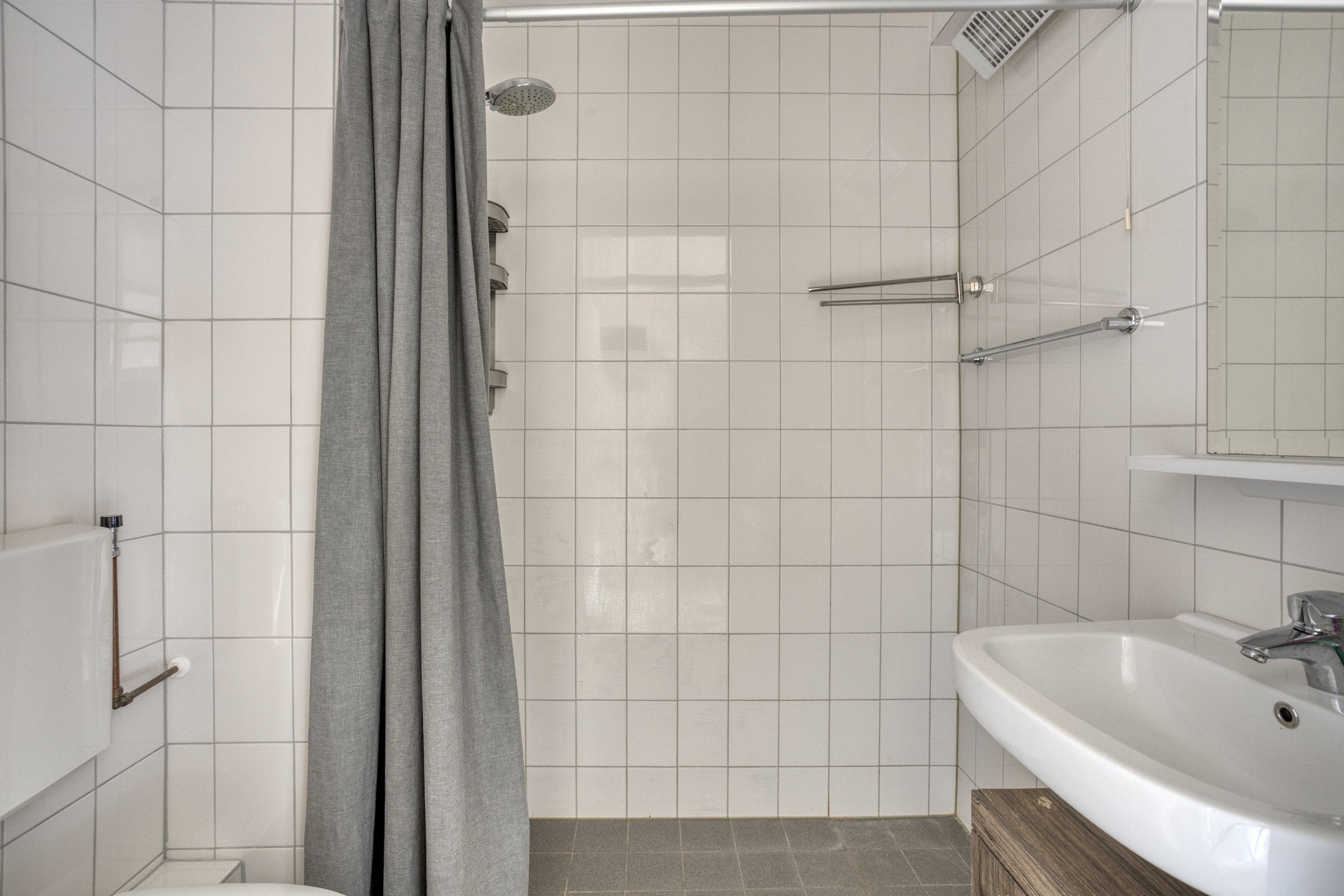 De badkamer is volledig betegeld en uitgerust met een inloopdouche met thermostaatkraan, wastafel en closet.
