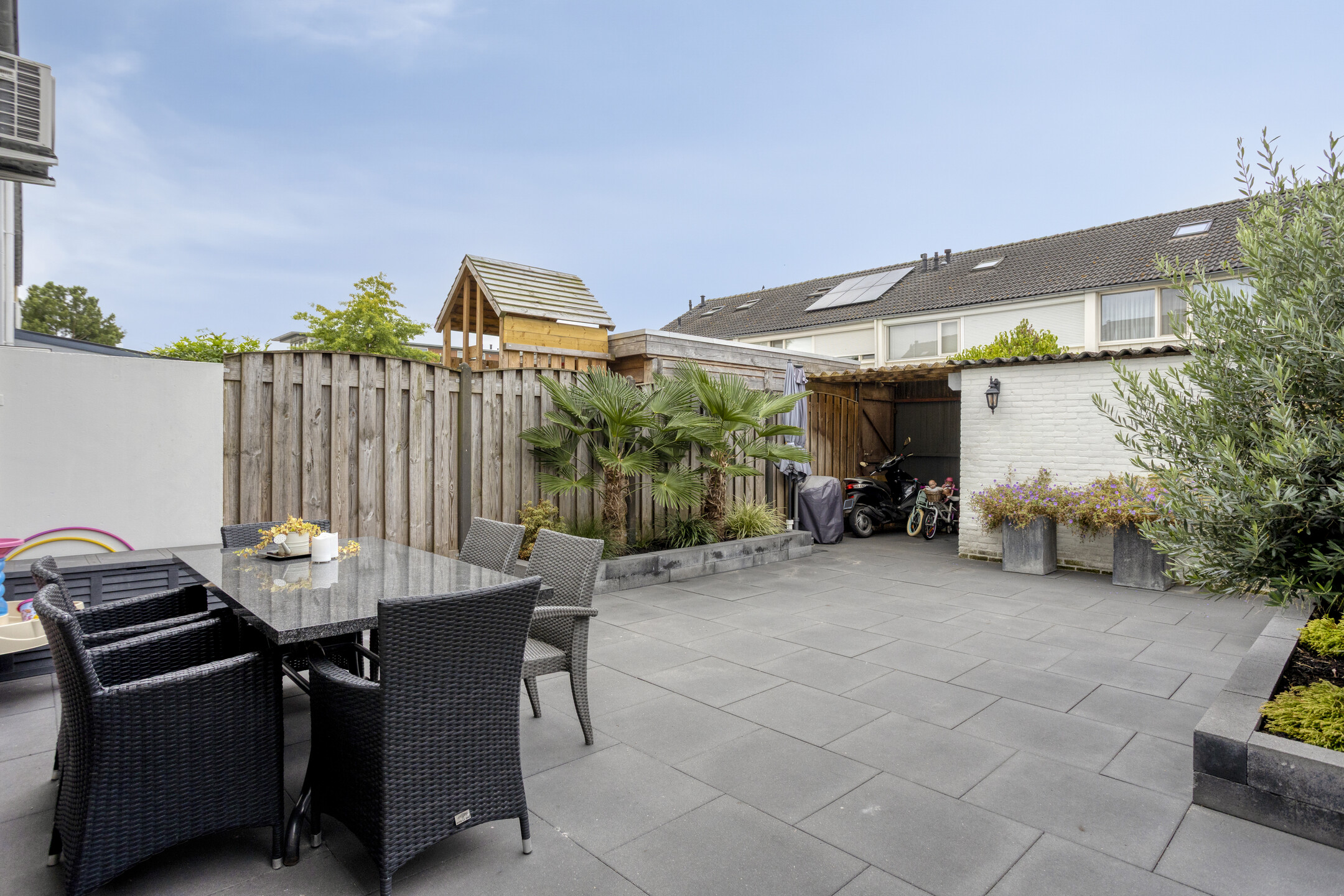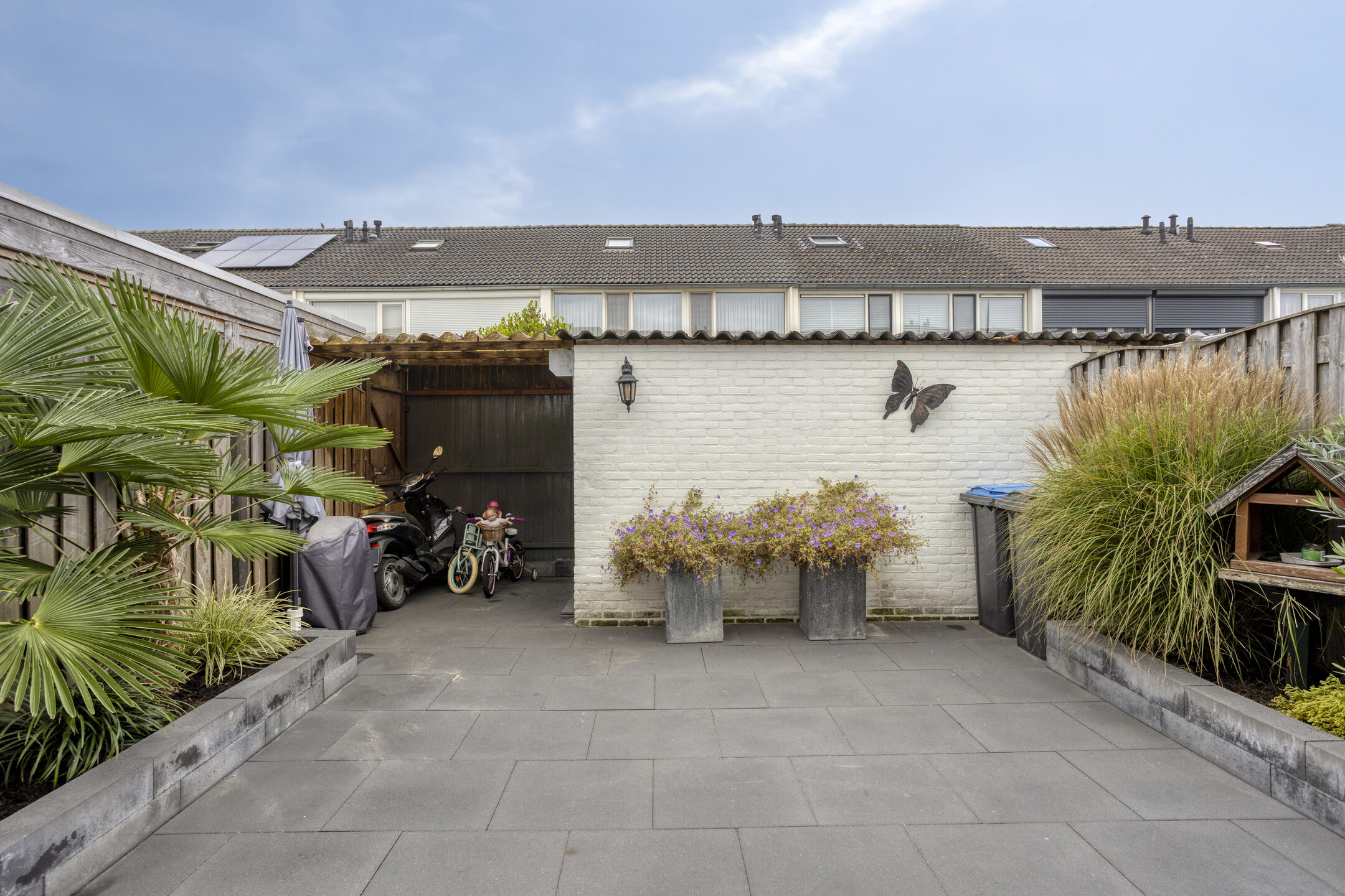 De achtertuin, gelegen op het westen is voorzien van bestrating en beplanting. Achter in de tuin bevinden zich een stenen berging met een overkapping en achterom uitkomen in het buurpad.