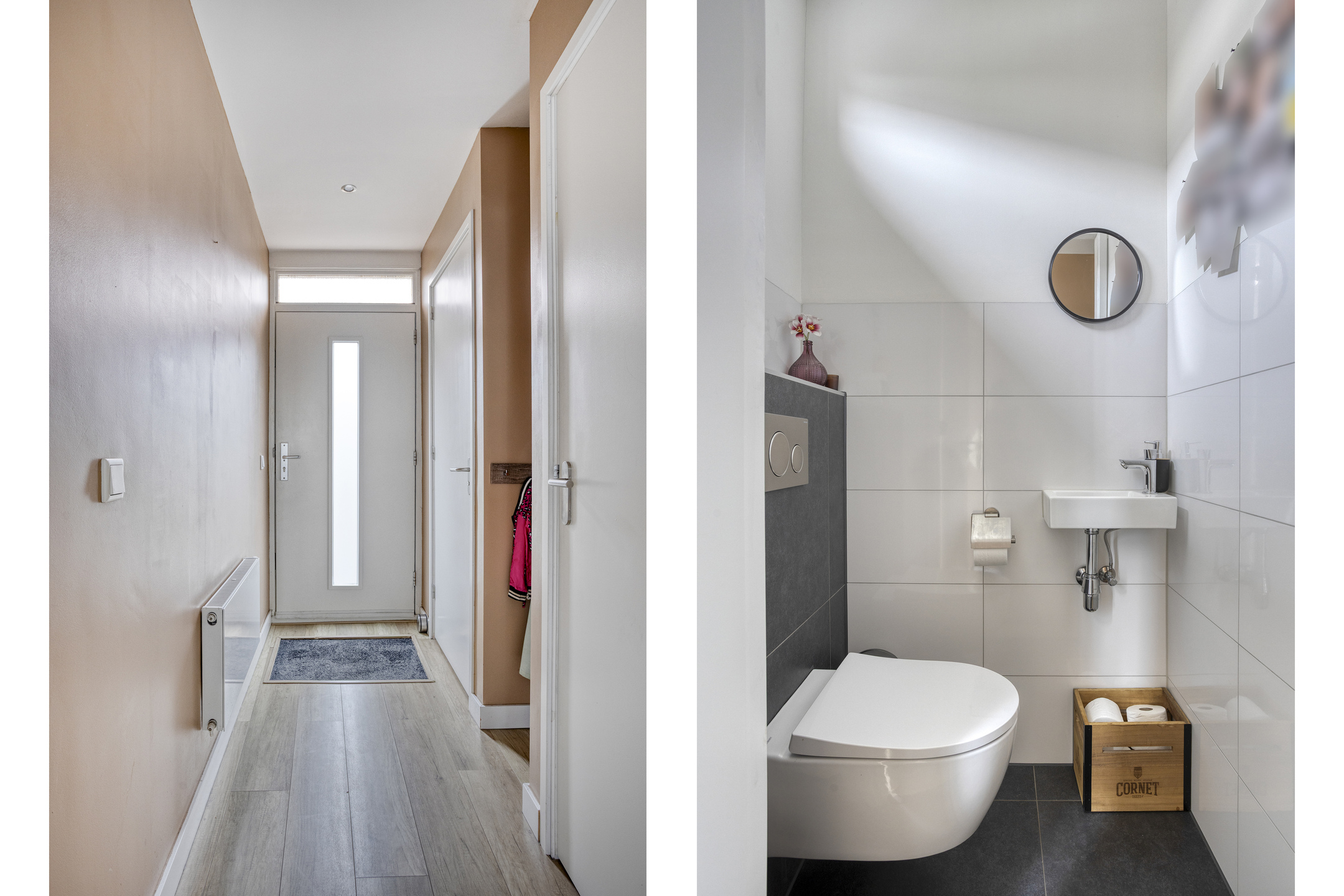 U komt binnen in de hal welke is voorzien van een laminaatvloer en doorloopt over de gehele begane grond (m.u.v. het toilet). In de hal bevindt zich de meterkast (8 groepen met 1 aardlekschakelaar) en het toilet. Vanuit de hal is de woonkamer bereikbaar.