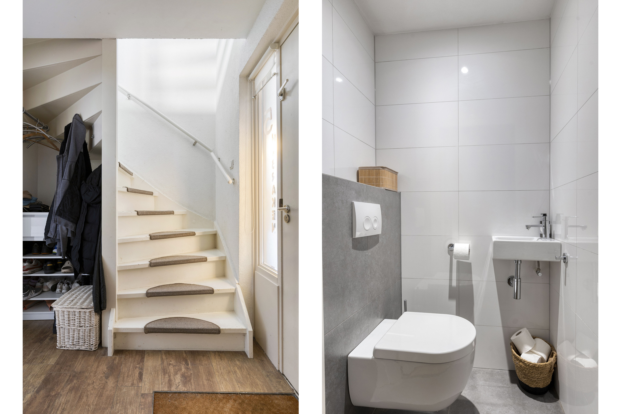 Het toilet is volledig betegeld en voorzien van een wandcloset en fonteintje.