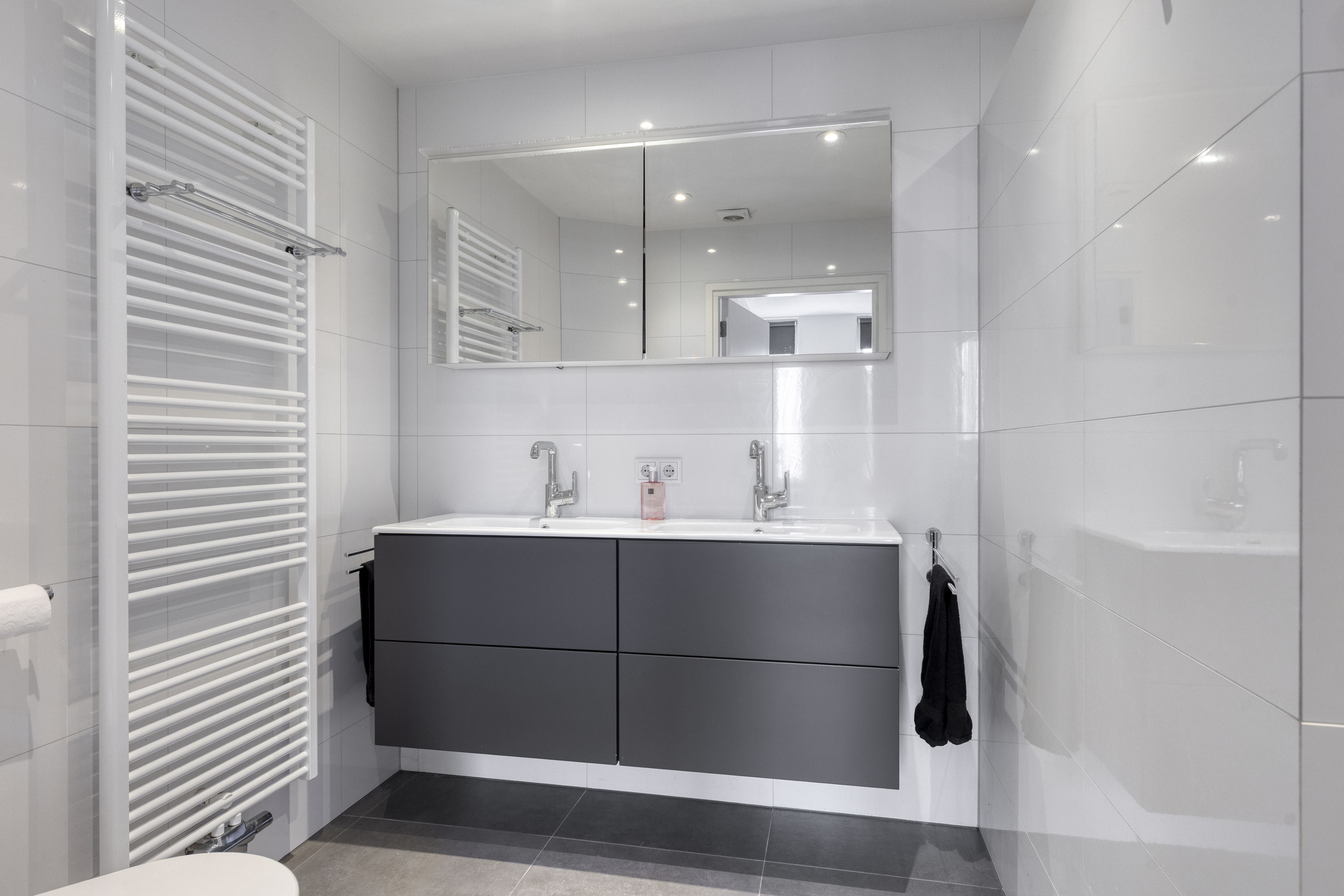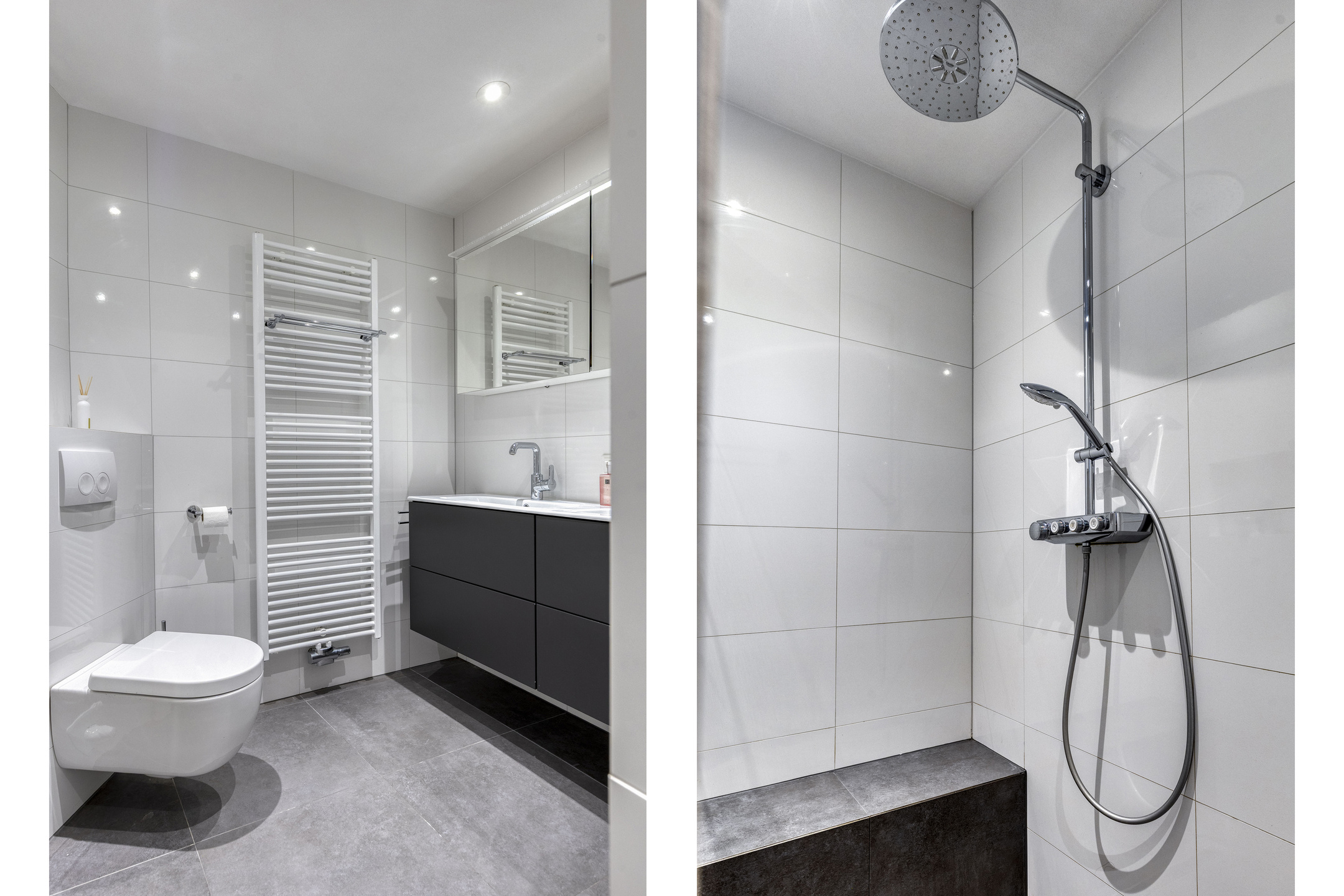 De badkamer is volledig betegeld en uitgerust met een ruime inloopdouche met rain shower, handdouche en thermostaatkraan, dubbele wastafel in meubel met spiegelkast, wandcloset en design radiator. In de badkamer is tevens vloerverwarming aanwezig.
