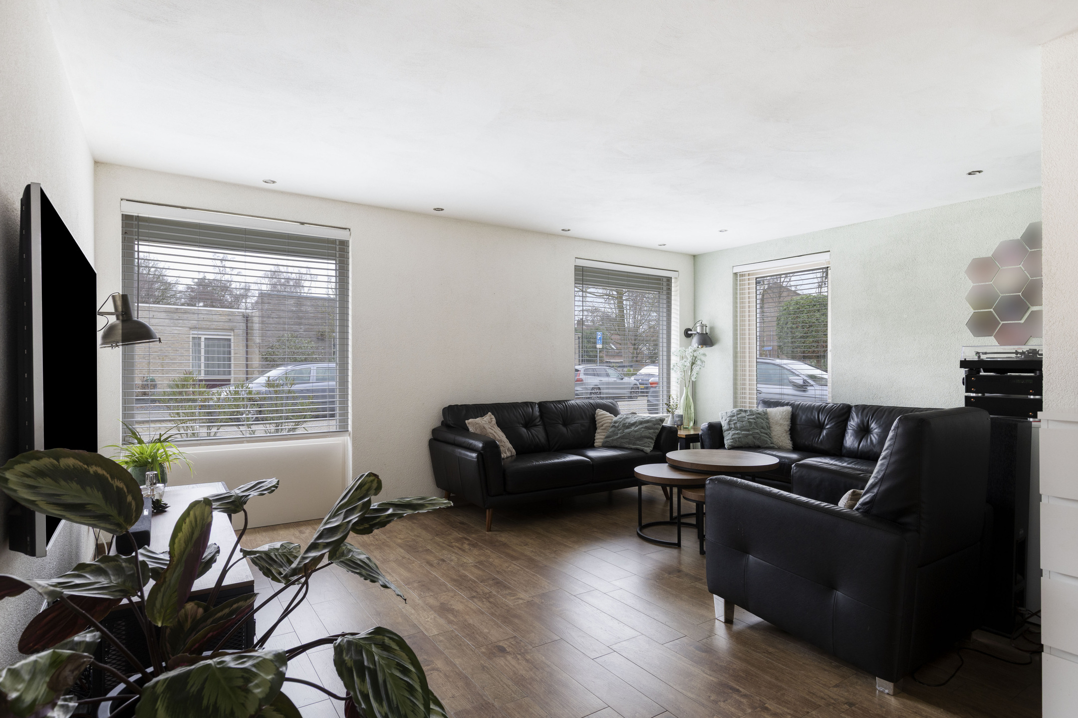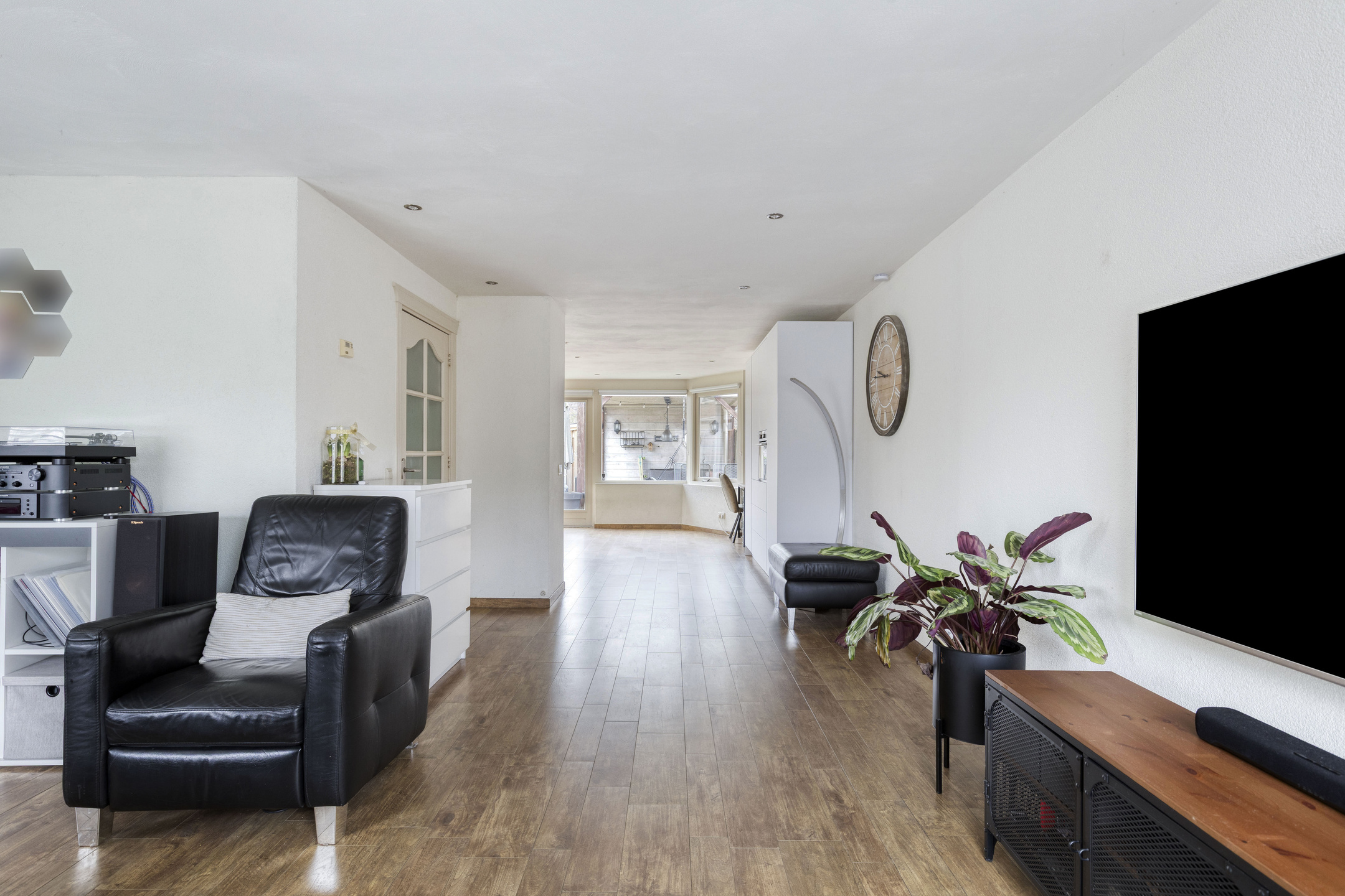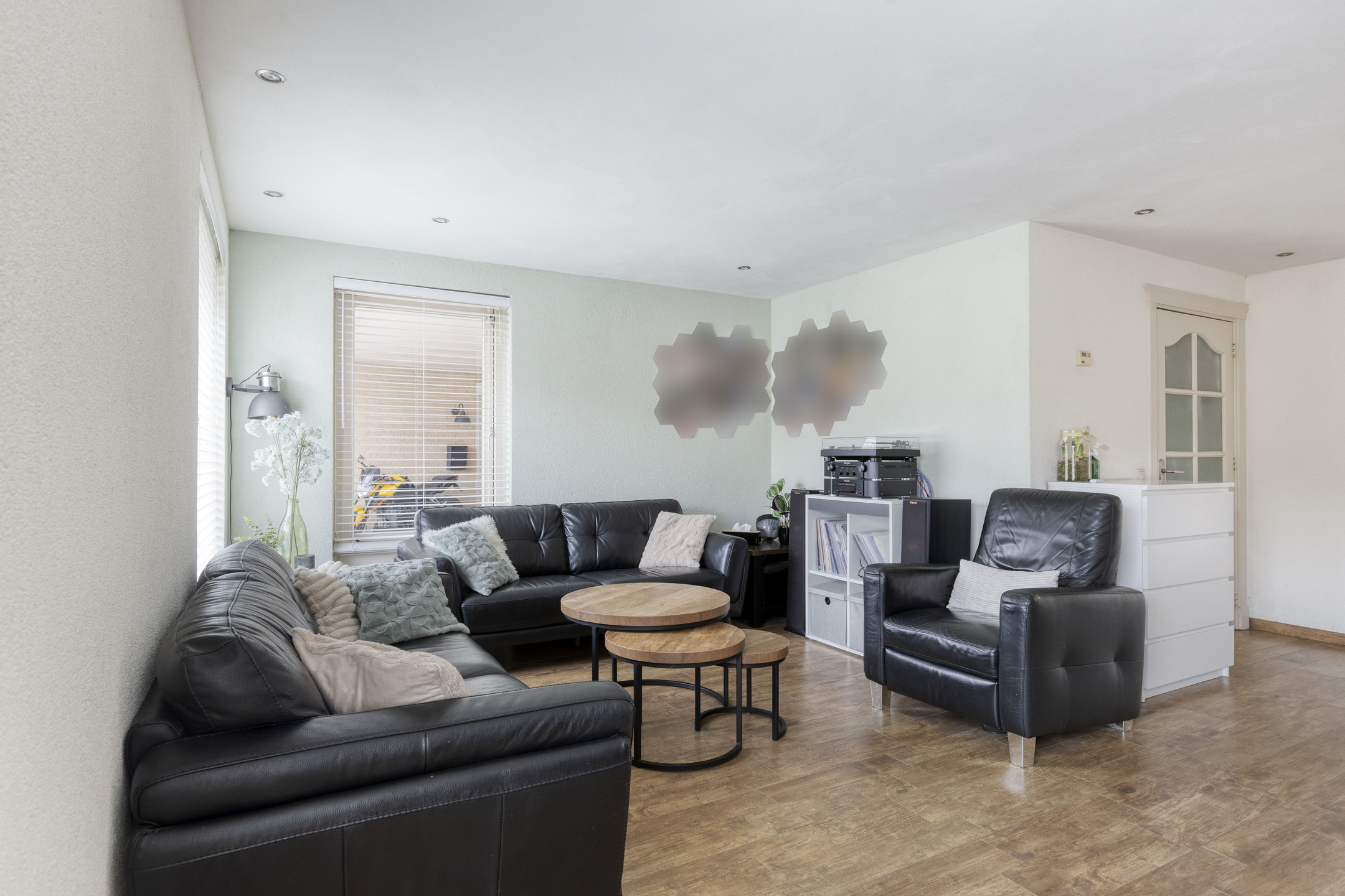 De L-vormige woonkamer is gesitueerd aan de voorzijde van de woning en staat in open verbinding met de keuken.