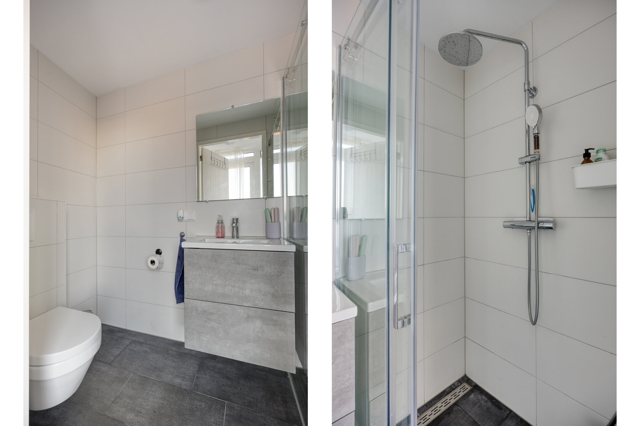 De badkamer is volledig betegeld en uitgerust met een inloopdouche met glazen schuifdeur en thermostaatkraan, wastafel in meubel en wandcloset.