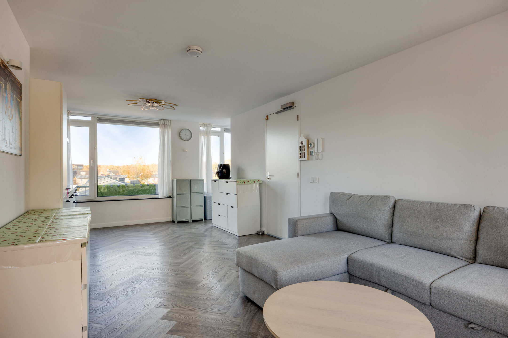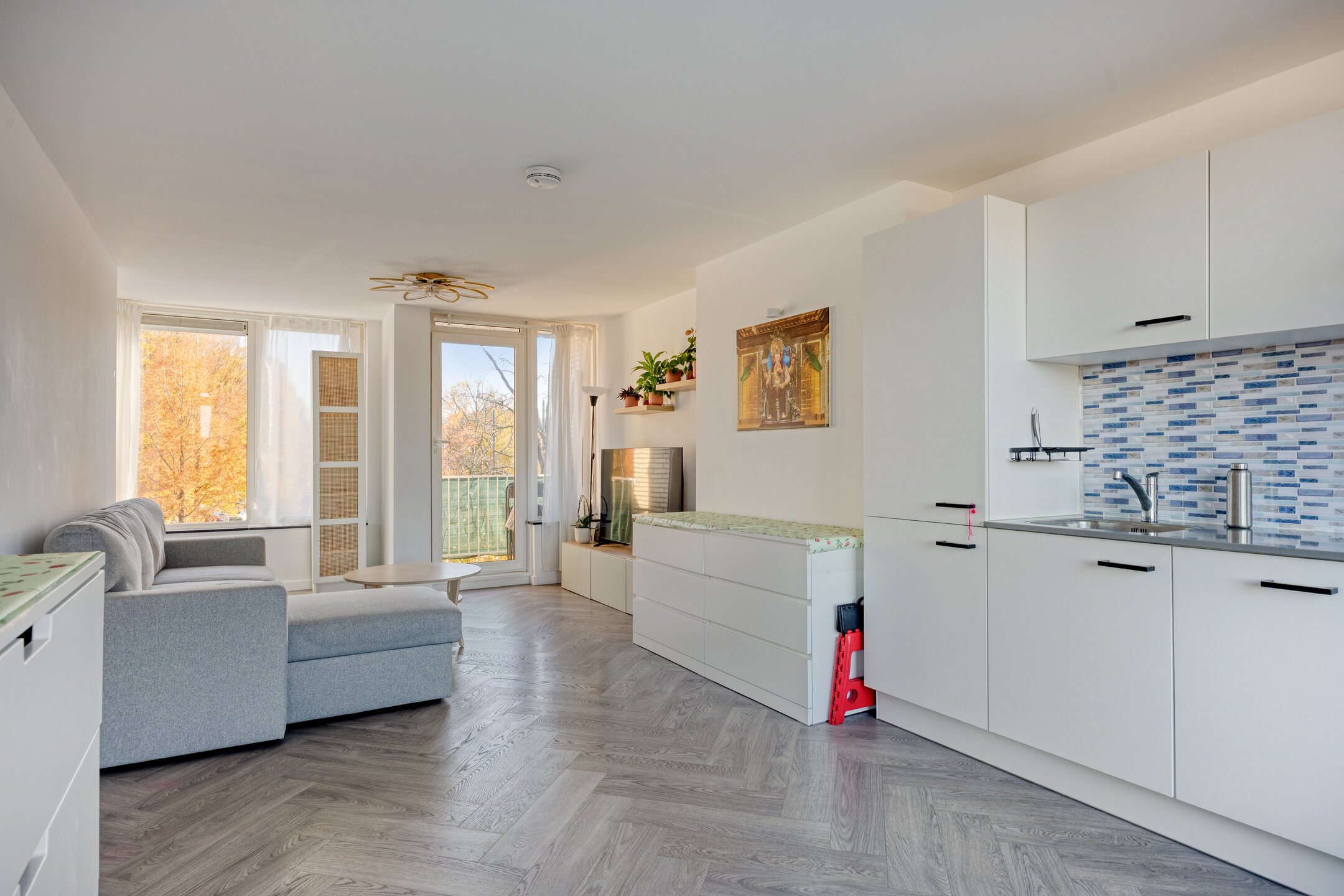 U komt direct binnen in de woonkamer. De woonkamer met balkon (aan de voorzijde) is afgewerkt met een fraaie visgraat pvc vloer die doorloopt over de gehele verdieping, stucwerk wanden en stucwerk plafond. Vanuit de woonkamer is de slaapkamer bereikbaar.