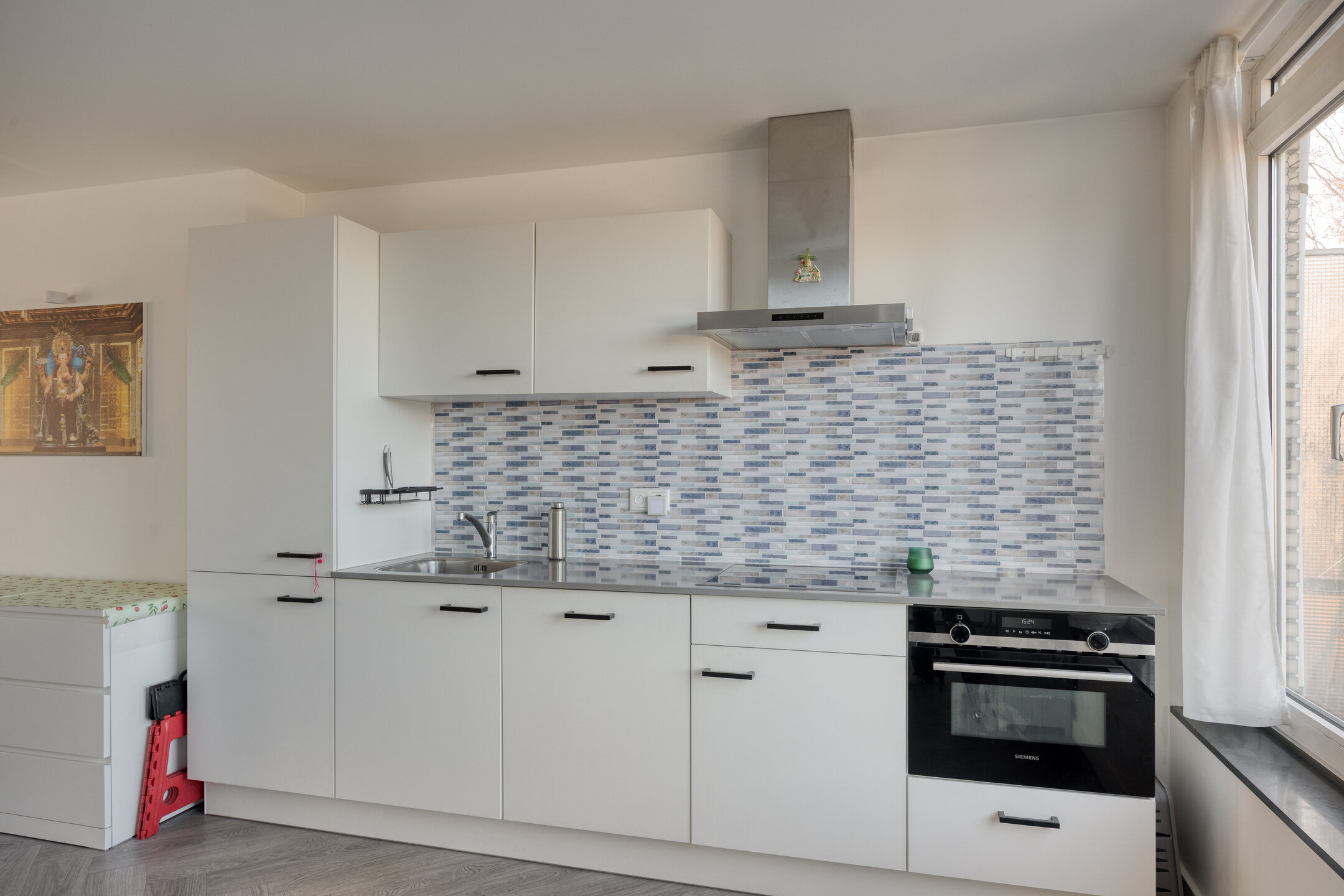 De keuken staat in open verbinding met de woonkamer. Het meubel is geplaatst in een wandopstelling met onder- en bovenkasten en voorzien van een composiet werkblad met spoelbak. Tevens is de keuken uitgerust met de volgende inbouwapparatuur: inductie kookplaat met afzuigkap, koelkast, vaatwasser en combi oven.