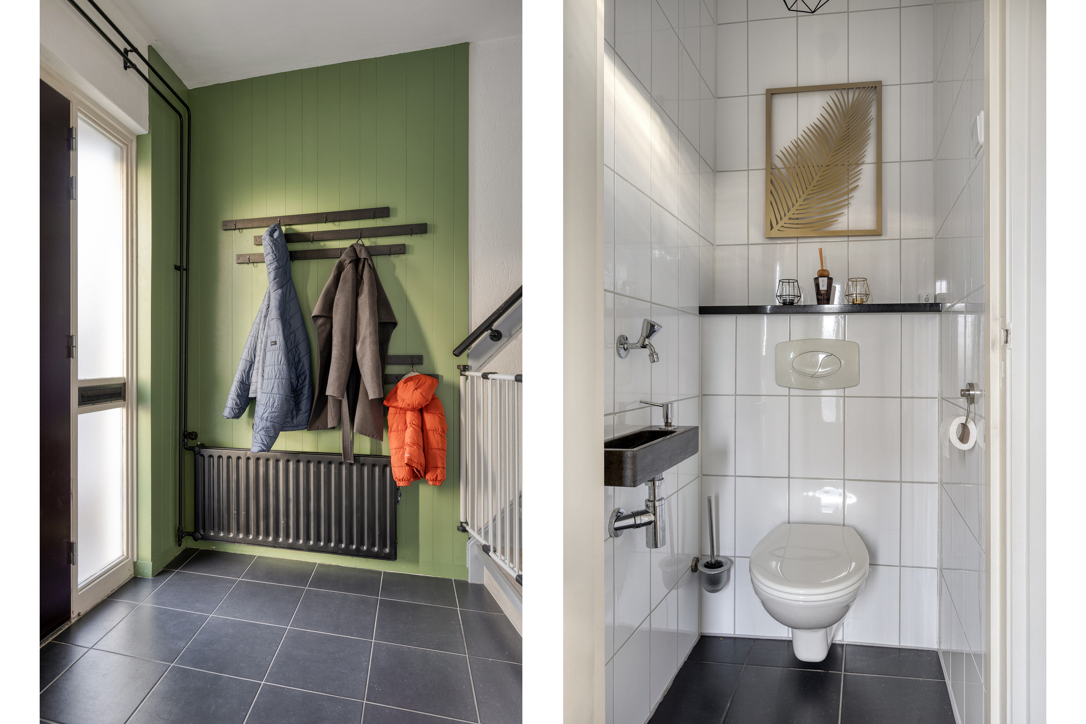 Het toilet is volledig betegeld en voorzien van een wandcloset en fonteintje.