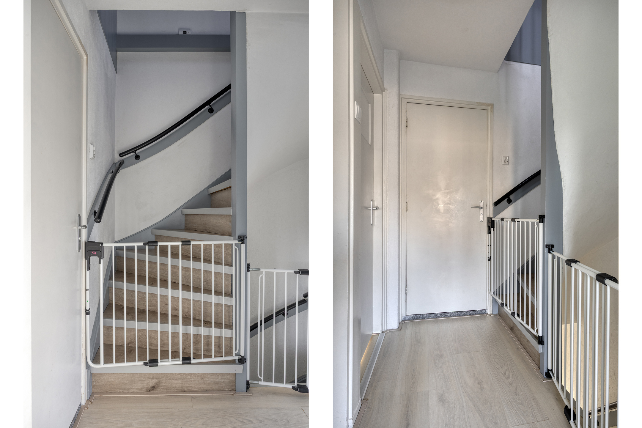 De overloop is afgewerkt met een laminaatvloer en geeft toegang tot drie slaapkamers en de badkamer.