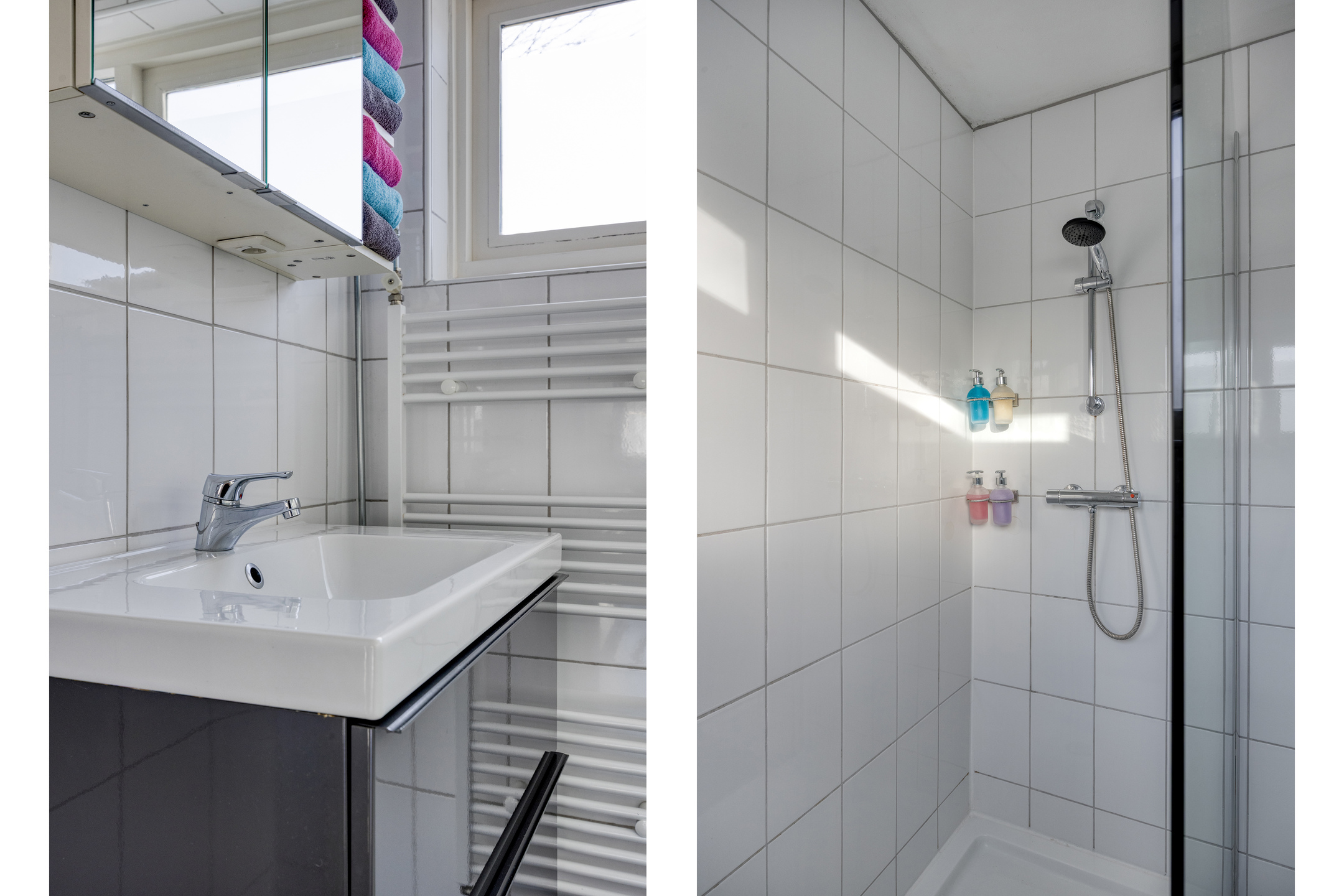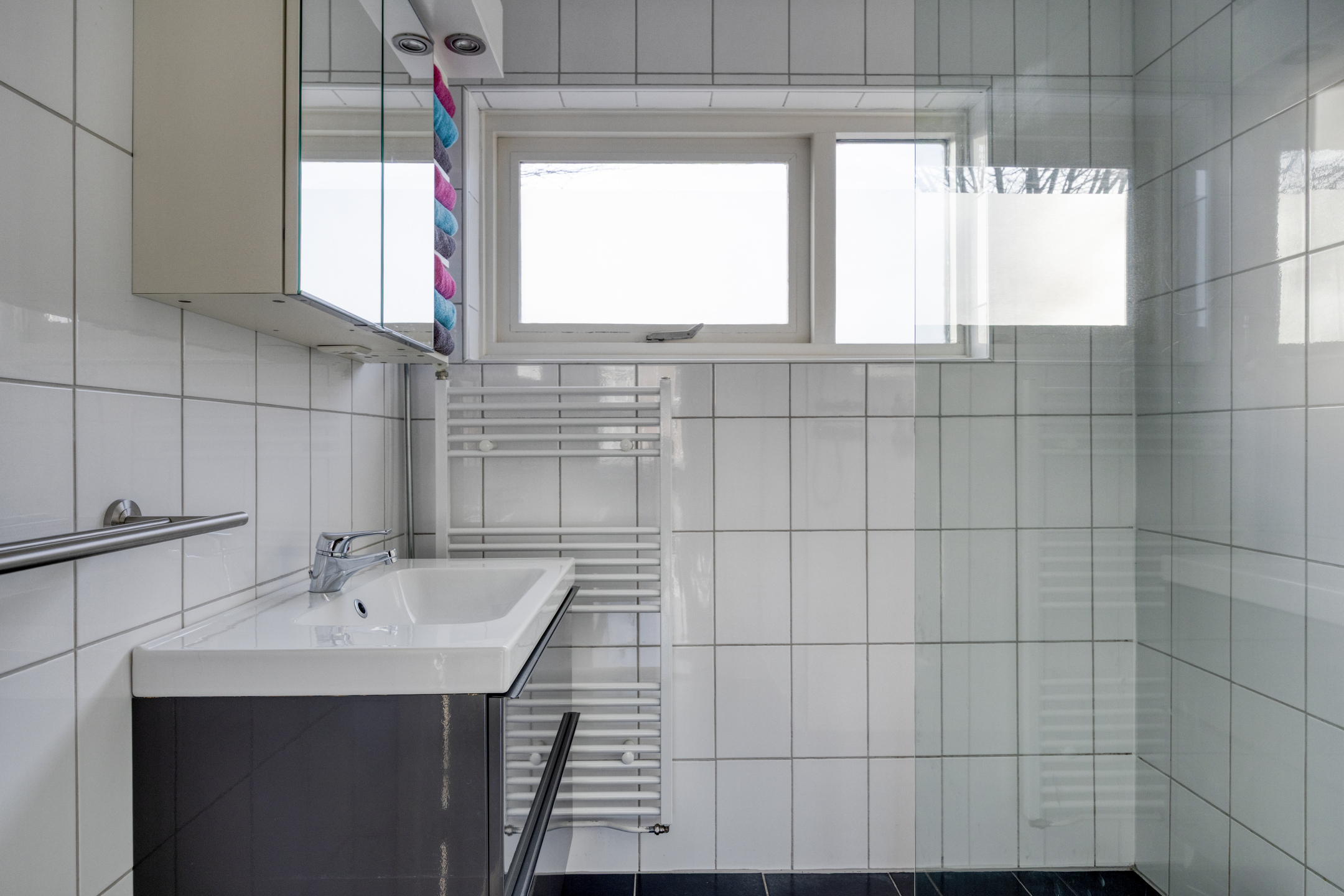 De badkamer is volledig betegeld en uitgerust met een inloopdouche met thermostaatkraan, wastafel in meubel en design radiator.