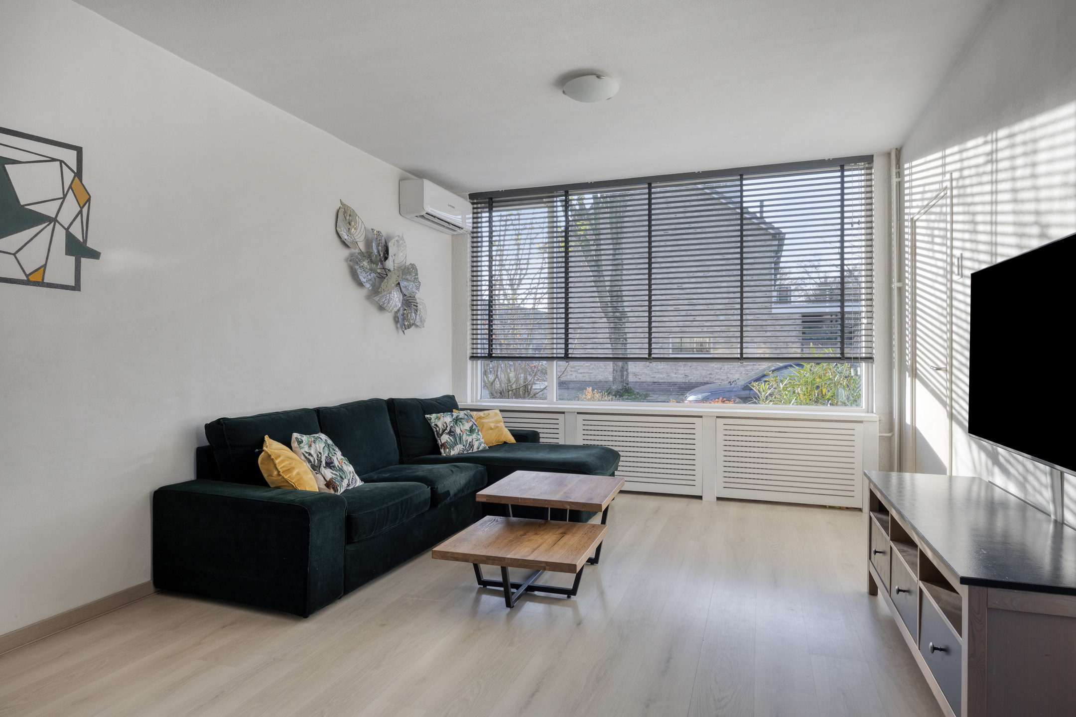 De Z-vormige woonkamer is voorzien van airconditioning en een praktische trapkast waarin zich de groepenkast (7 groepen met 2 aardlekschakelaars) bevindt. De woonkamer is opgedeeld in het zitgedeelte aan de voorzijde en het eetgedeelte aan de achterzijde. Het eetgedeelte staat in (half) open verbinding met de keuken en de woonkamer is afgewerkt met een laminaatvloer, structuurverf wanden en structuurverf plafond.