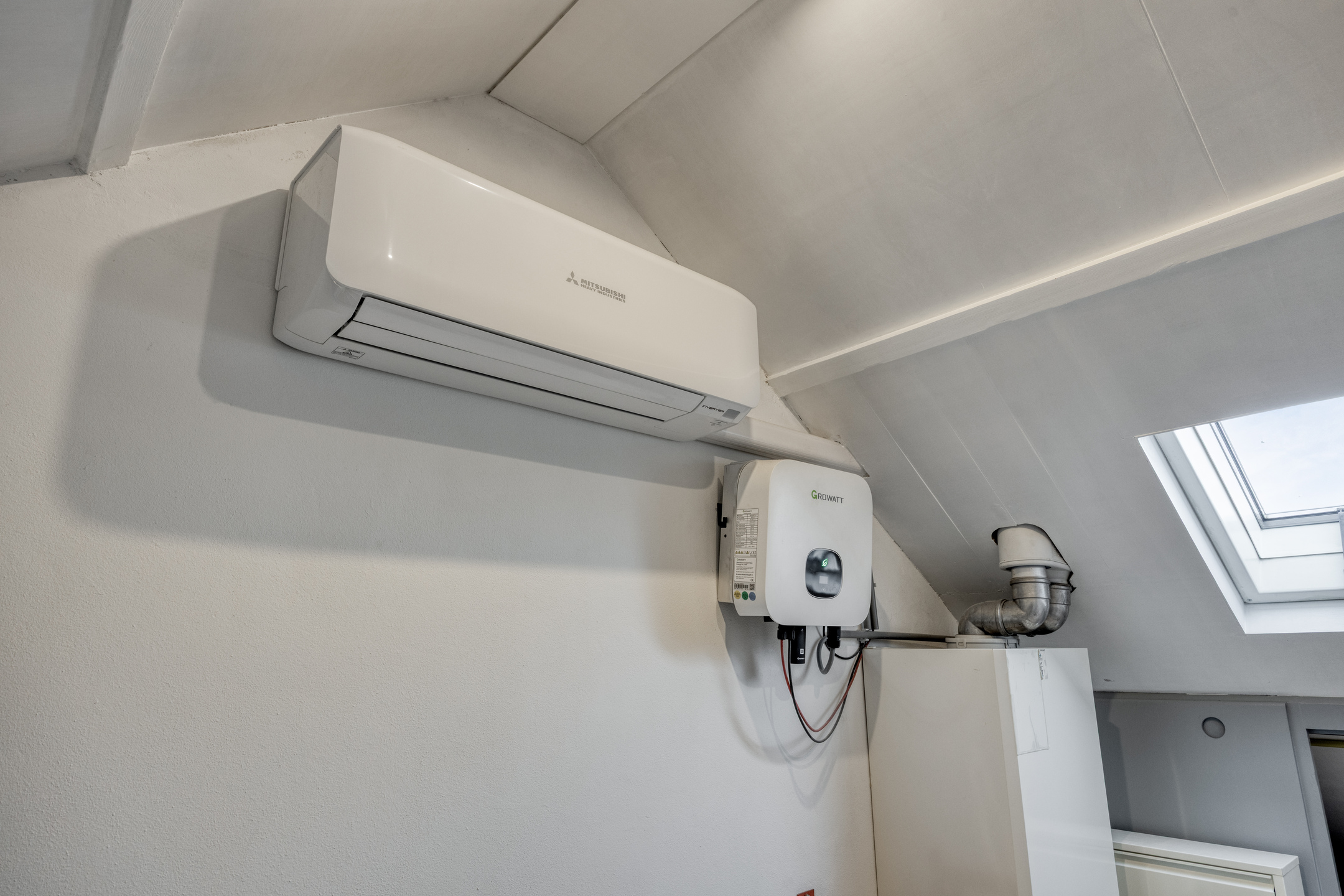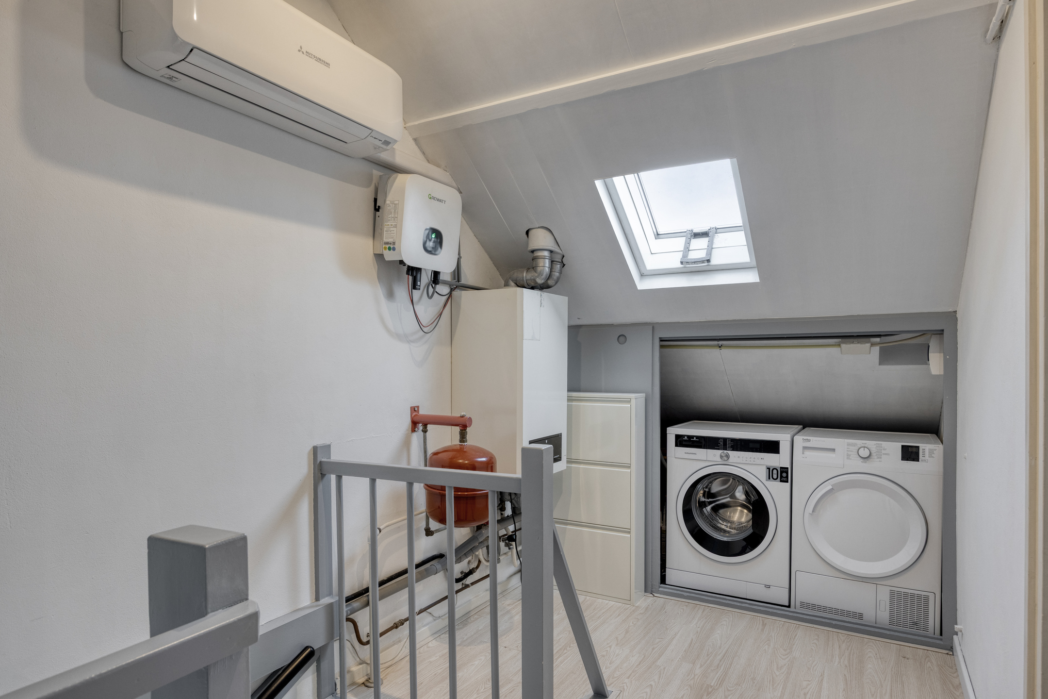 Via een vaste trap bereikt u de voorzolder met 4-pans dakraam. De voorzolder is voorzien van airconditioning en hier bevinden zich tevens de opstelling van de c.v.-combiketel, de omvormer van de zonnepanelen en de aansluitingen van de wasapparatuur. Praktische opbergruimte is te vinden in de kapschuinte.