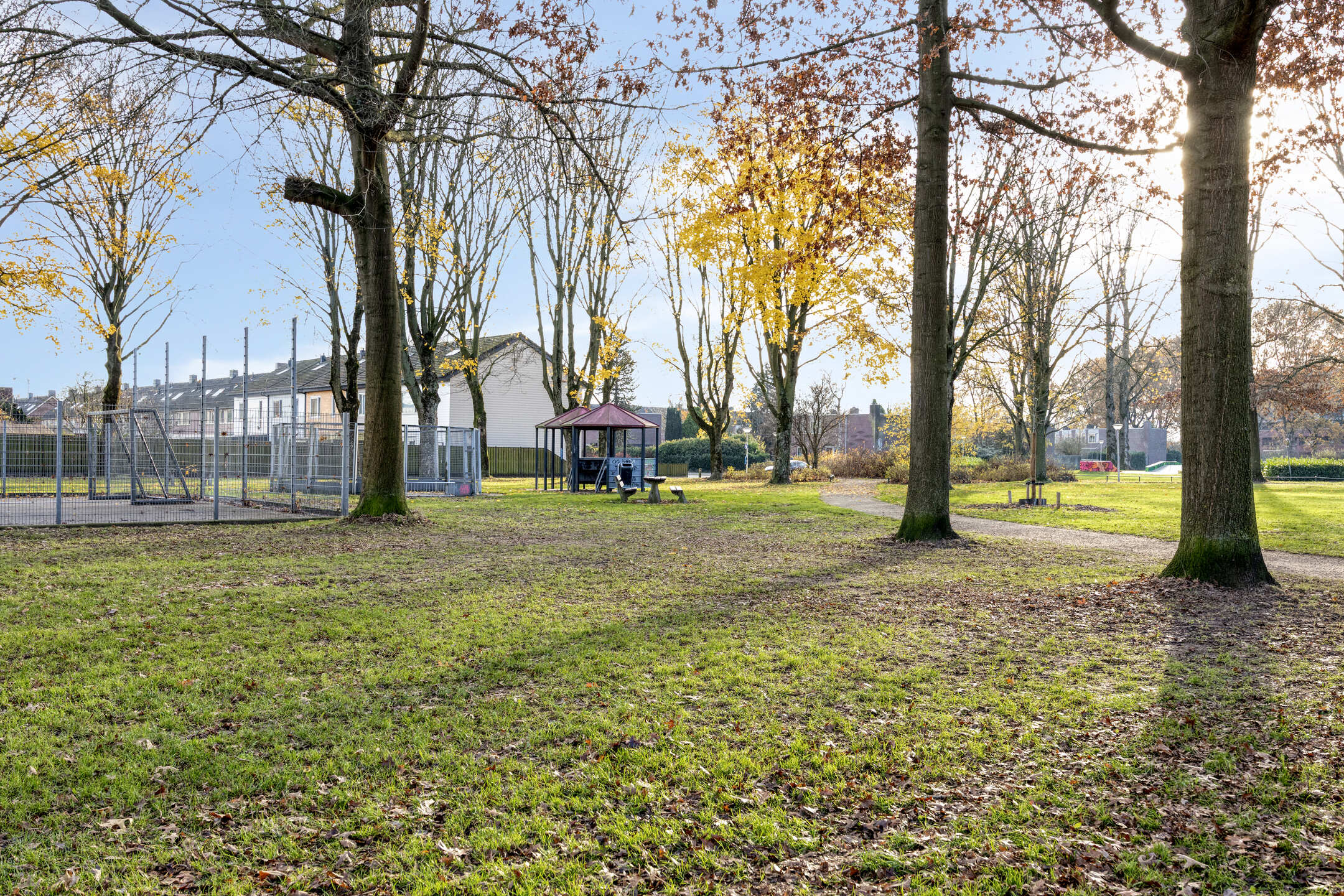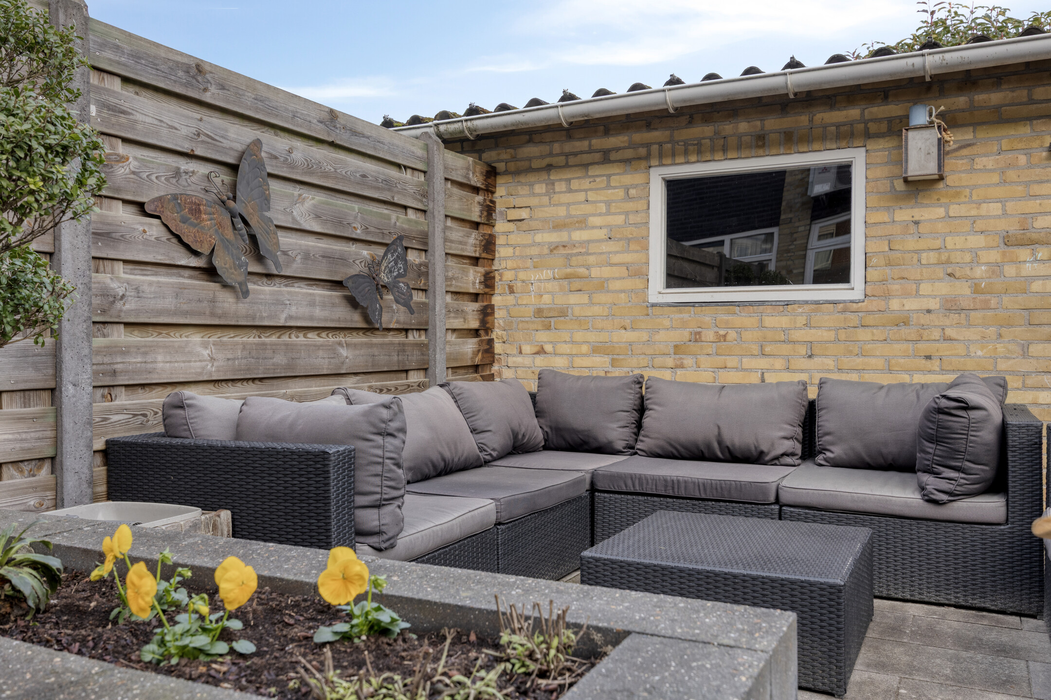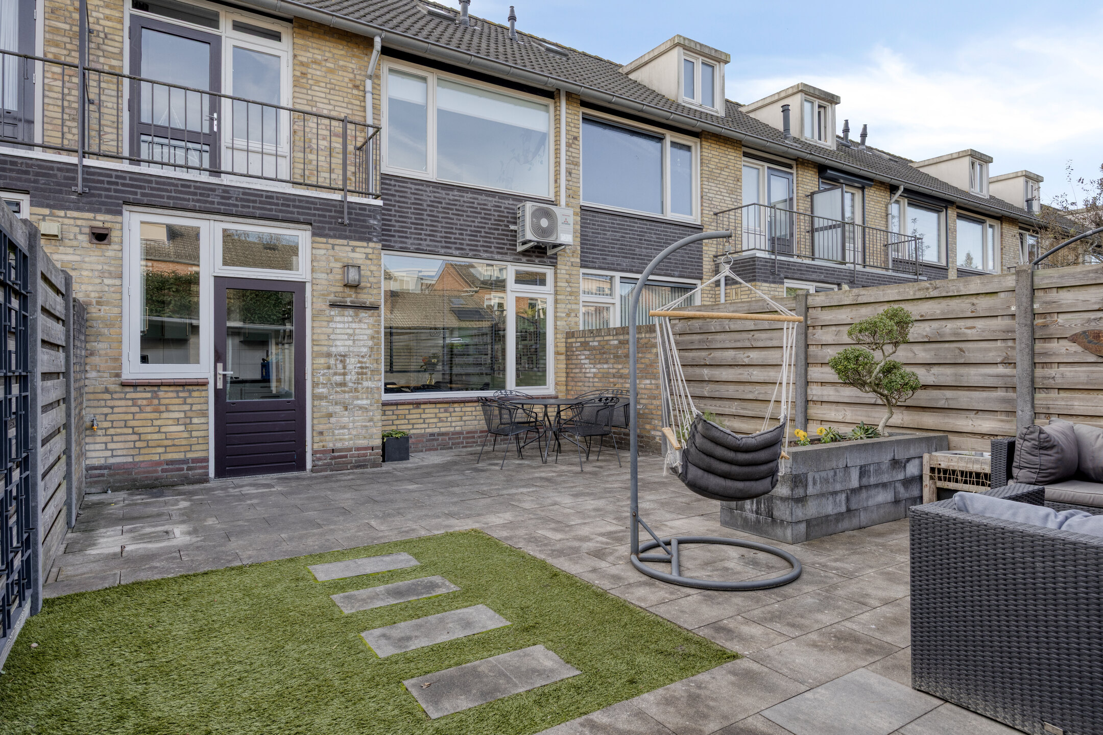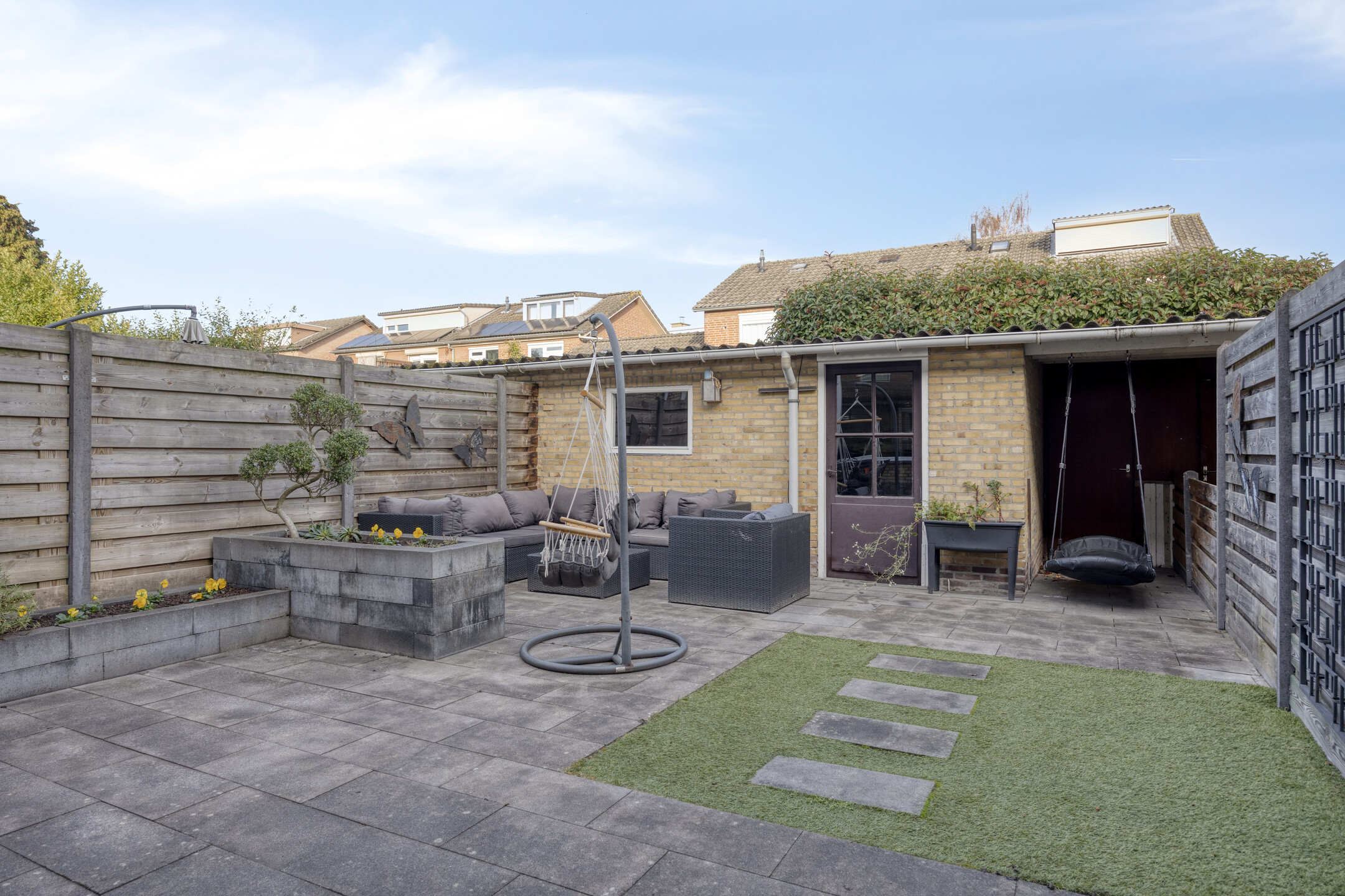 De onderhoudsvriendelijke achtertuin is voorzien van bestrating, enkele borders en kunstgras. Achter in de tuin staat een vrijstaande stenen berging met overkapping en poort met eigen achterom uitkomend in het buurpad.