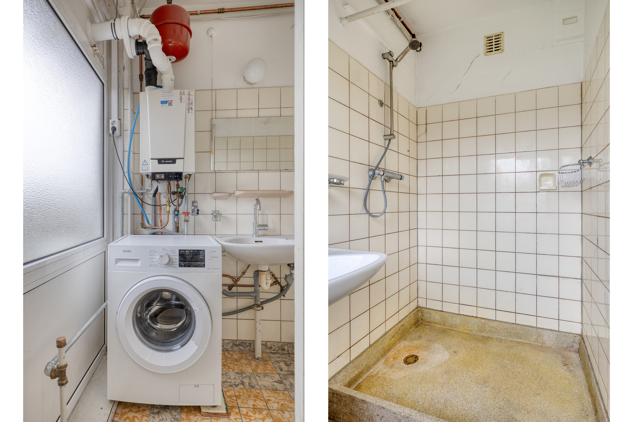 * Badkamer: deels betegeld, voorzien van inloopdouche met thermostaatkraan, wastafel, warmtelampen en wasmachineaansluiting. Opstelling c.v.-combiketel.