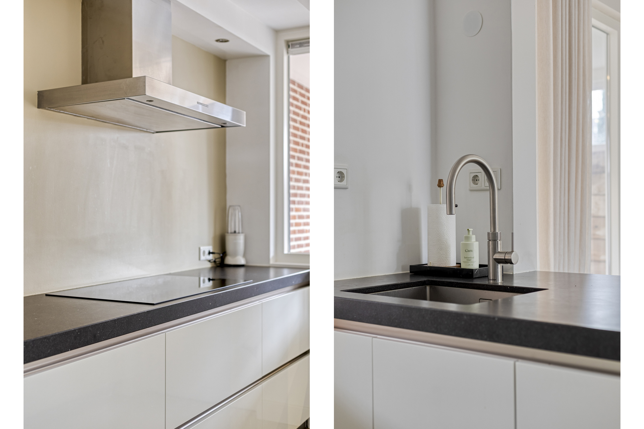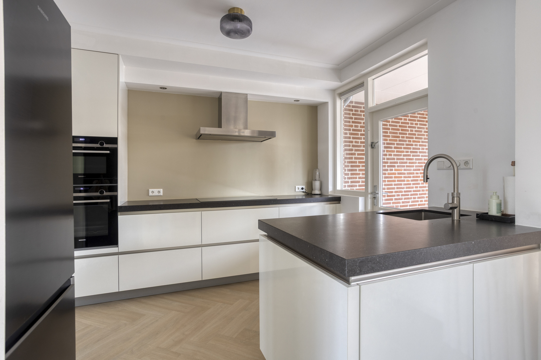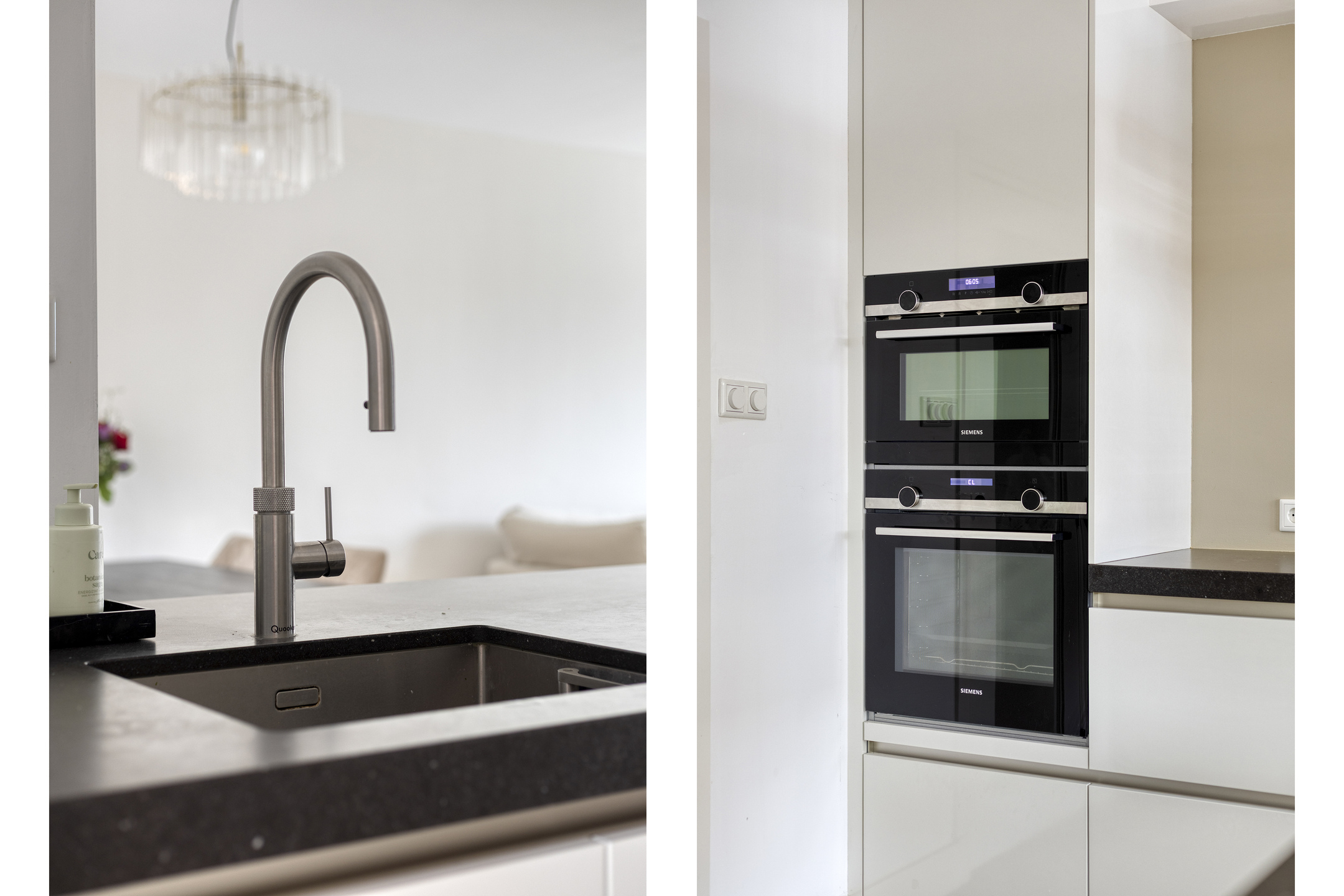 Het moderne meubel is geplaatst in een dubbele wandopstelling en voorzien van een natuurstenen werkblad met spoelbak. De keuken is uitgerust met de volgende inbouwapparatuur: inductie kookplaat (2025), afzuigschouw, vaatwasser, combi-oven met stoomfunctie en Quooker.