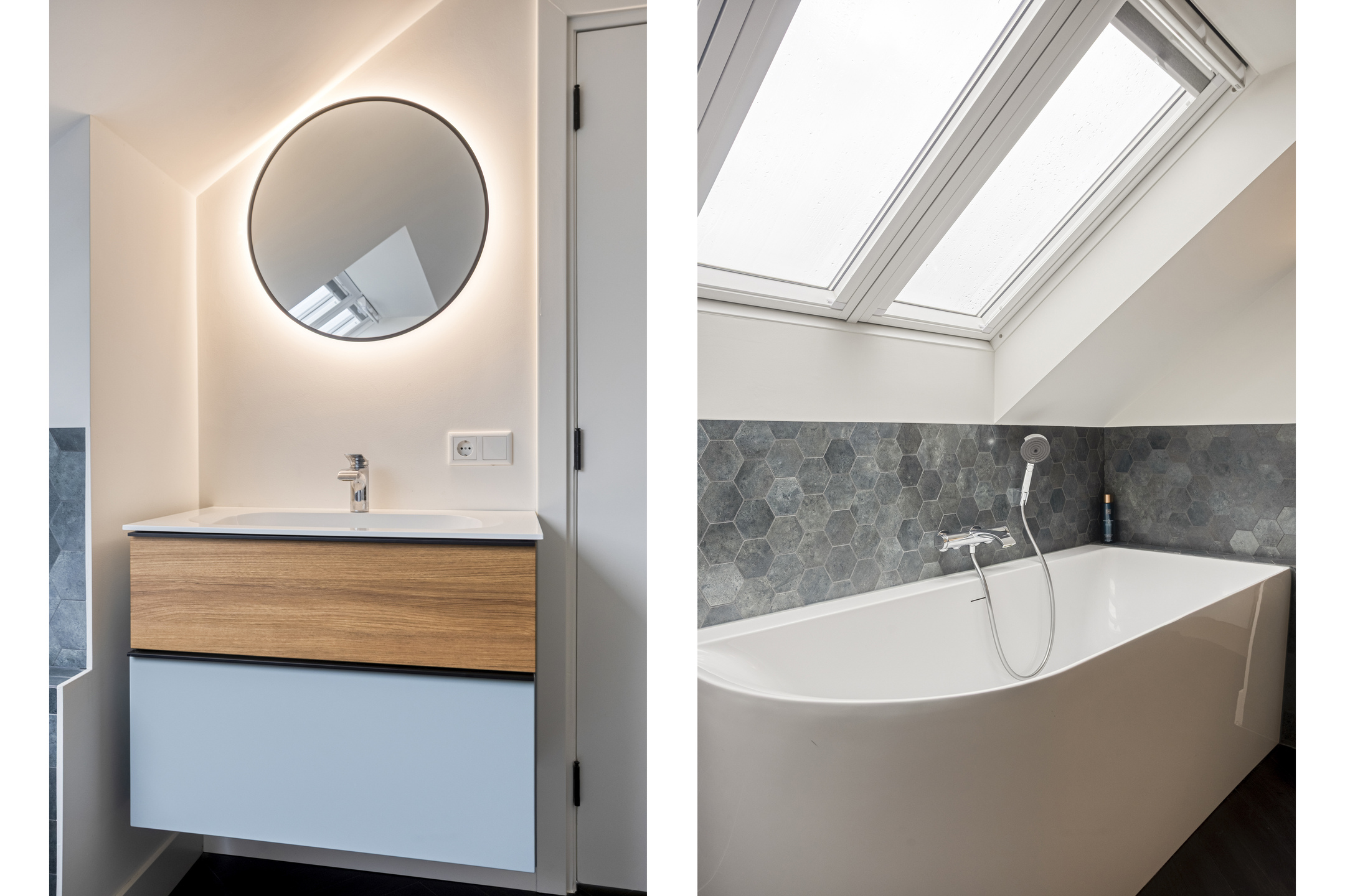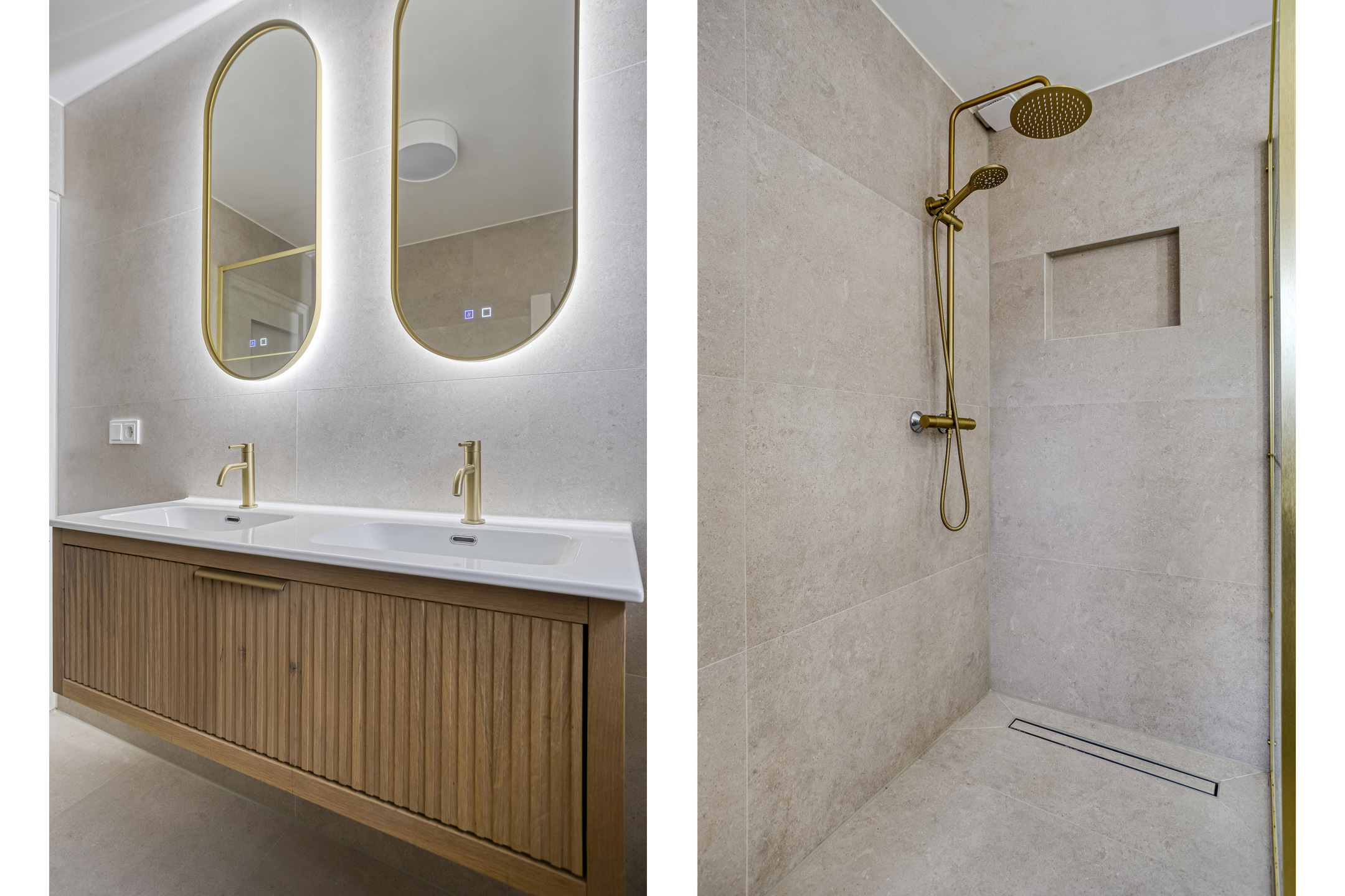De badkamer is volledig betegeld en uitgerust met een ruime inloopdouche met rain shower, handdouche en thermostaatkraan, dubbele wastafel in meubel met dubbele verwarmde en verlichte spiegel, wandcloset en design radiator.