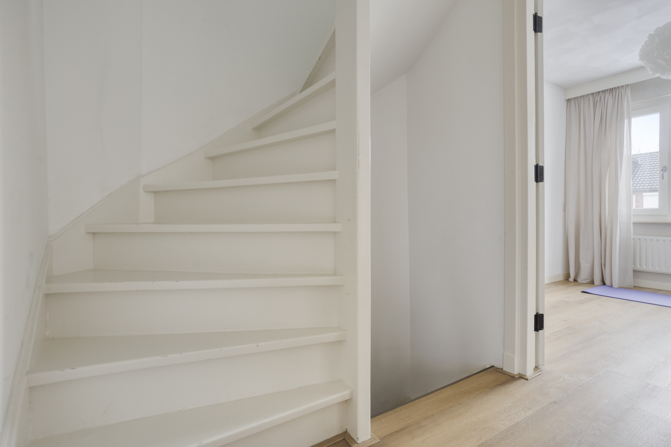 De overloop is afgewerkt met een pvc vloer en geeft toegang tot drie slaapkamers en de badkamer.