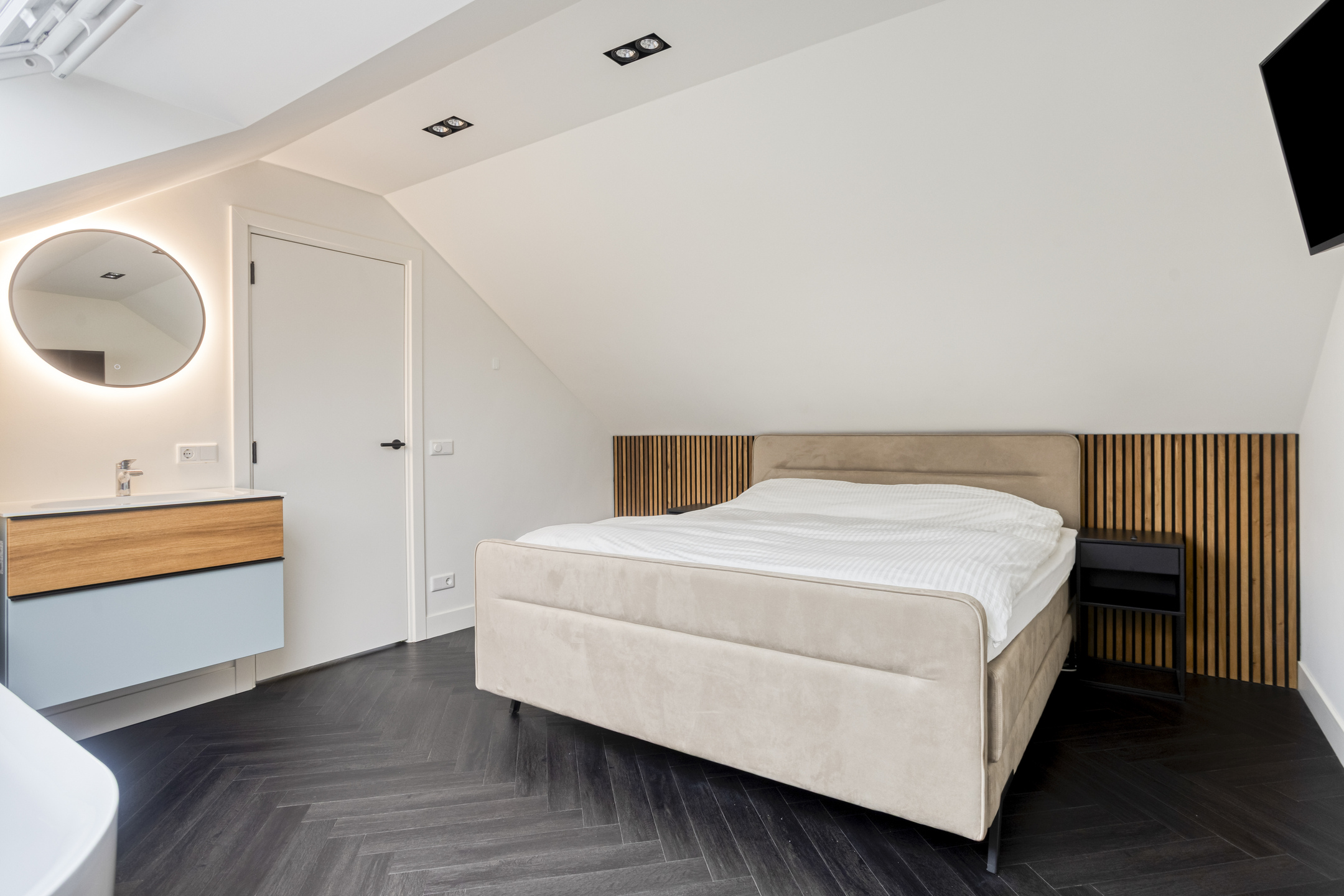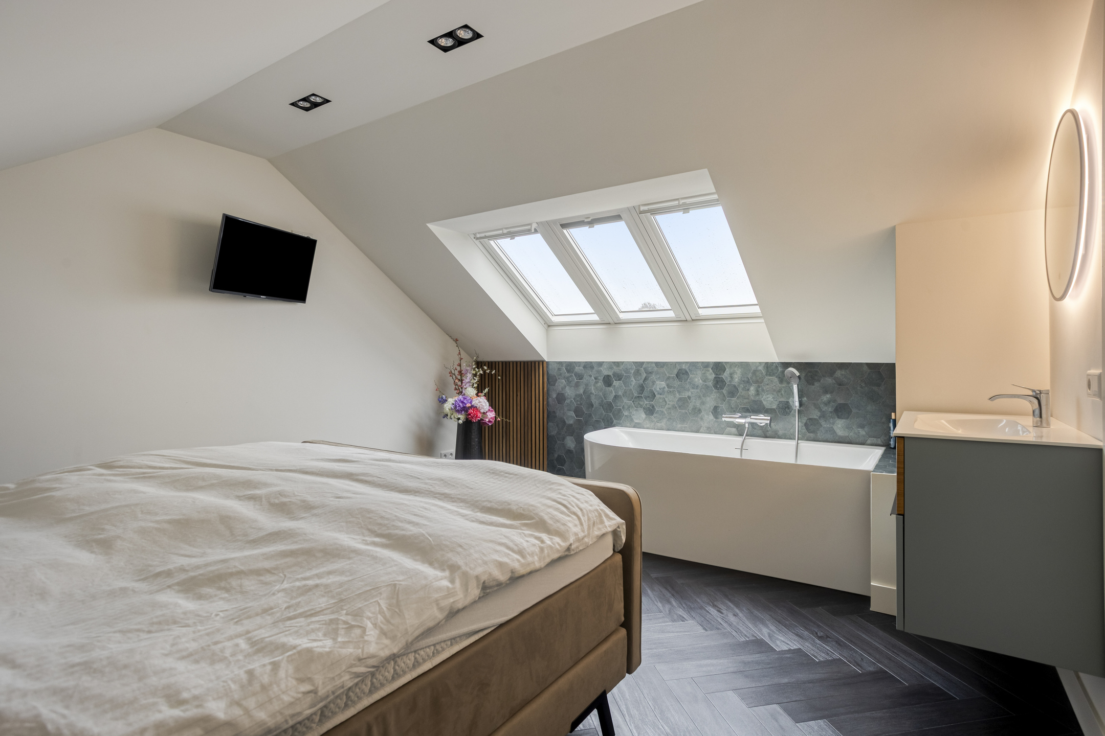 Slaapkamer IV is afgewerkt met een pvc visgraat vloer en voorzien van een 3-tal kunststof dakvensters. Tevens bevindt zich hier een ligbad met thermostaatkraan en een wastafel in meubel met verwarmde en verlichte spiegel.