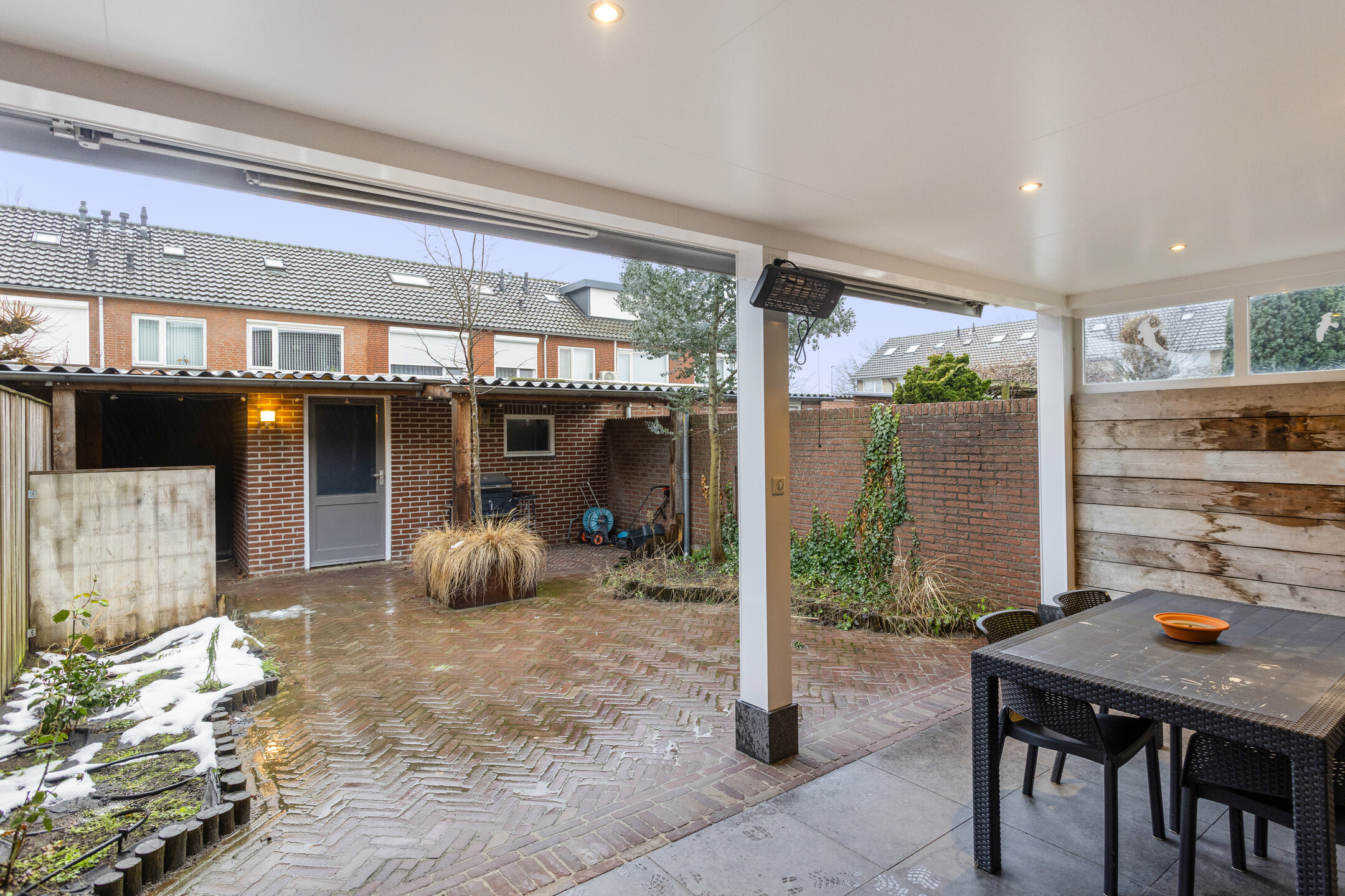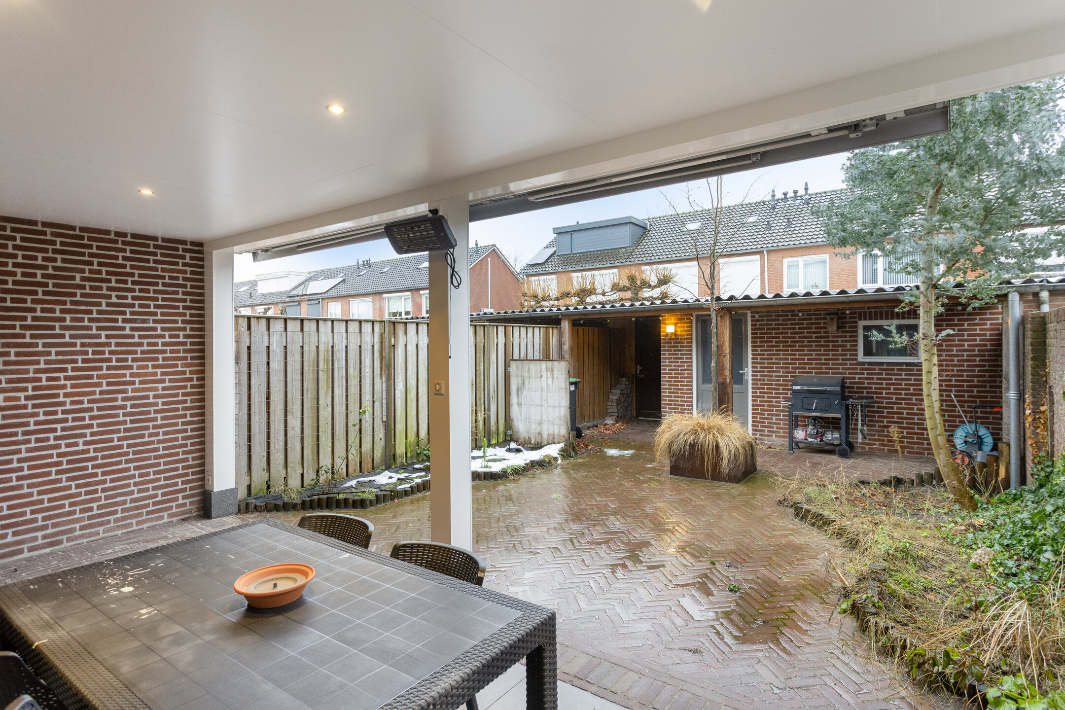 De onderhoudsvriendelijke achtertuin is voorzien van bestrating, beplanting en een overkapping met inbouw spots en heater aan de achtergevel. Achter in de tuin bevindt zich een stenen berging met aansluitend een 2e overkapping en een achterom uitkomend in het buurpad.