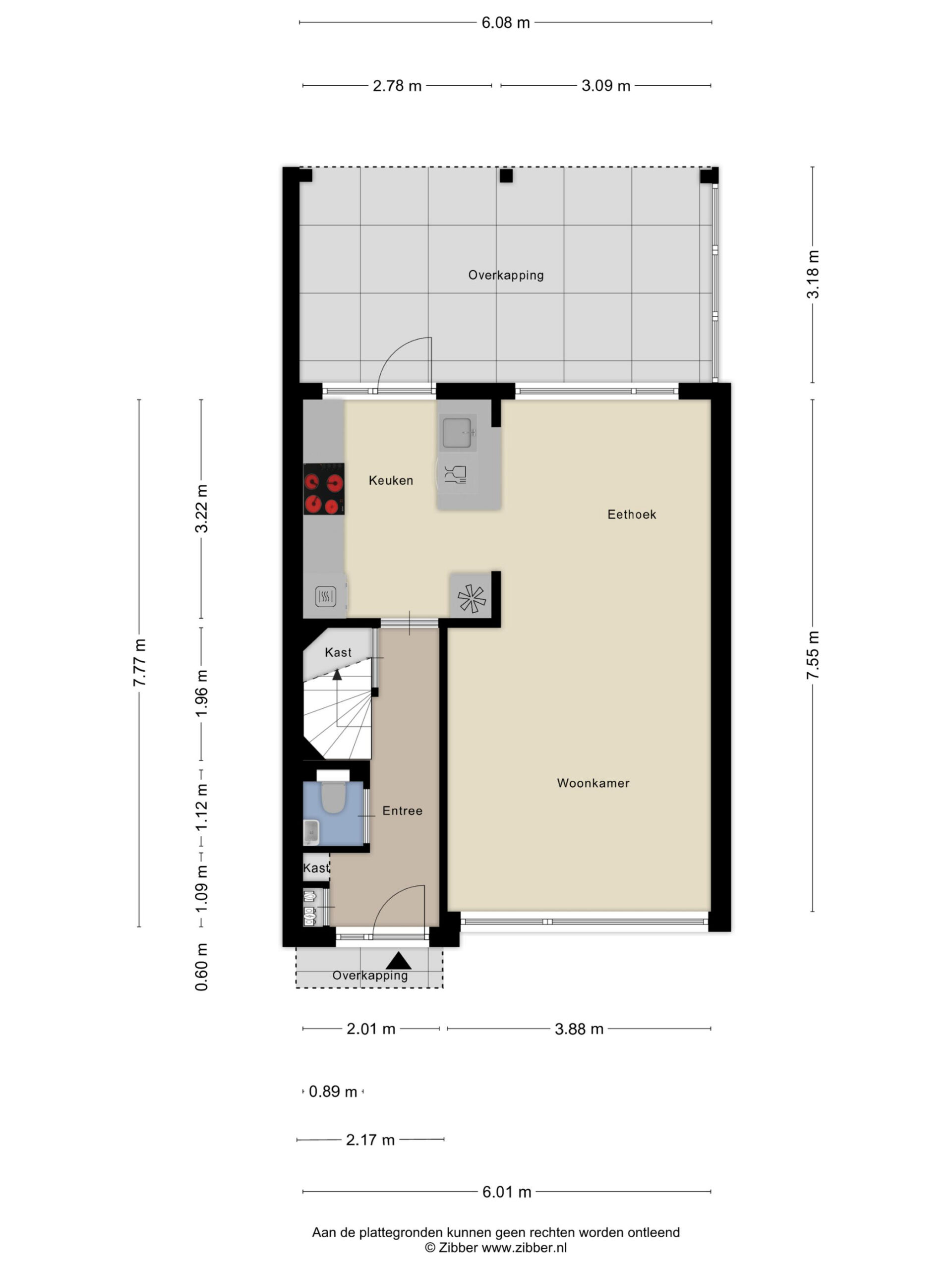 U komt via een overdekte entree de woning binnen in de hal. In de hal treft u de meterkast (8 groepen met 3 aardlekschakelaars en 1x krachtstroom), een praktische trapkast, de toiletruimte en de trapopgang naar de verdieping. De hal is afgewerkt met een pvc vloer die doorloopt over de gehele begane grond. Vanuit de hal is de woonkamer bereikbaar.