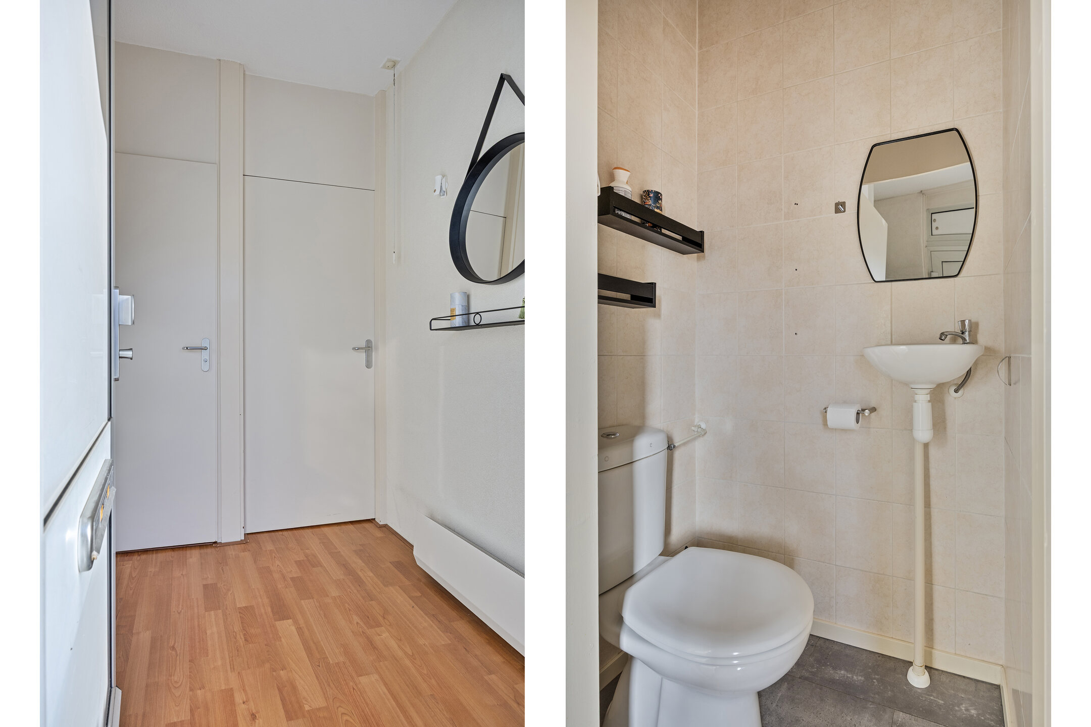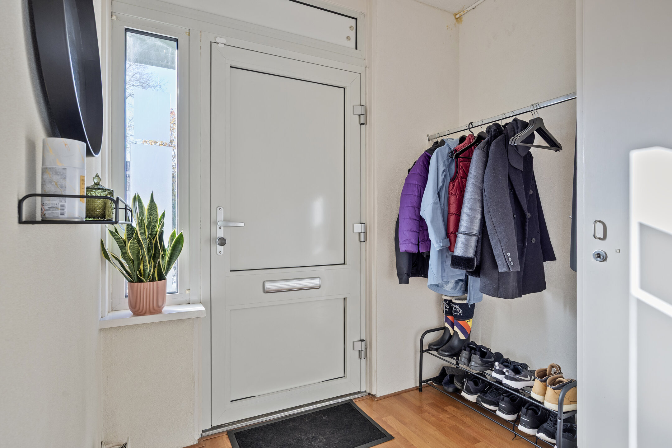 U komt via een overdekt entree binnen in de hal. In de hal treft u de meterkast (8 groepen met 2 aardlekschakelaars) en de toiletruimte. De hal is afgewerkt met een laminaatvloer en vanuit de hal is de woonkamer bereikbaar.