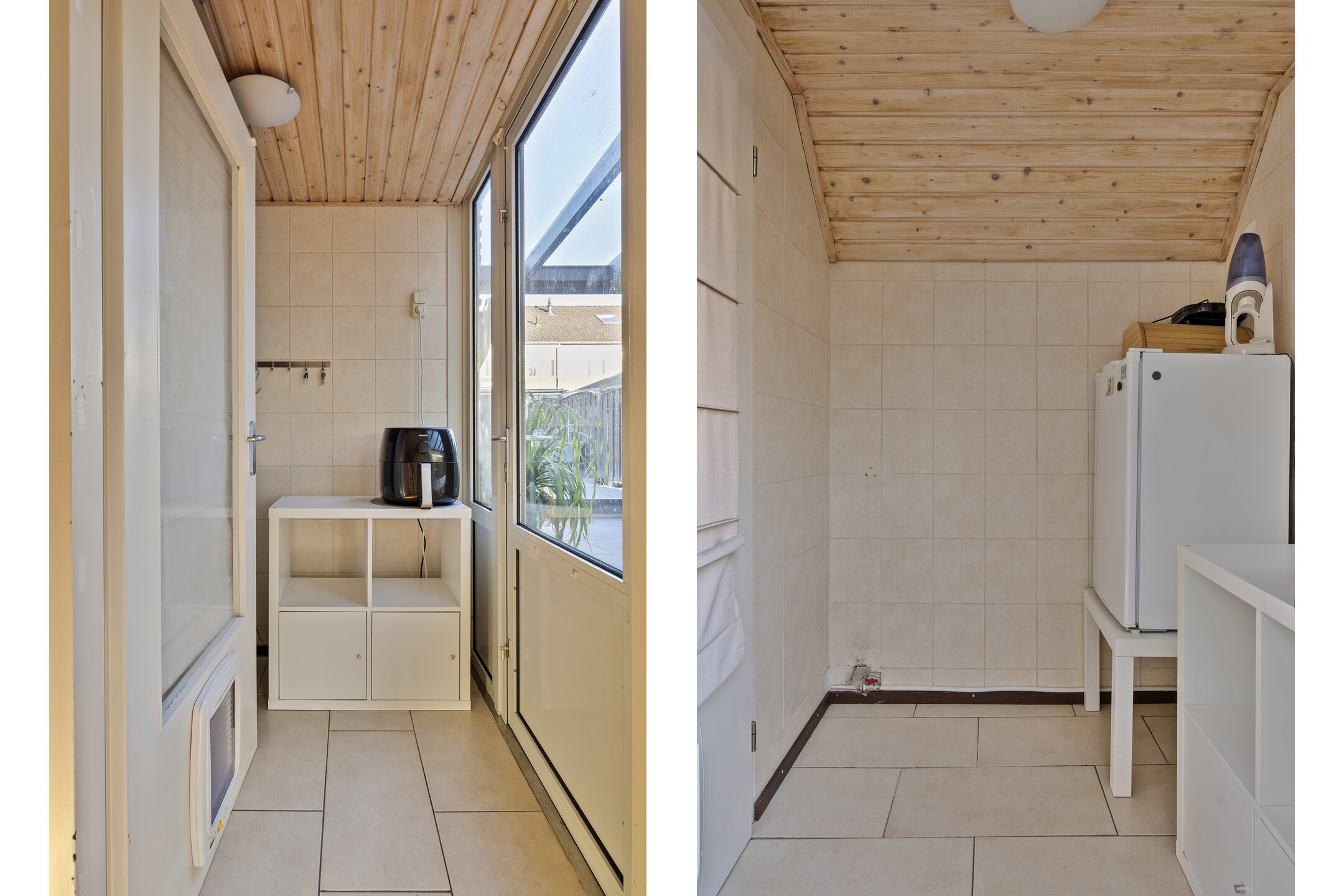 De bijkeuken is afgewerkt met een tegelvloer, betegelde wanden en houten schroten plafond. Vanuit de bijkeuken is de in 2022 geplaatste aluminium overkapping met glazen schuifpui en inbouw spots bereikbaar.