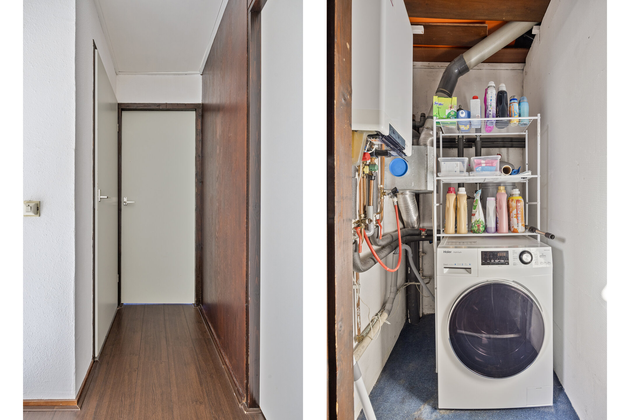 Hier bevinden zich de opstelling van de c.v.-combiketel, de unit mechanische ventilatie en de aansluitingen van de wasapparatuur.