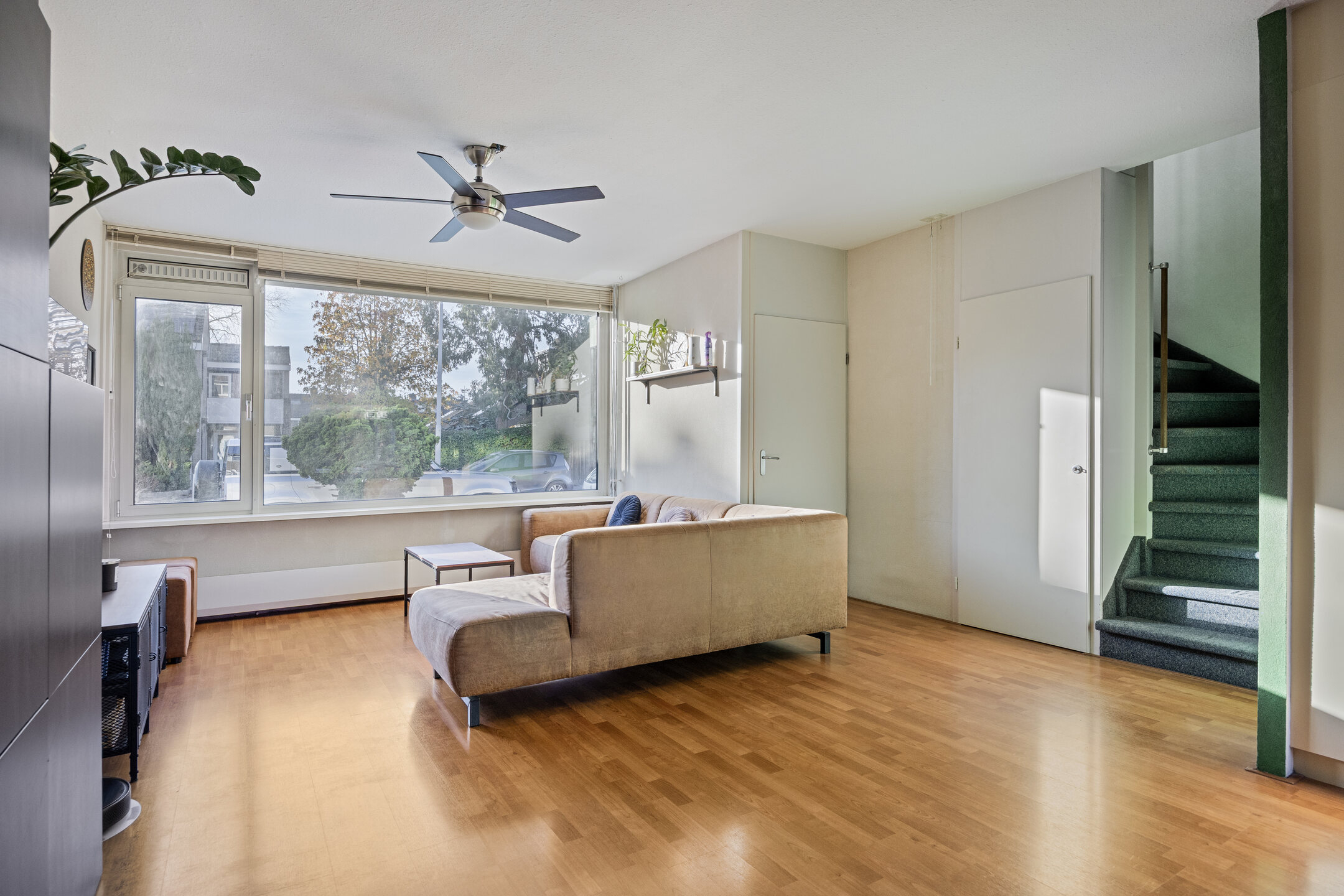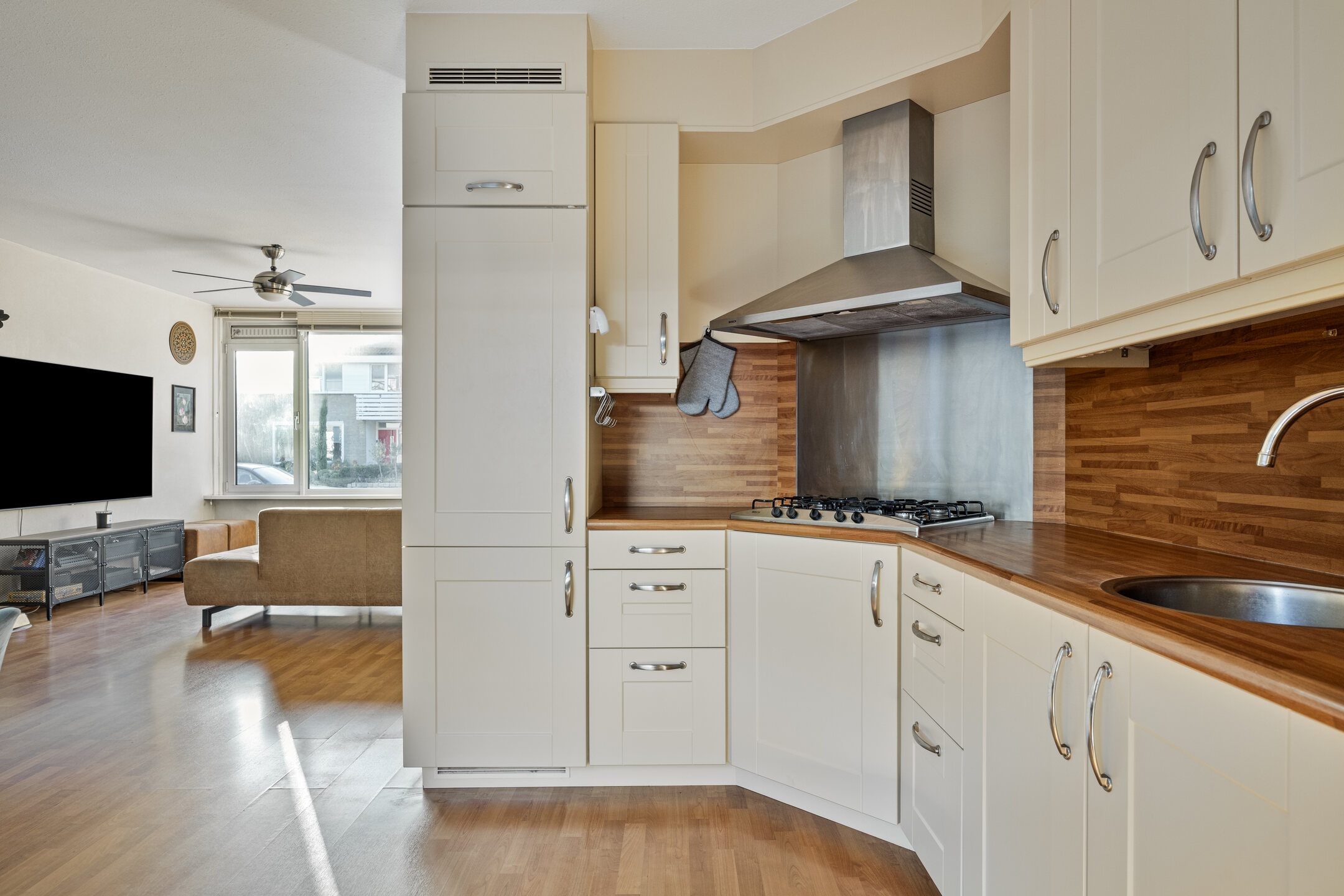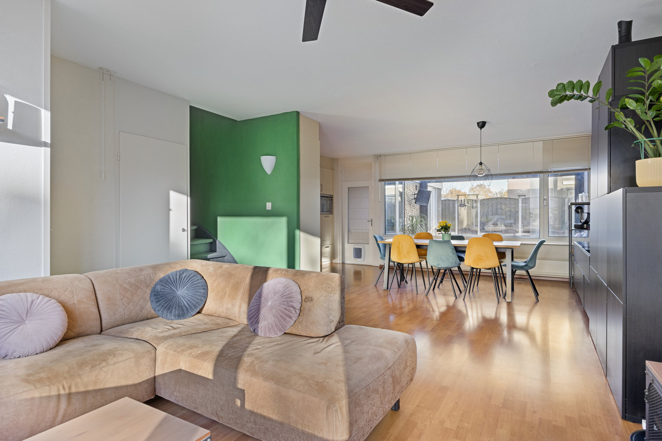 De woonkamer is opgedeeld in een zitgedeelte aan de voorzijde met een praktische trapkast en het eetgedeelte aan de achterzijde. Het eetgedeelte staat in open verbinding met de keuken en biedt toegang tot de bijkeuken. De woonkamer is afgewerkt met een laminaatvloer, spachtelputz wanden en spuitwerk plafond.