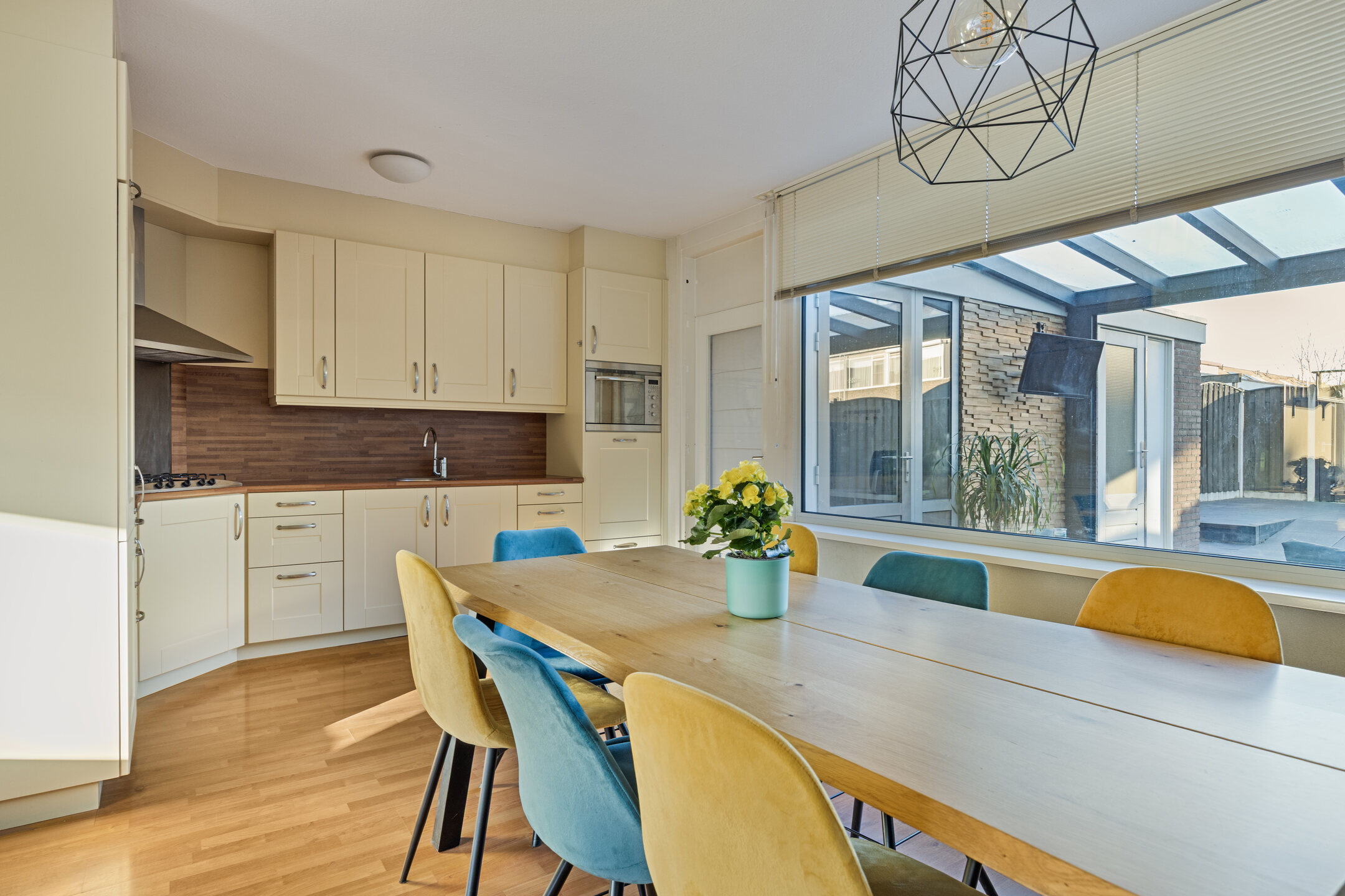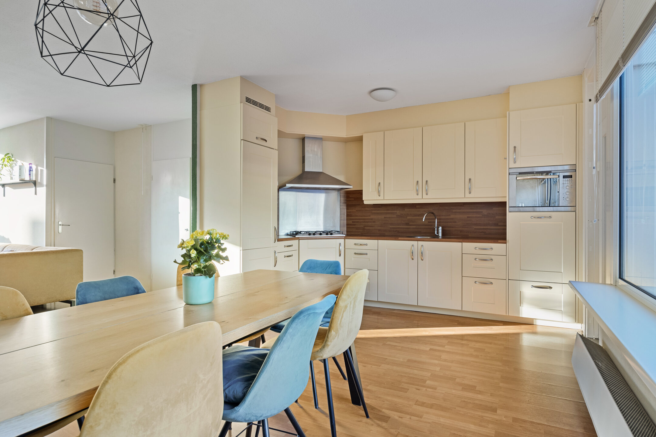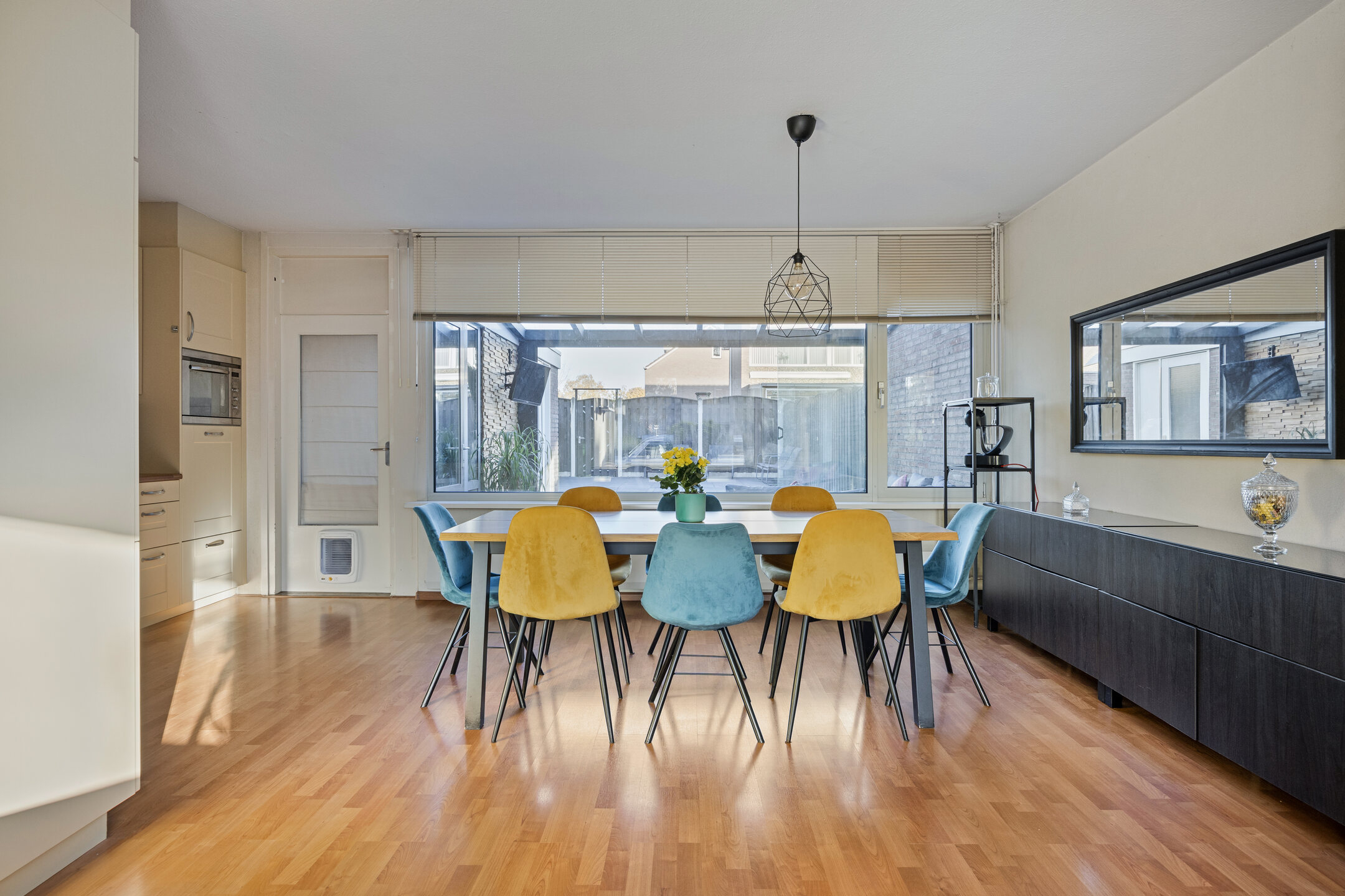 De woonkamer is opgedeeld in een zitgedeelte aan de voorzijde met een praktische trapkast en het eetgedeelte aan de achterzijde. Het eetgedeelte staat in open verbinding met de keuken en biedt toegang tot de bijkeuken. De woonkamer is afgewerkt met een laminaatvloer, spachtelputz wanden en spuitwerk plafond.