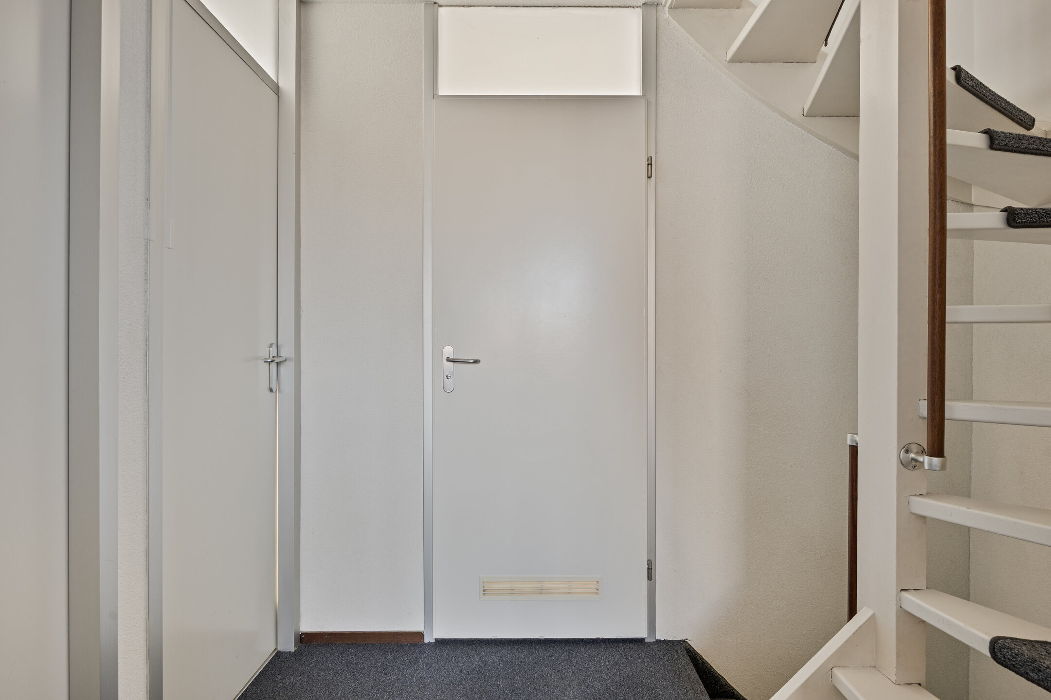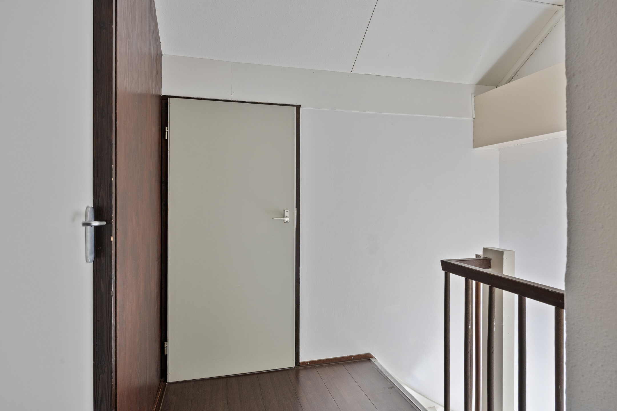 De overloop is afgewerkt met vloerbedekking en geeft toegang tot drie slaapkamers en de badkamer.