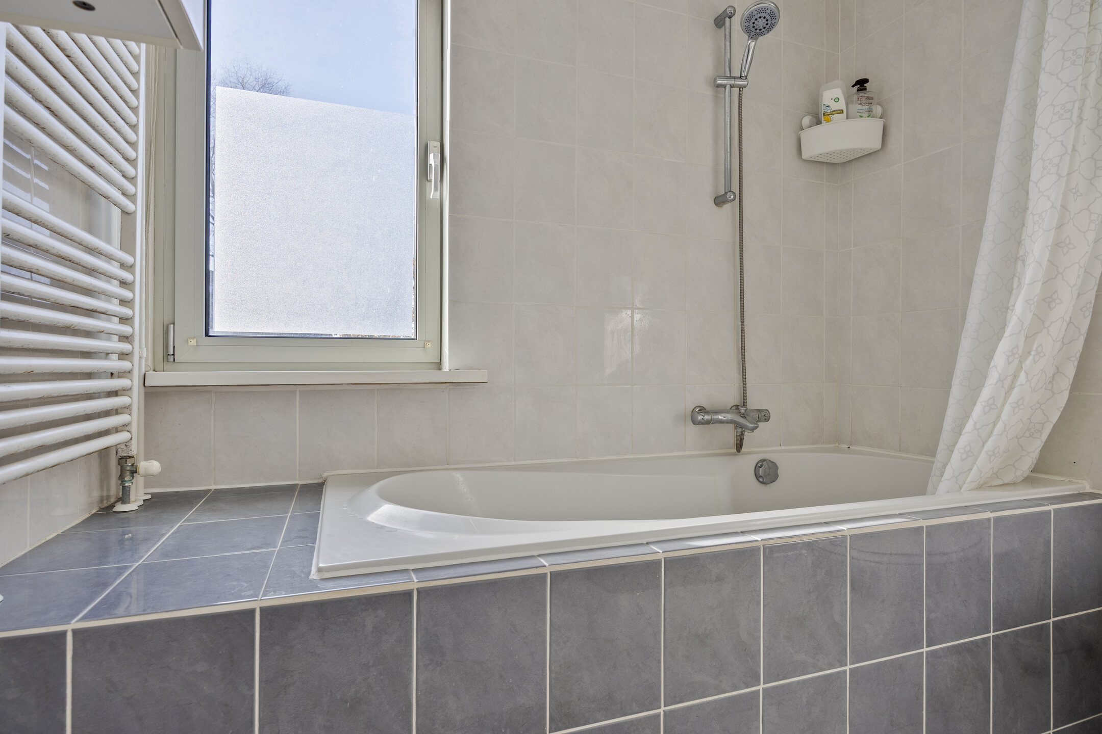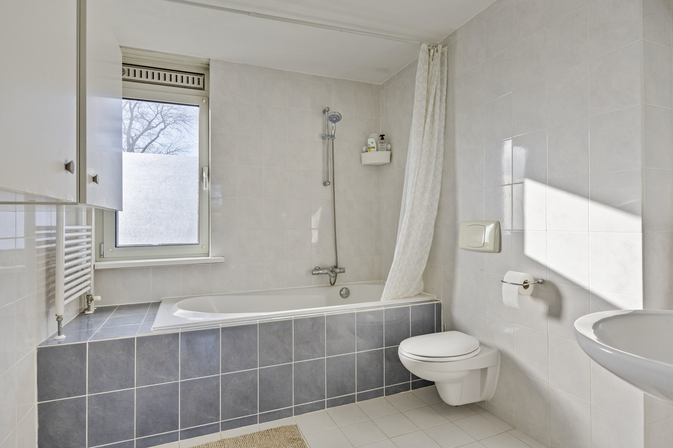 De badkamer is volledig betegeld en uitgerust met een ligbad met douchemogelijkheid en thermostaat, wastafel, wandcloset en design radiator.